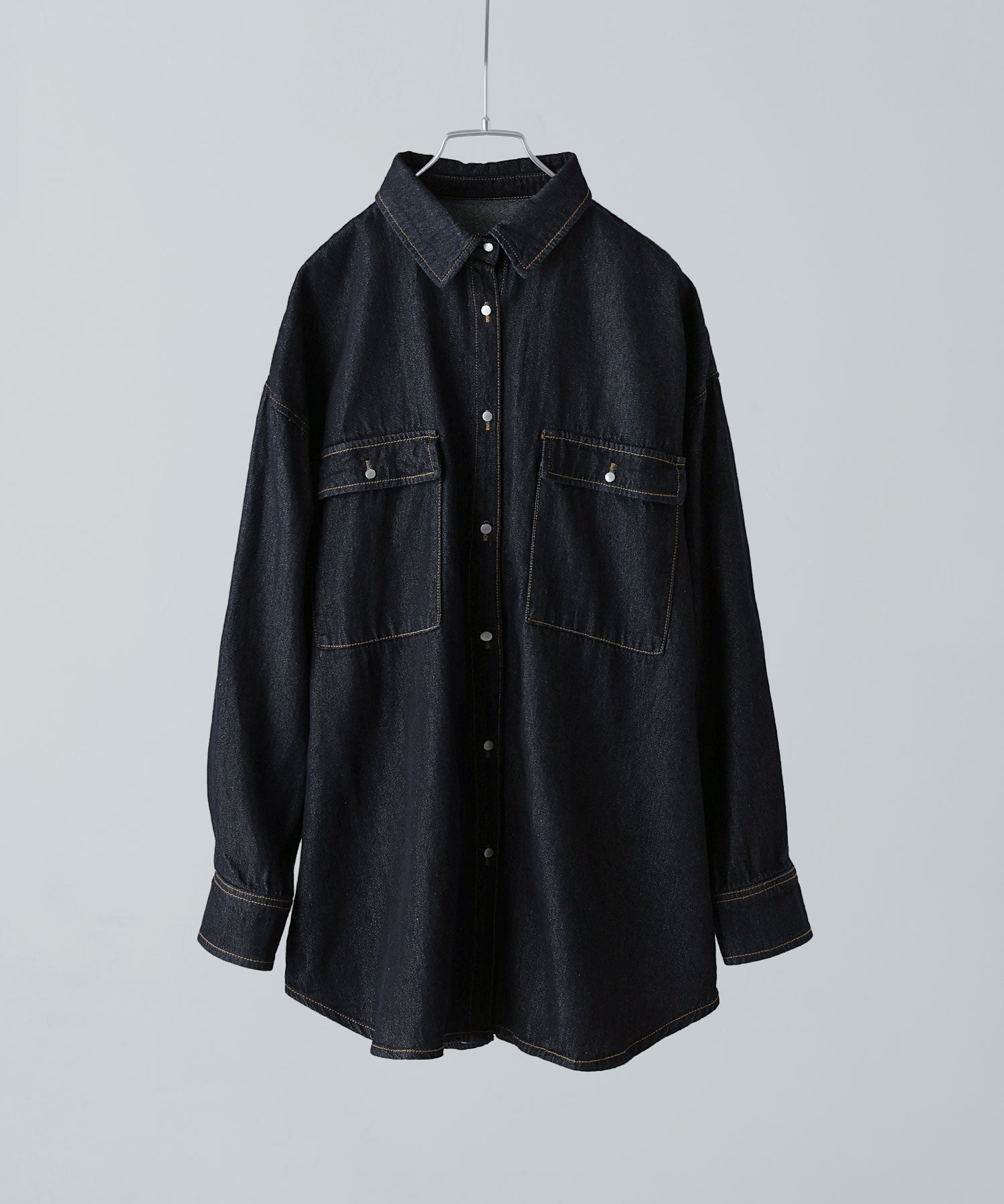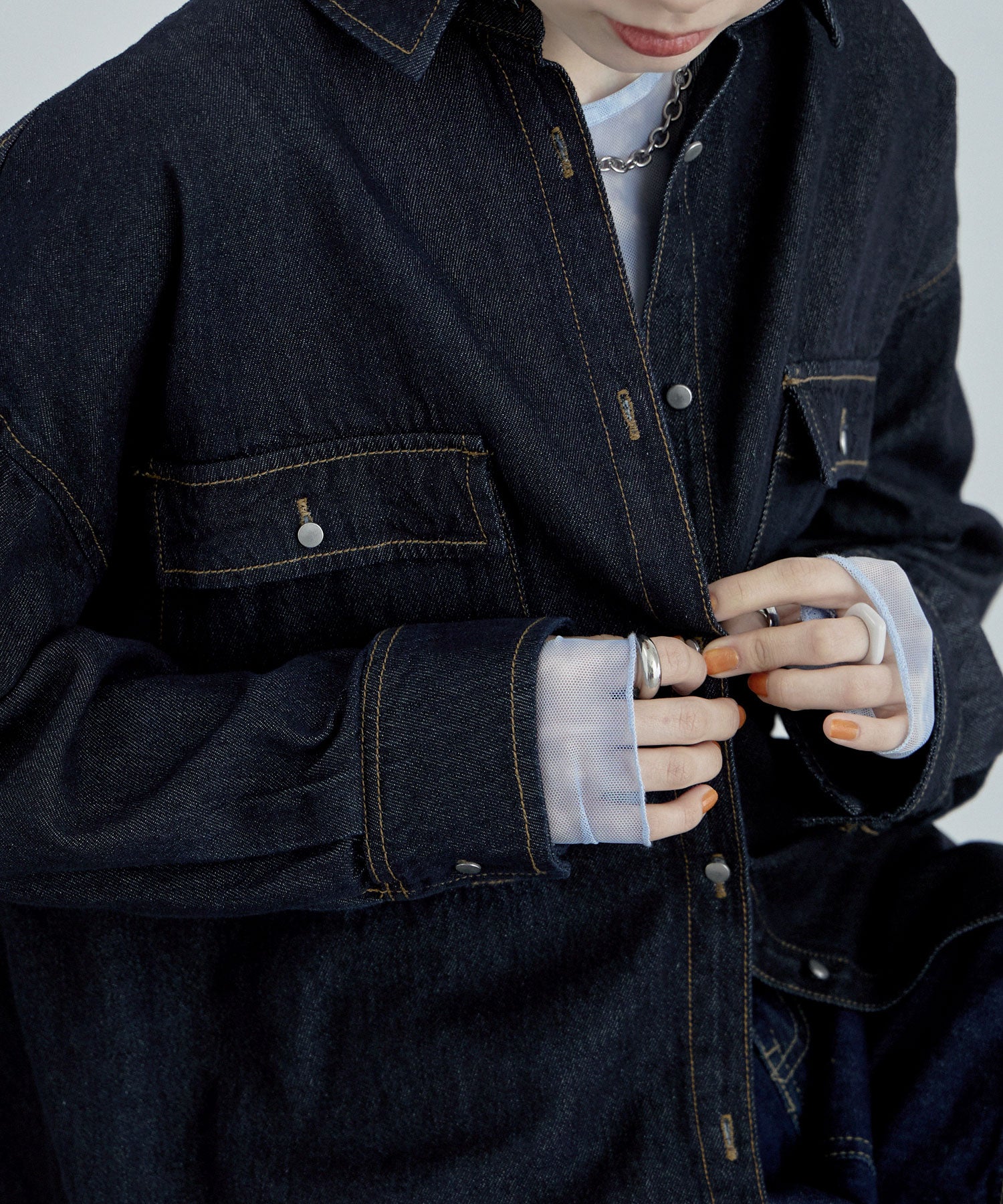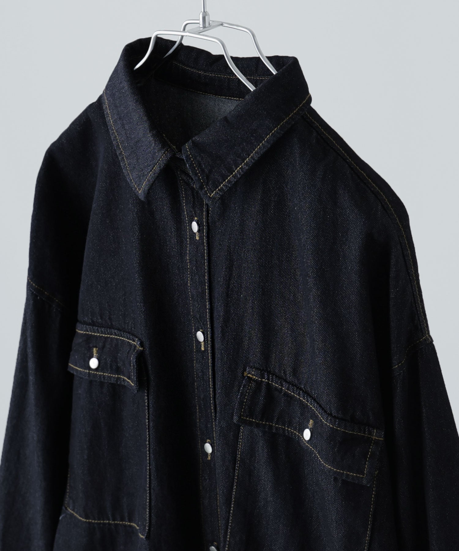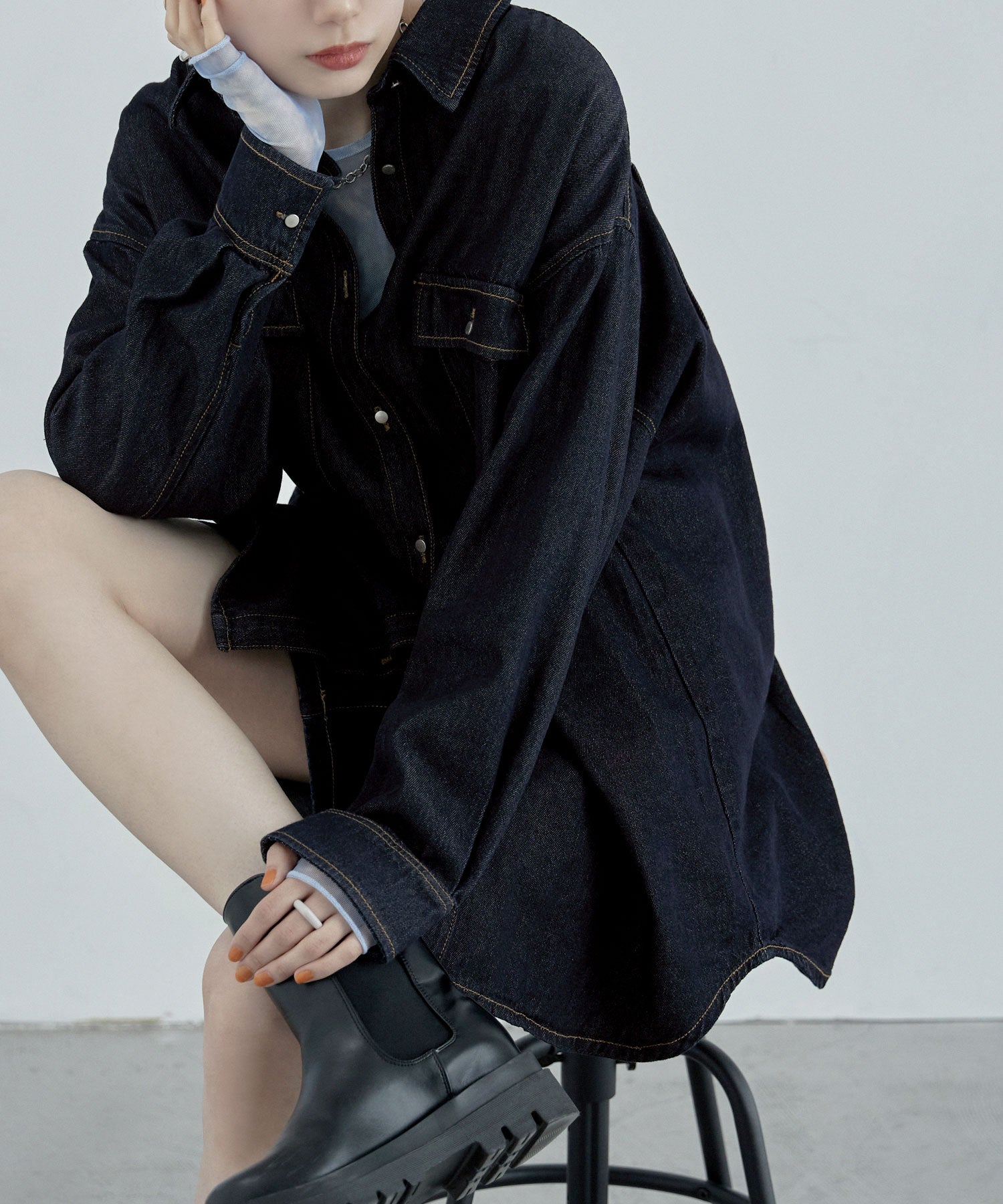 包み込むように大きな柔らかめのデニムで、シャツとしてコートの下にも合わせることもできて、もちろんジャケットとしてラクに羽織ることもできる。
