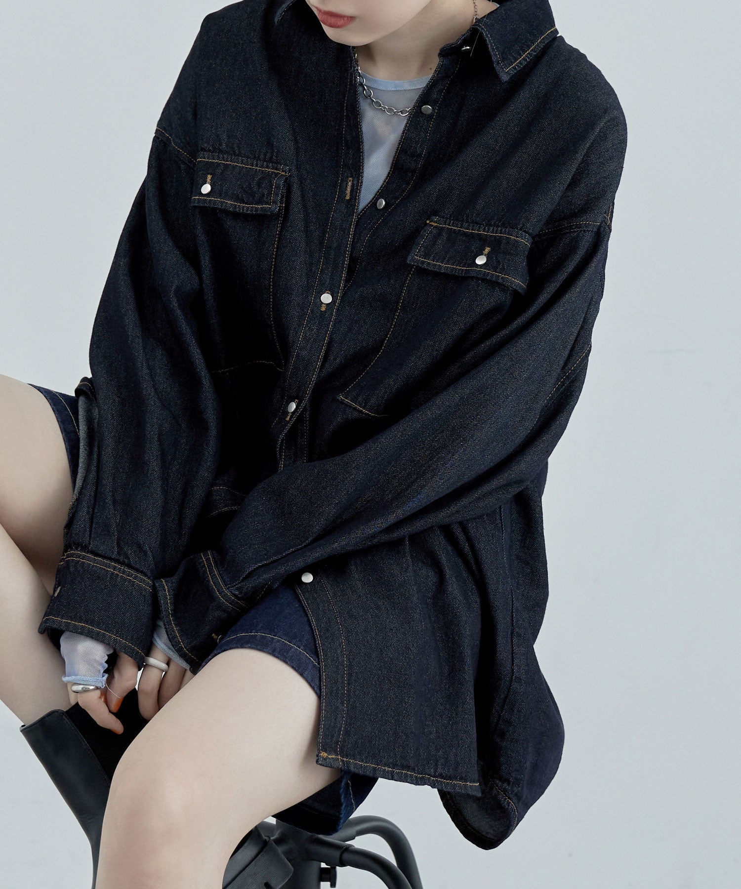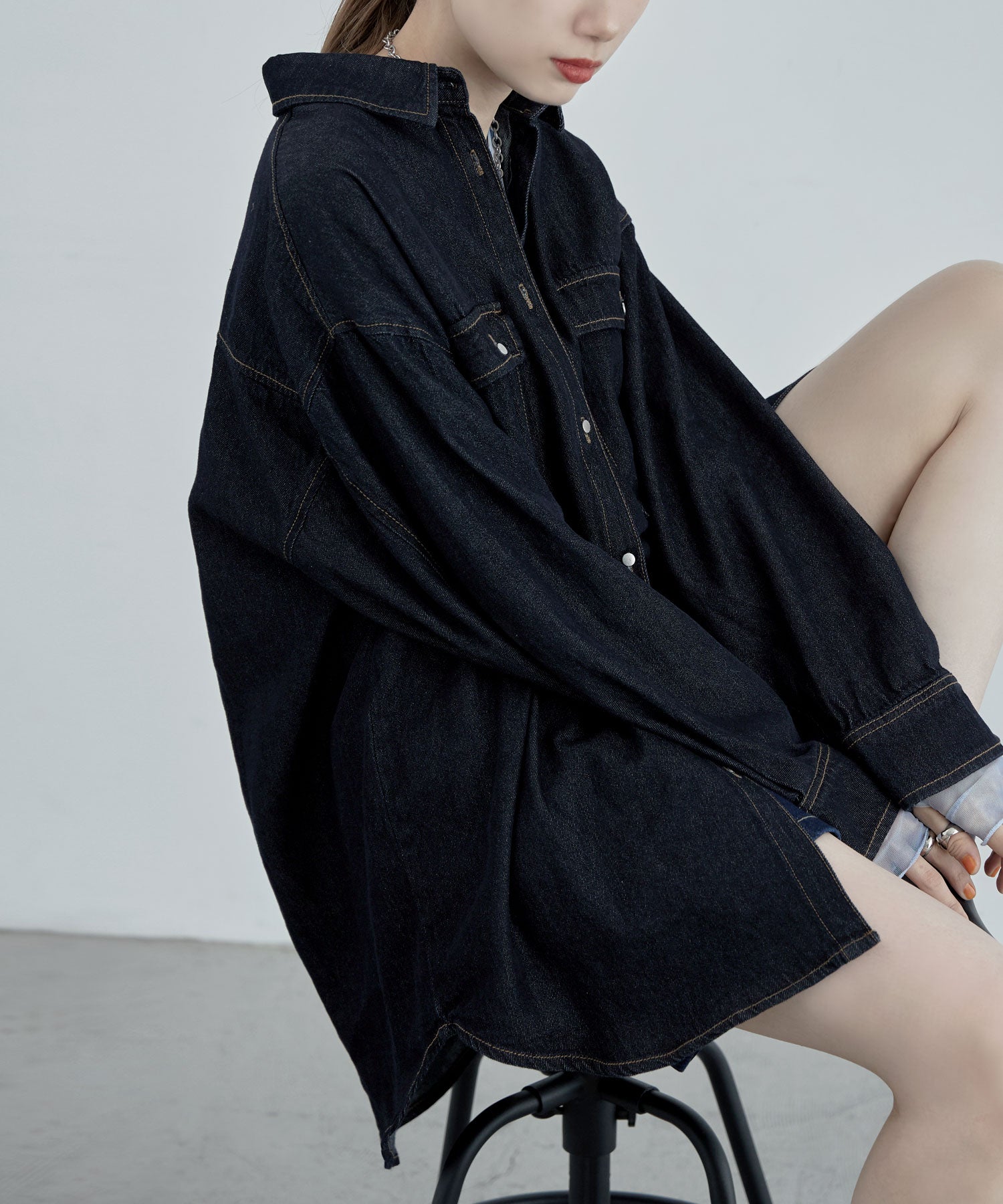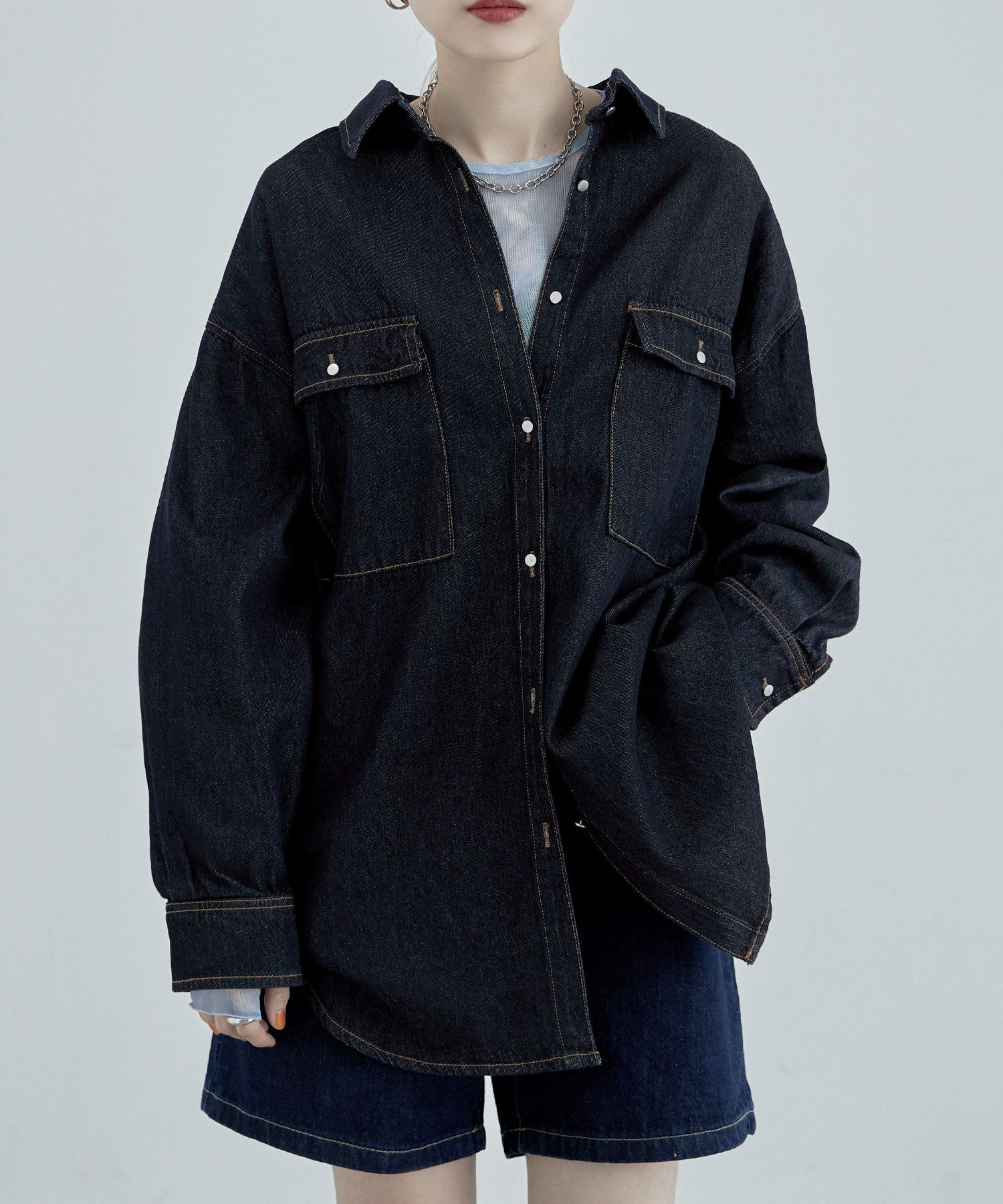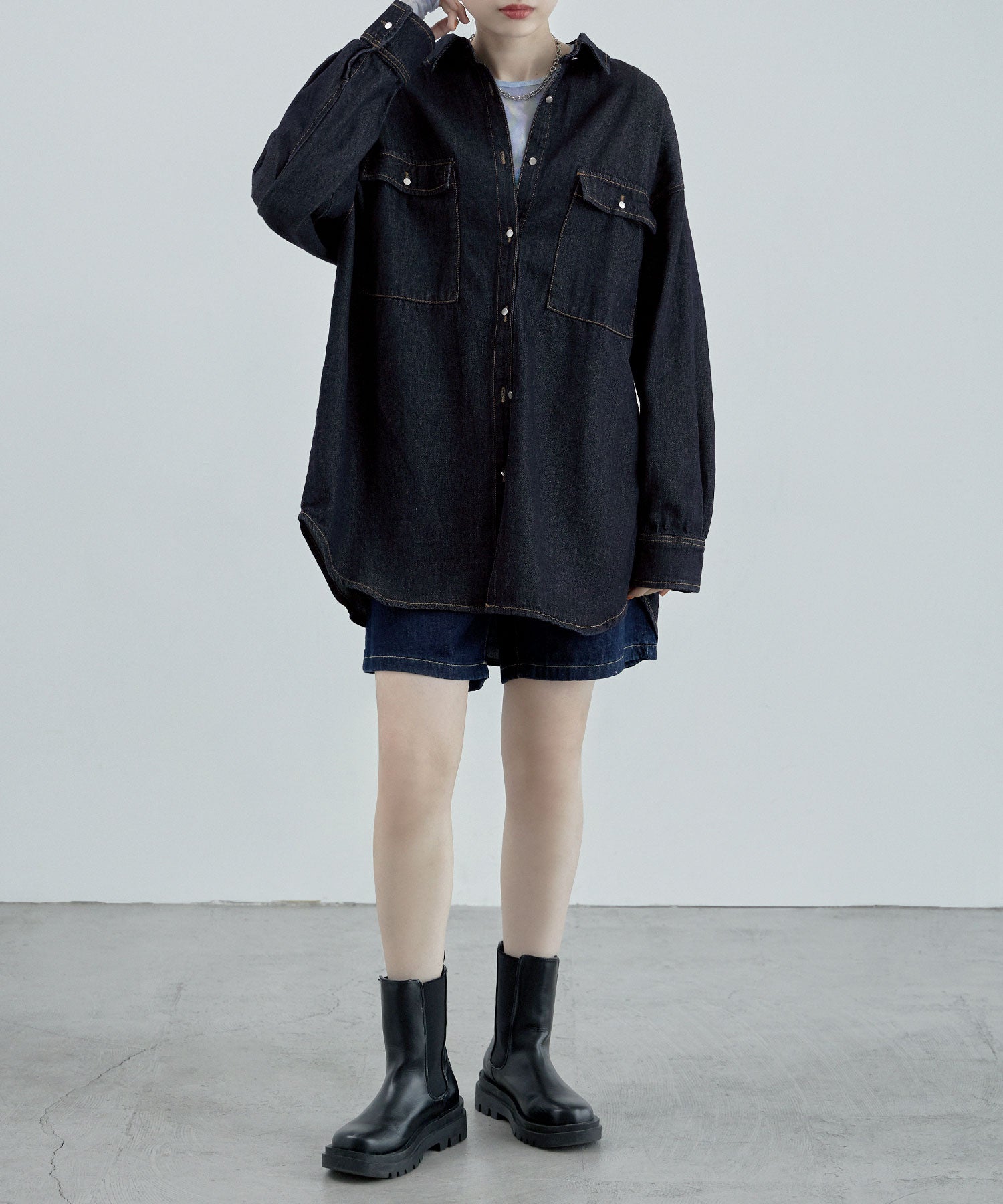 包み込むように大きな柔らかめのデニムで、シャツとしてコートの下にも合わせることもできて、もちろんジャケットとしてラクに羽織ることもできる。