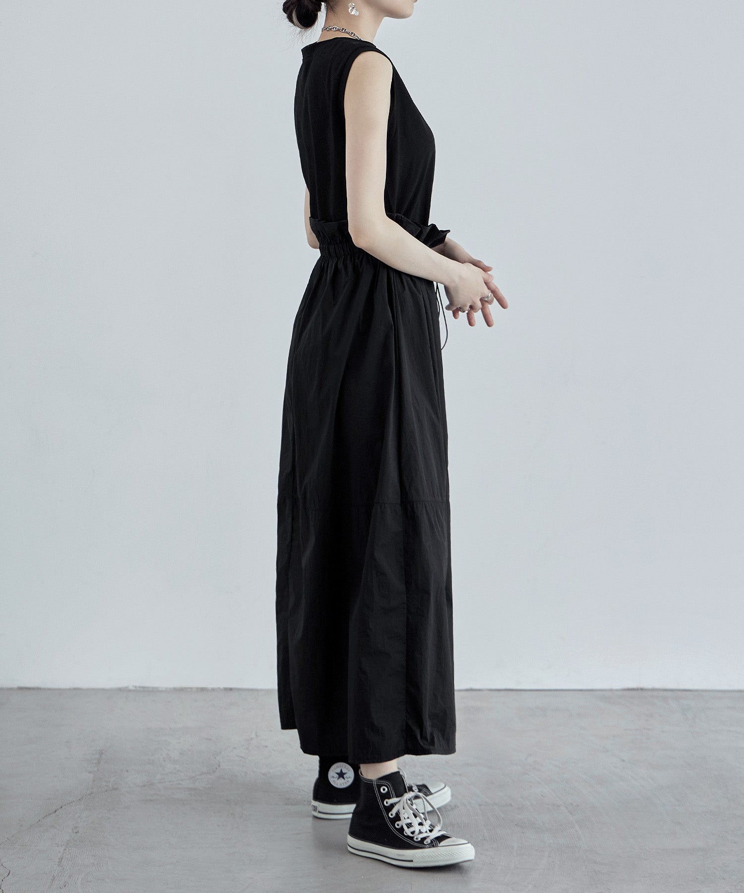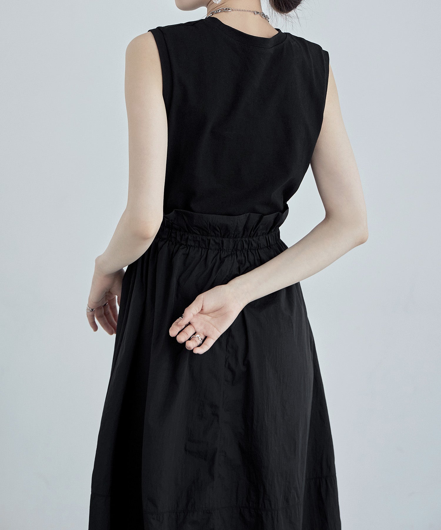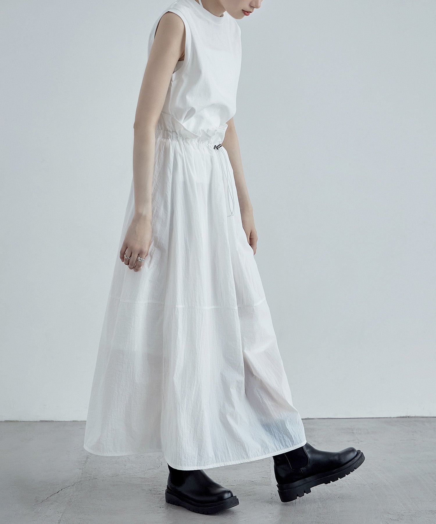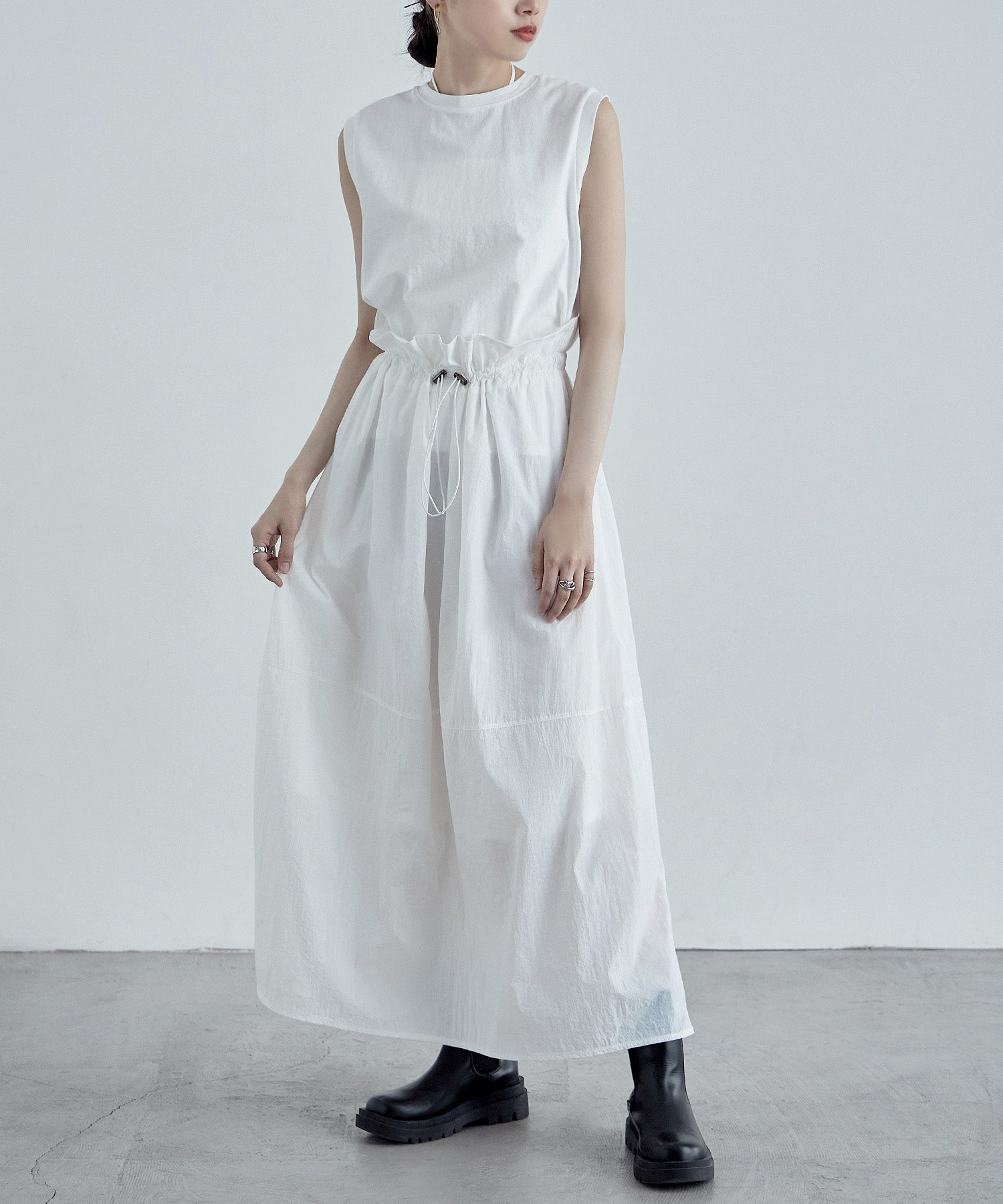 スリーブレスのカットソーと、ナチュラルワッシャーのかかったナイロンスカートがドッキング、