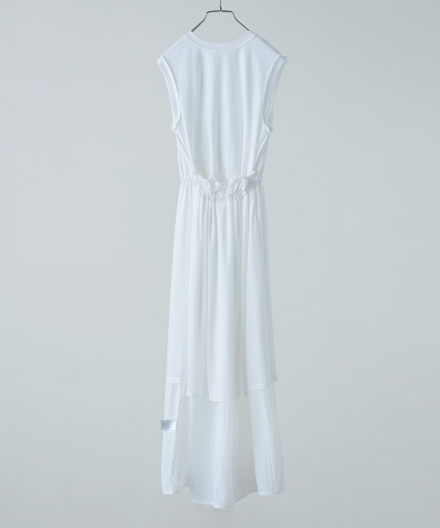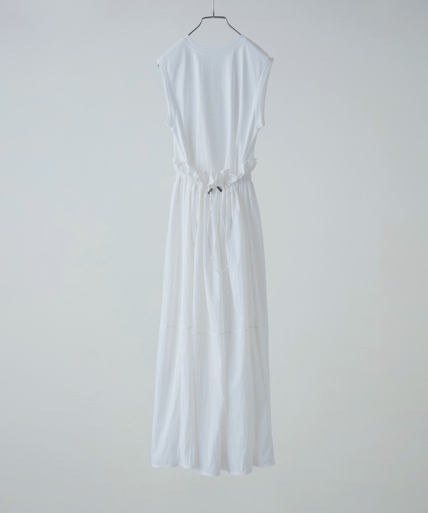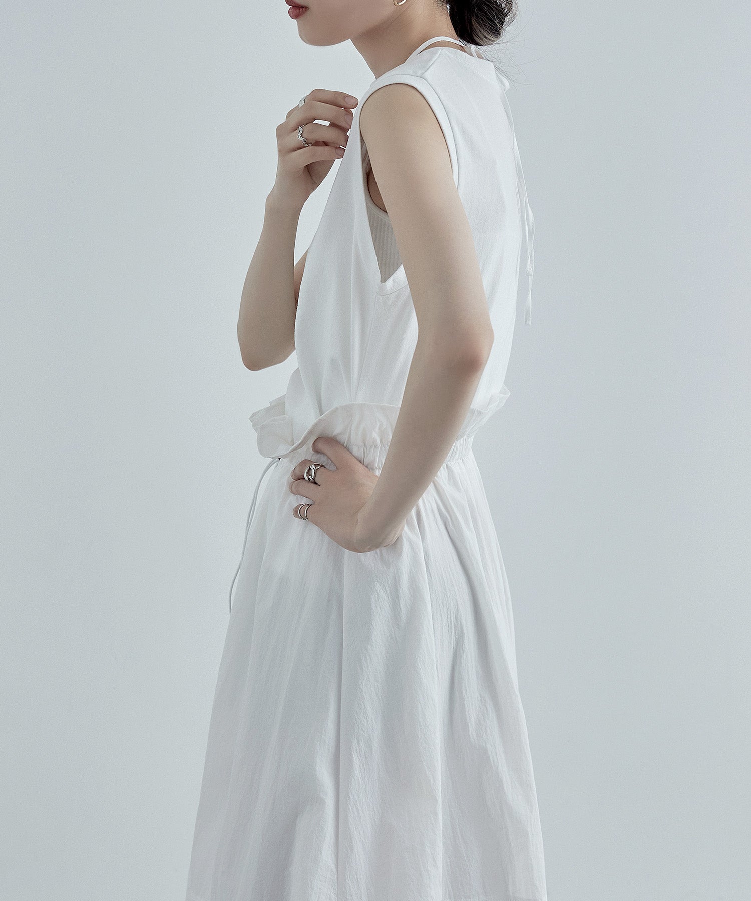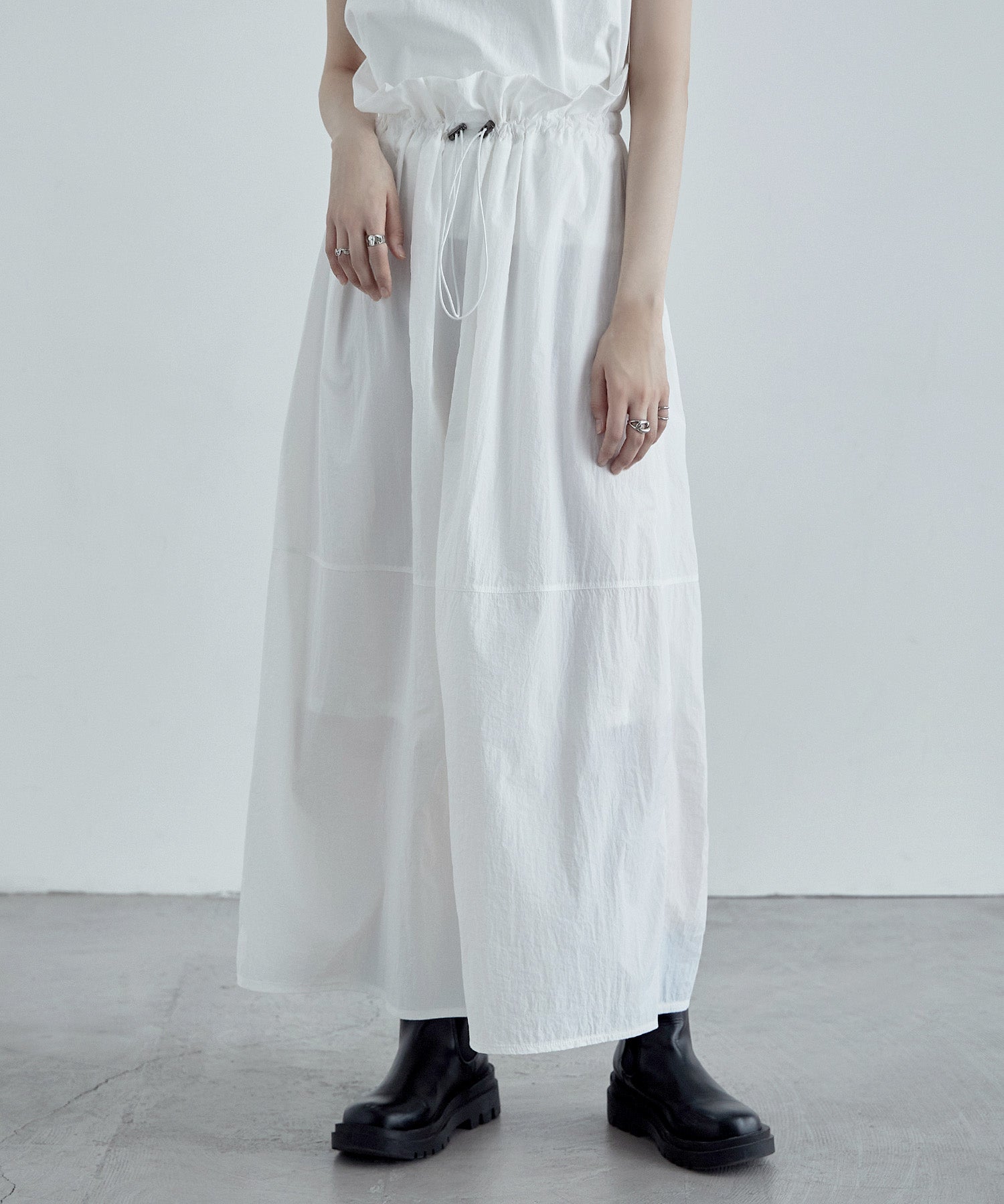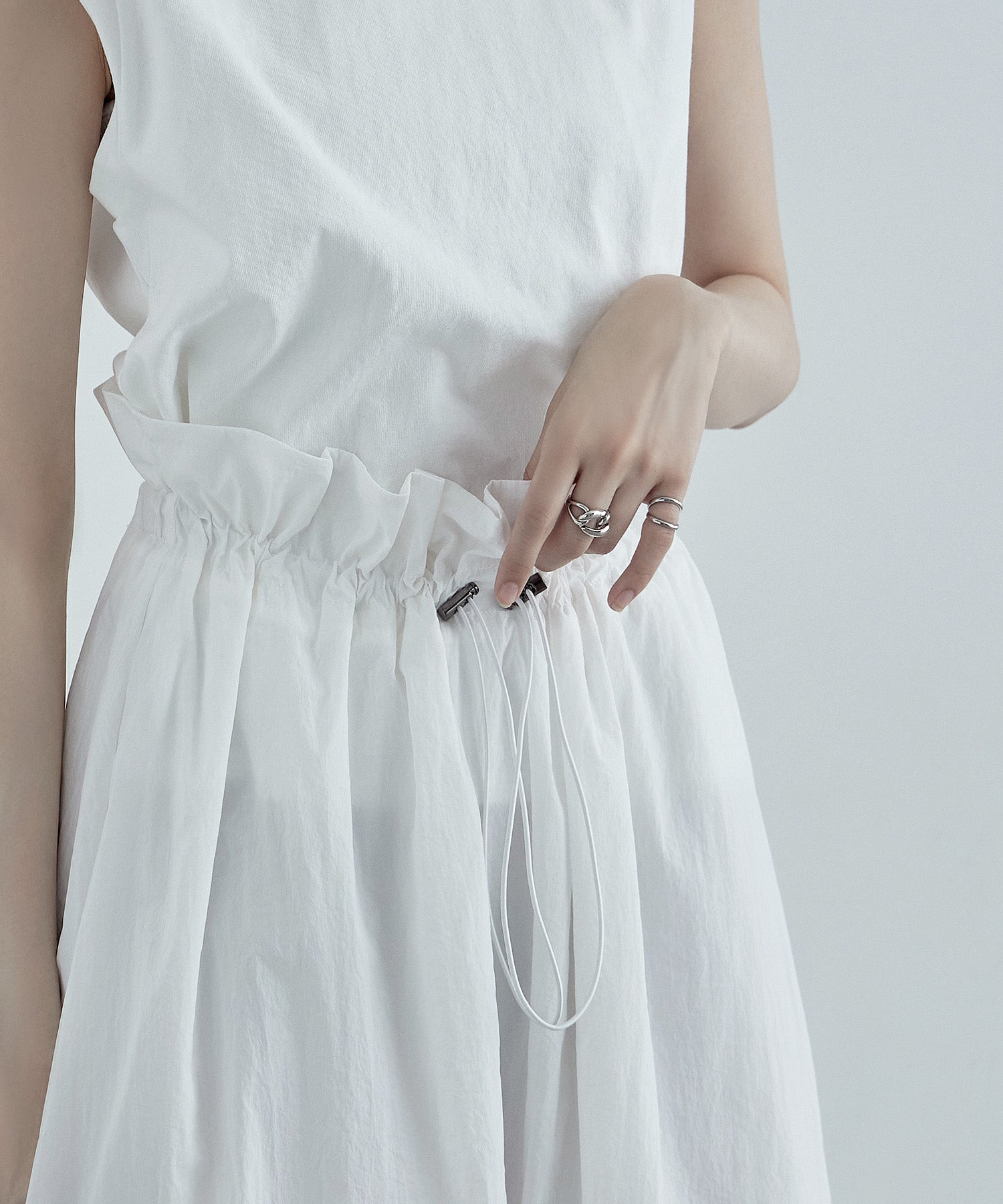 スリーブレスのカットソーと、ナチュラルワッシャーのかかったナイロンスカートがドッキング、
