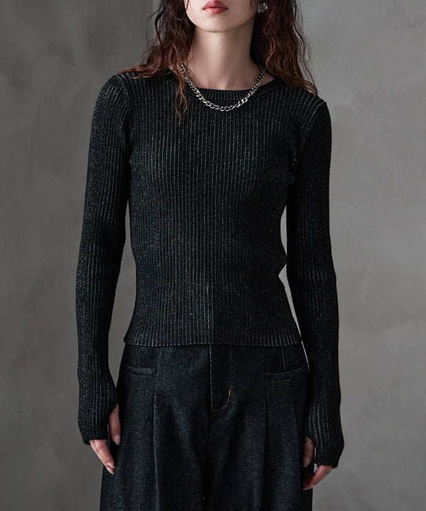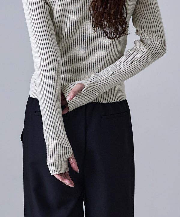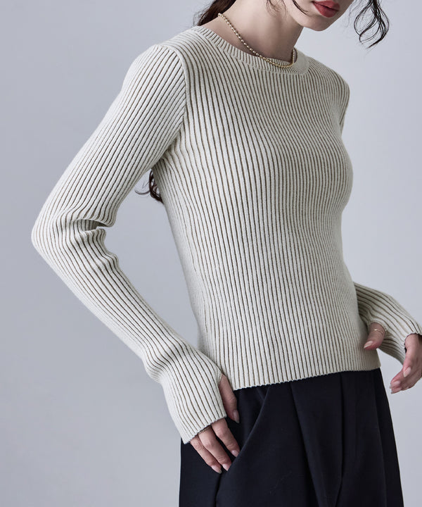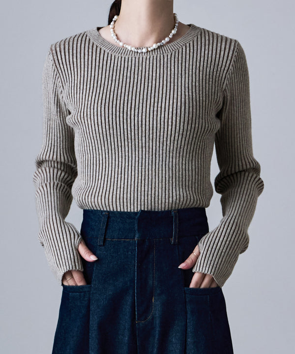 Rname コントラストサムホールリブニット トップス ニット セーター リブ タイト 長袖 クルーネック 丸首 インナー 重ね着 ショート丈 短丈 指穴 フィンガーホール サムホール 配色 バイカラー