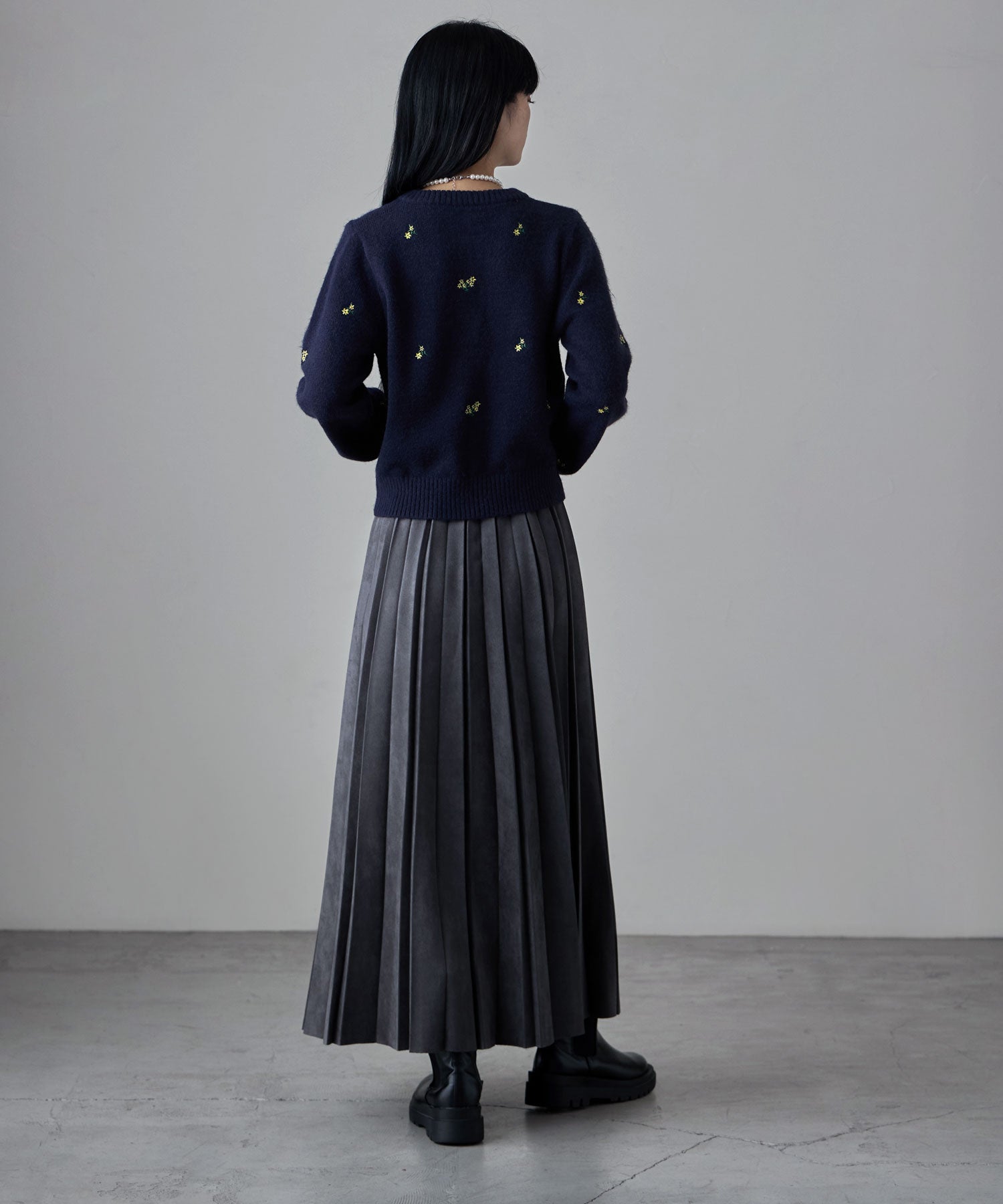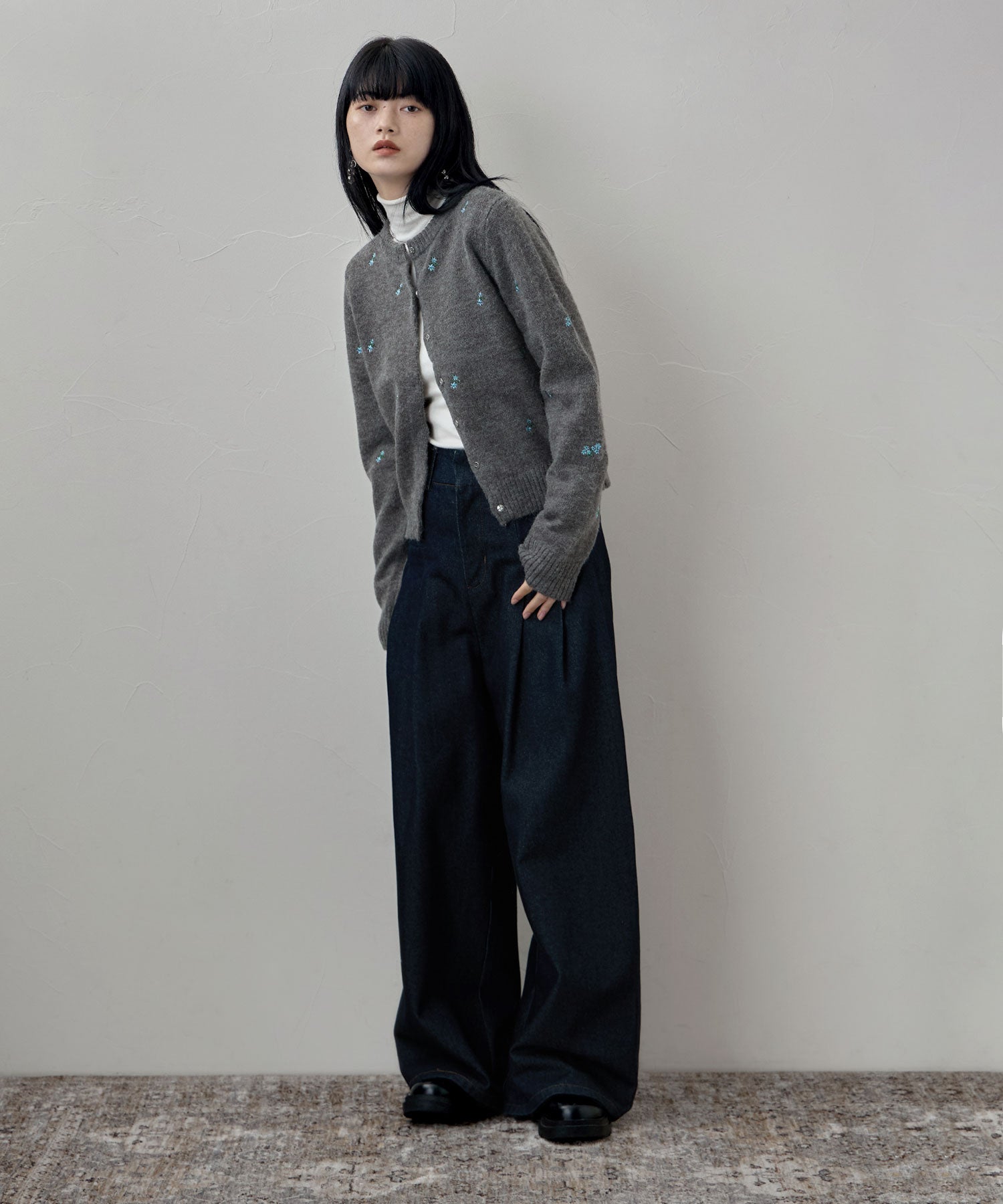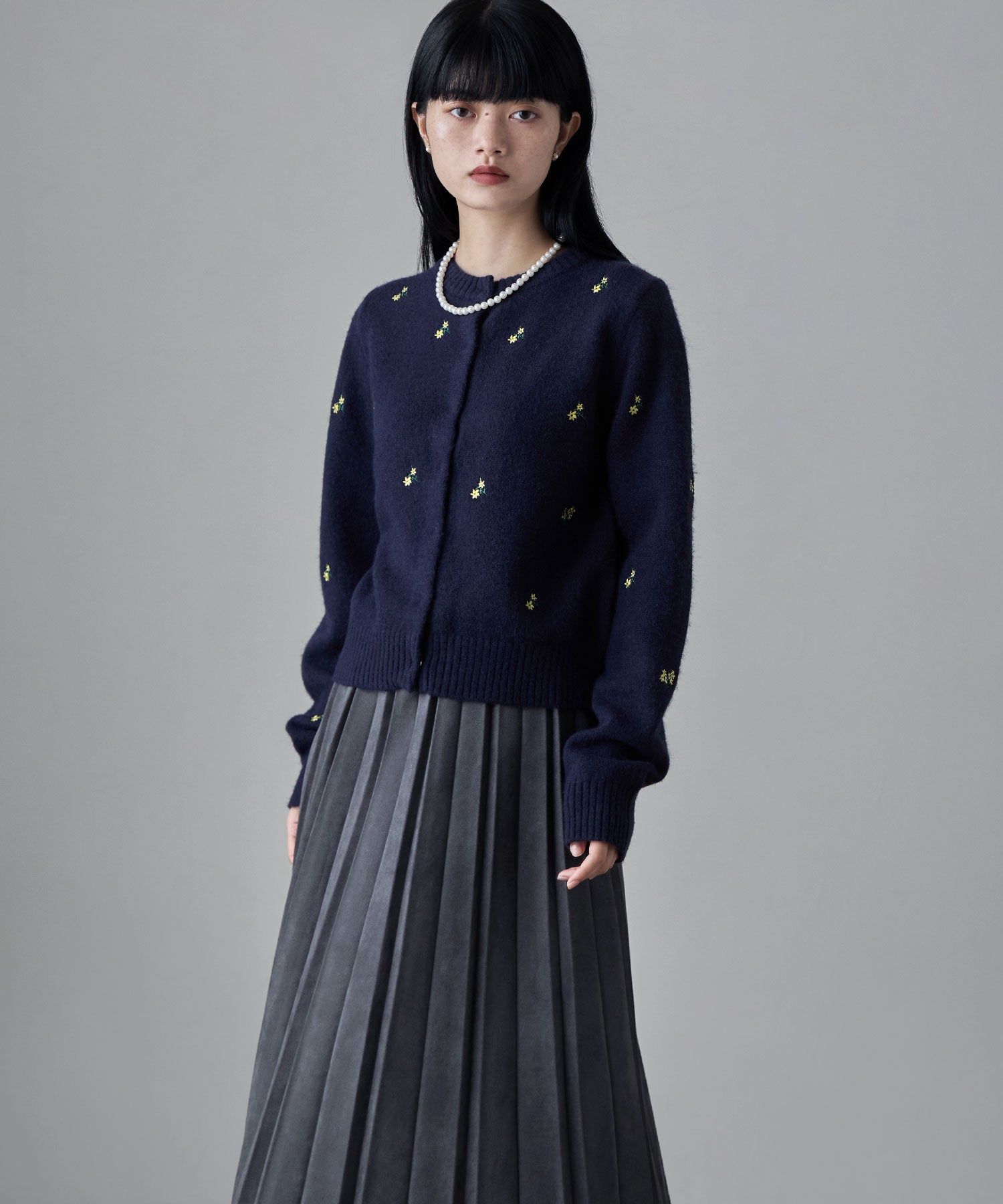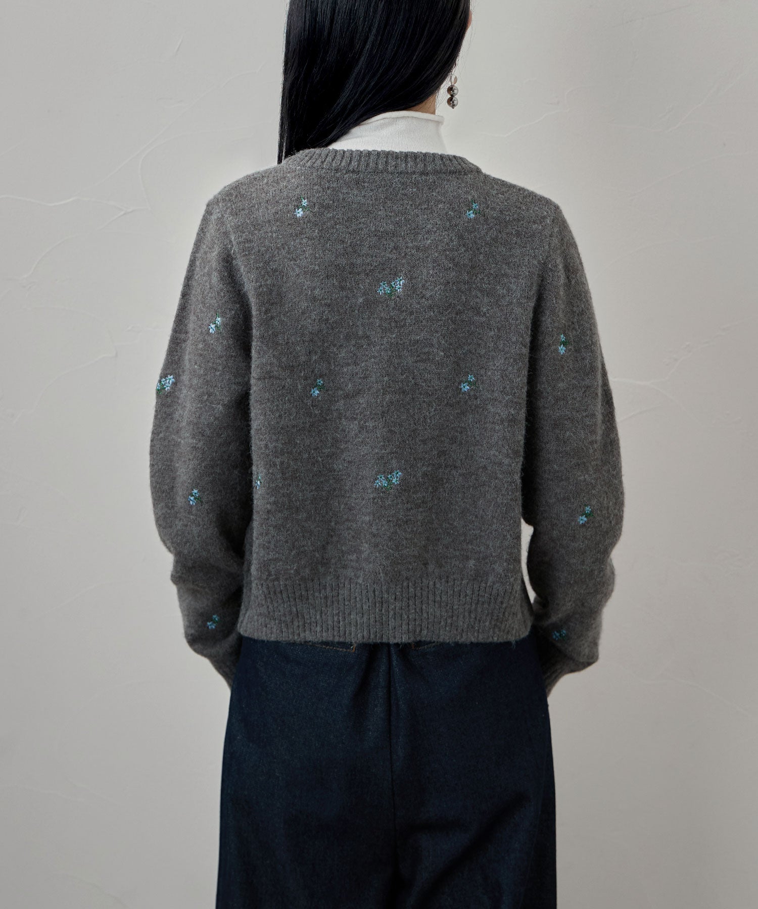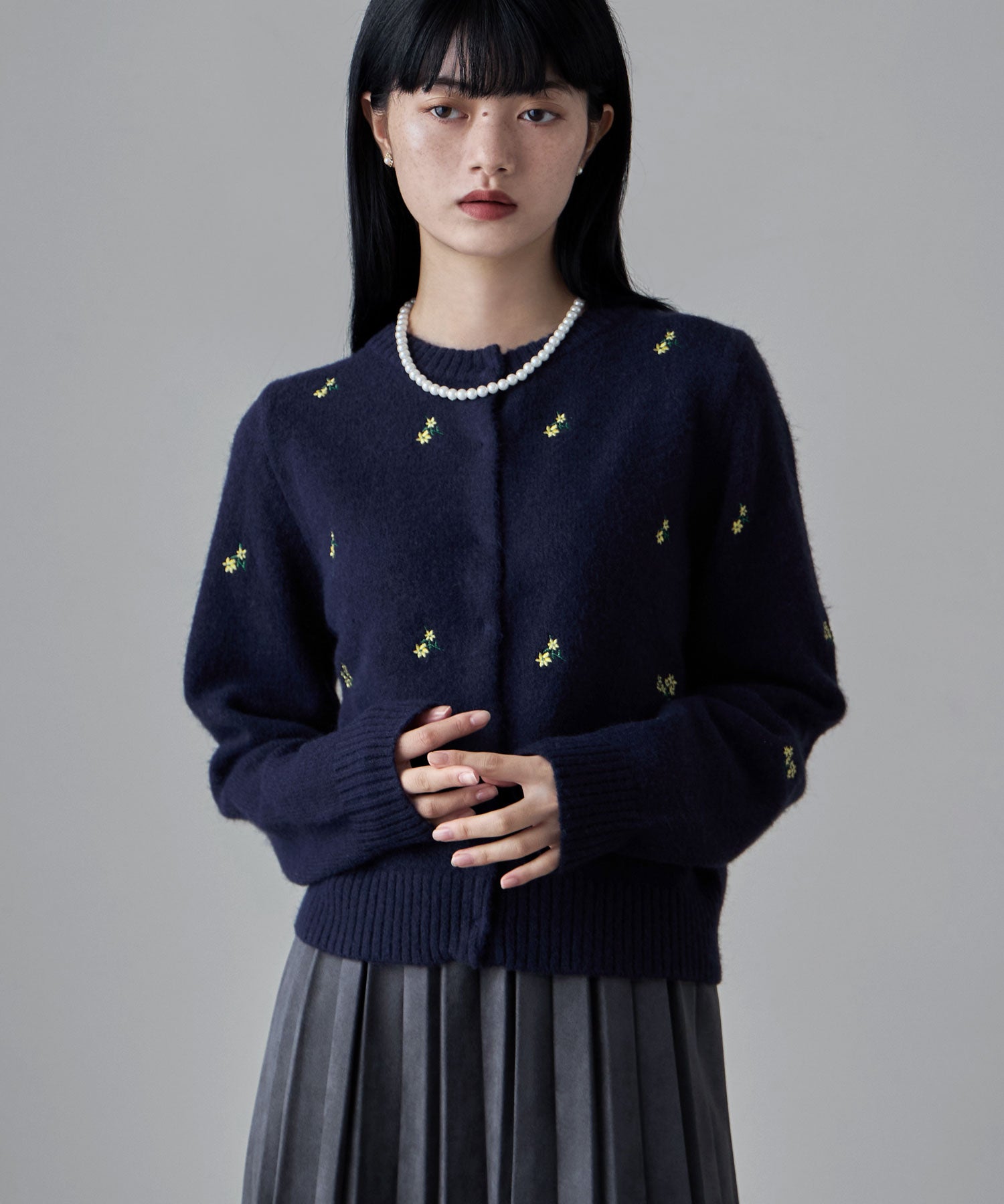 小花柄の色華やかな刺繍が愛らしい、アルパカタッチの柔らかなカーディガン。