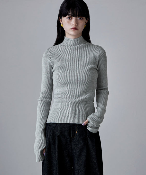 Rname サムホールハイネックリブニット トップス ニット セーター ハイネック タートルネック ボトルネック リブ タイト 長袖 杢 無地 伸縮性 インナー 重ね着 指穴 フィンガーホール