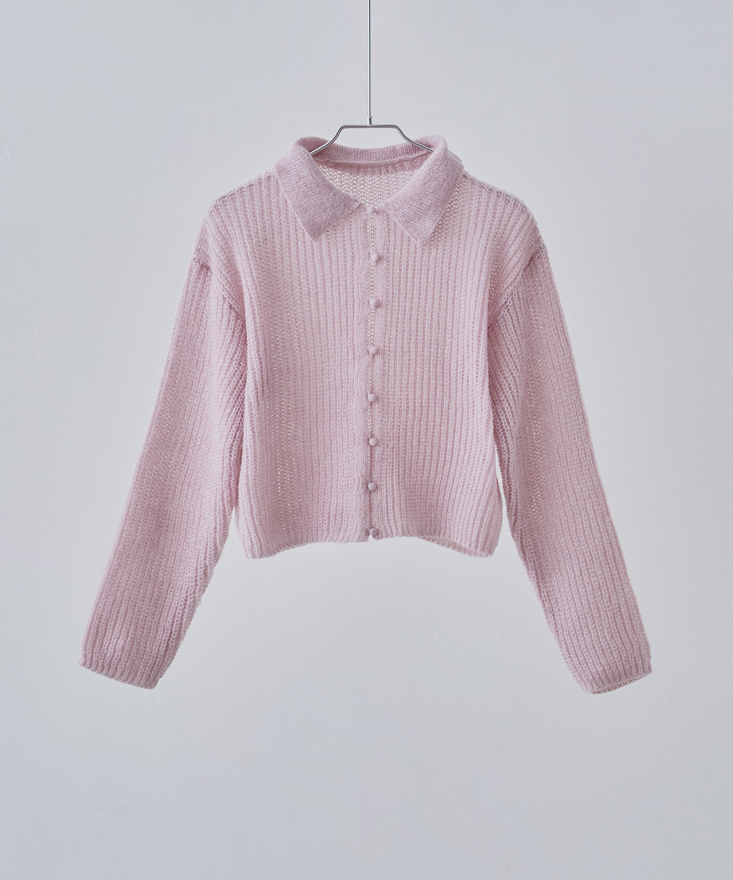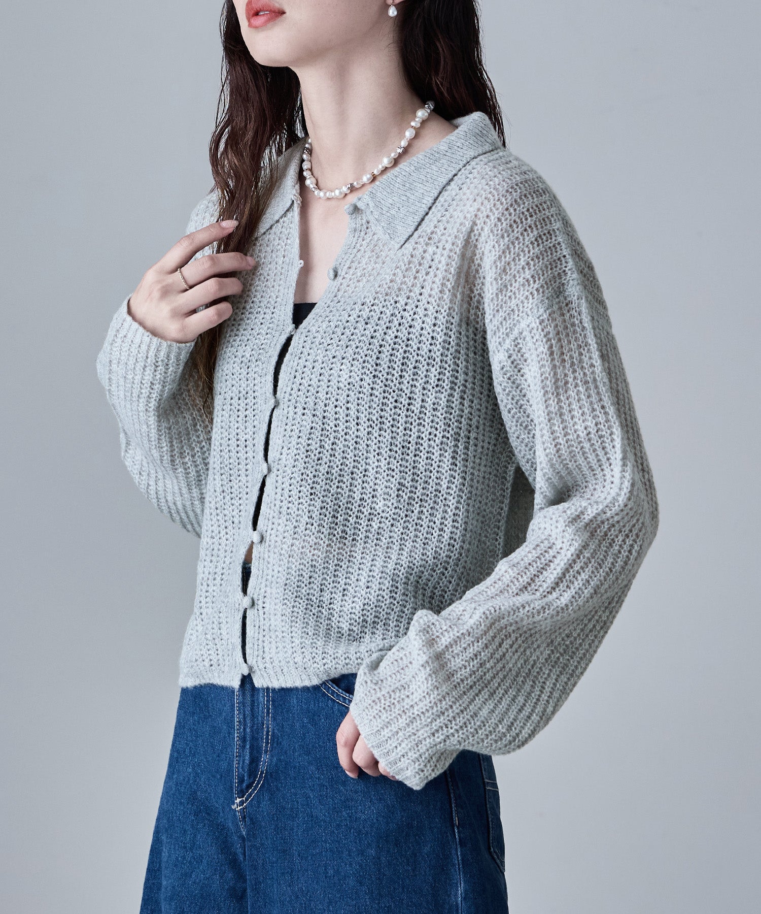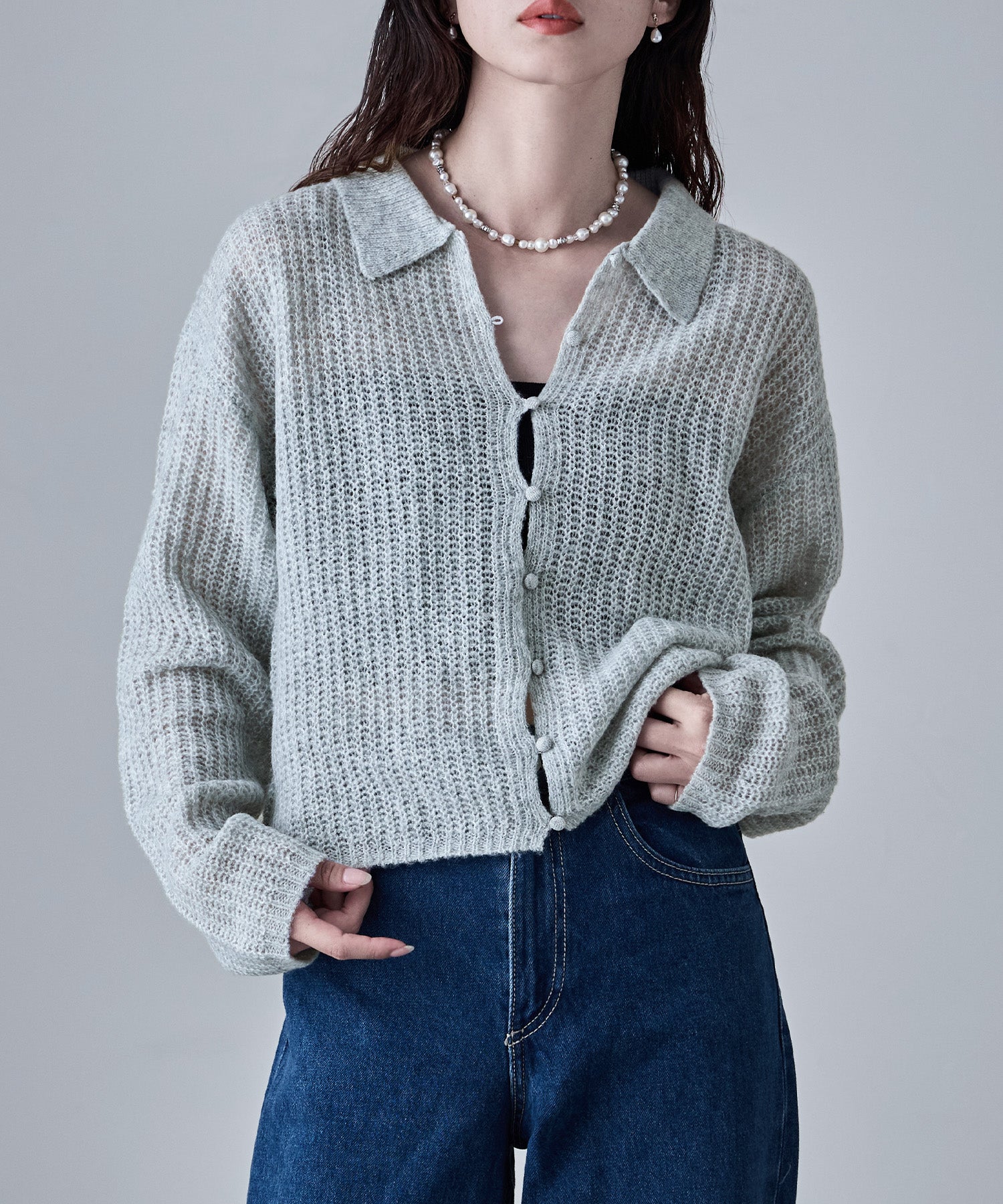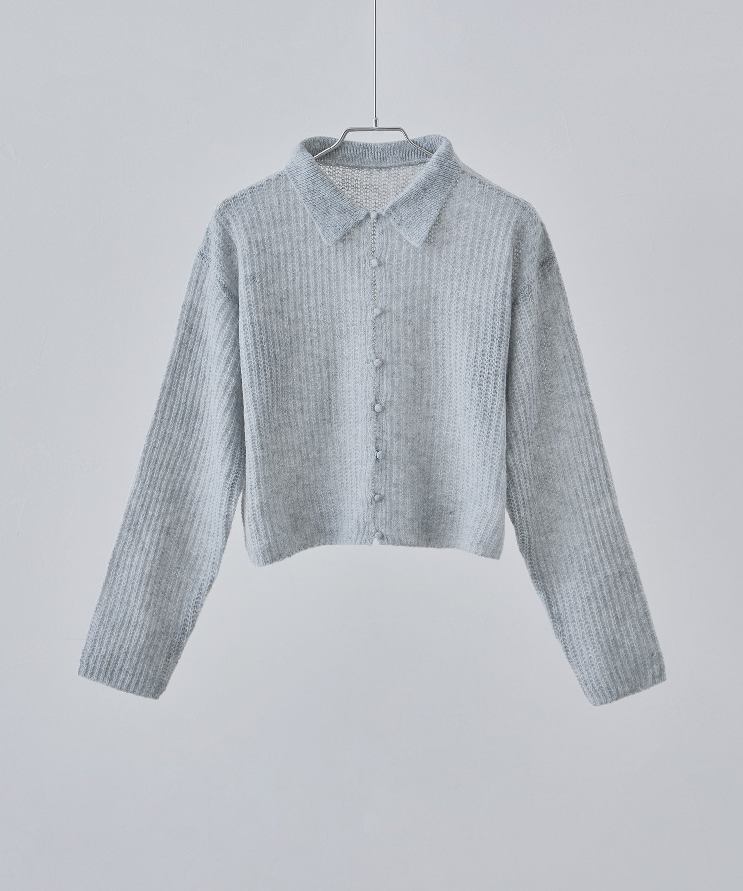 Rname モヘアタッチショートニットカーディガン トップス カーディガン ニット ニットカーデ ポロニット 長袖 モヘアタッチ モヘアライク リブニット ショートニット 畦編み 襟付き レギュラーカラー Vネック くるみボタン 起毛糸 羽織り 短丈 透け感