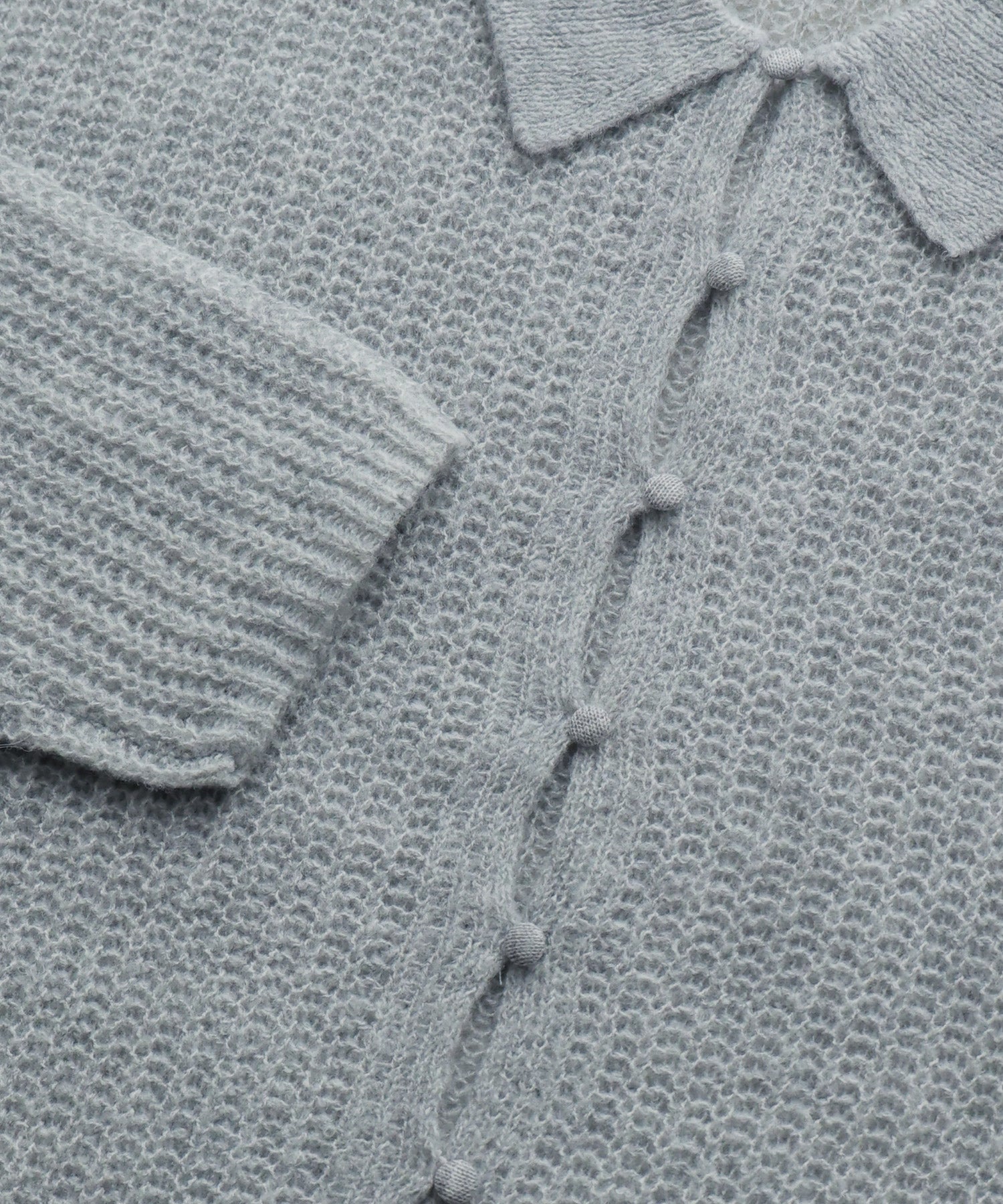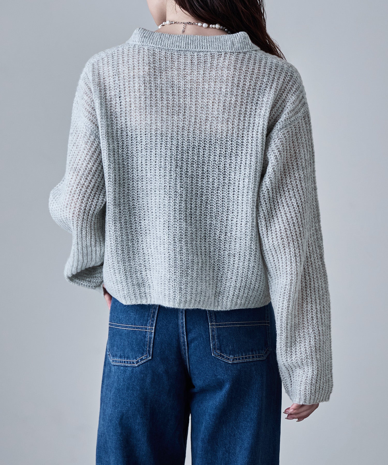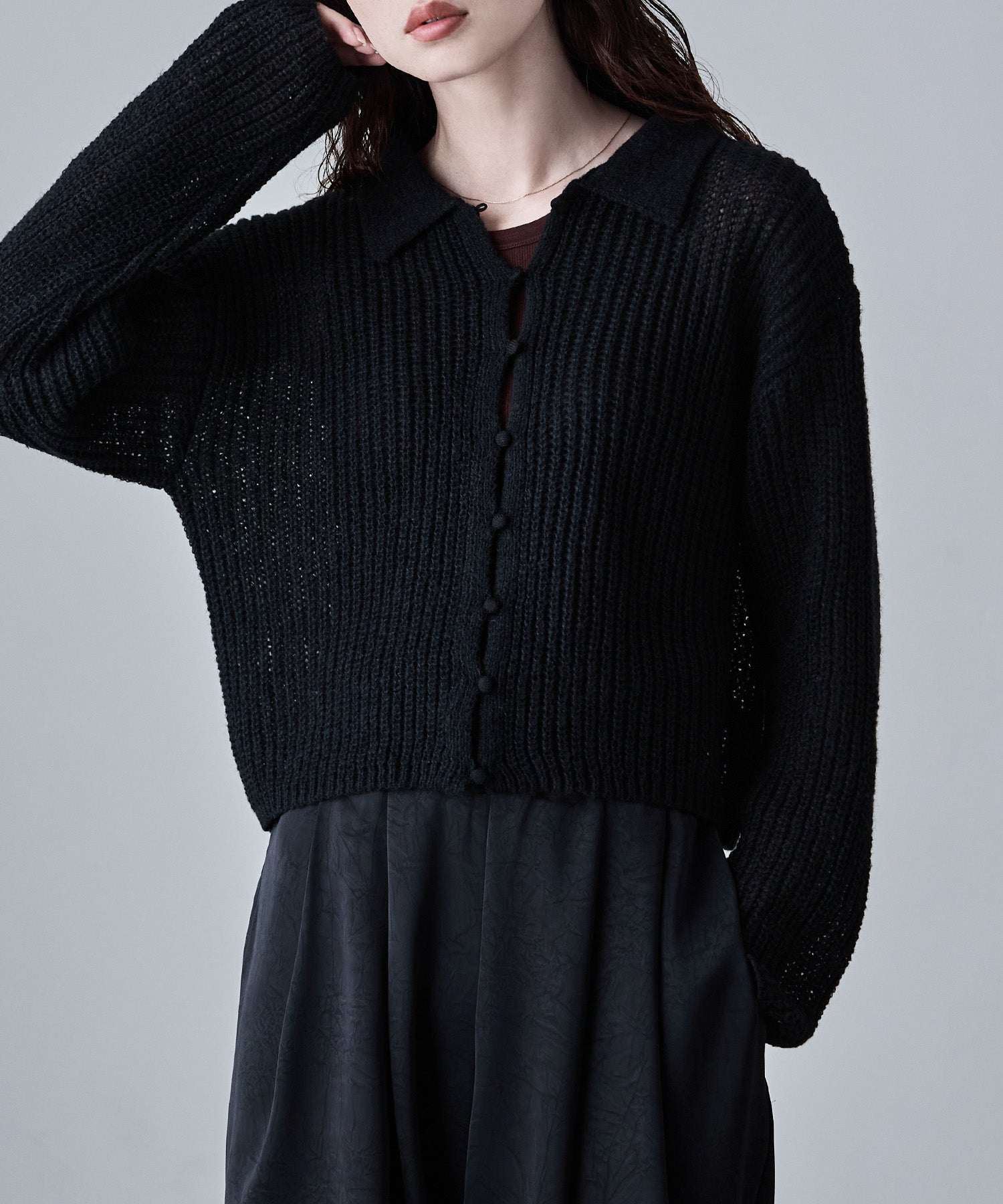 Rname モヘアタッチショートニットカーディガン トップス カーディガン ニット ニットカーデ ポロニット 長袖 モヘアタッチ モヘアライク リブニット ショートニット 畦編み 襟付き レギュラーカラー Vネック くるみボタン 起毛糸 羽織り 短丈 透け感