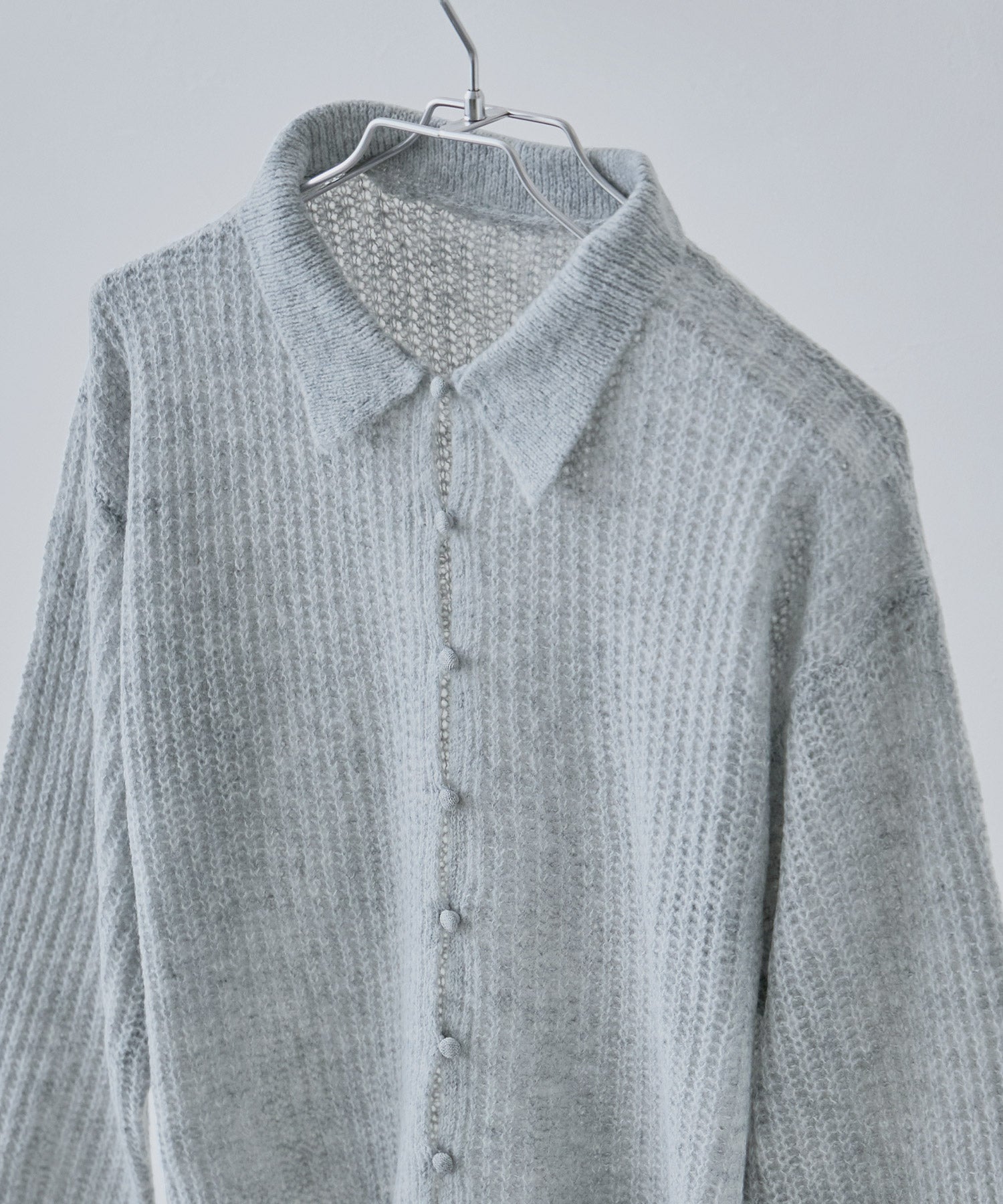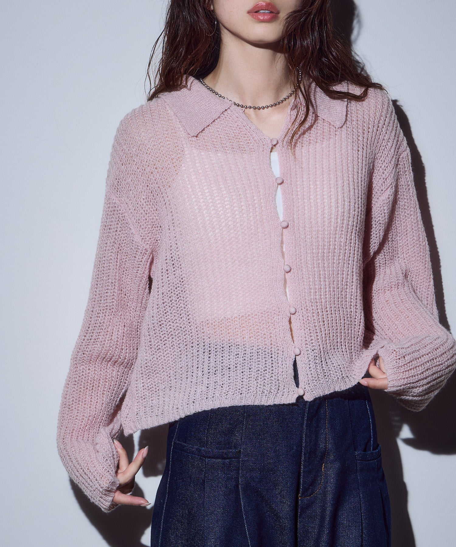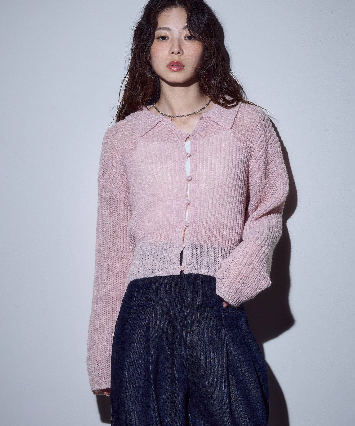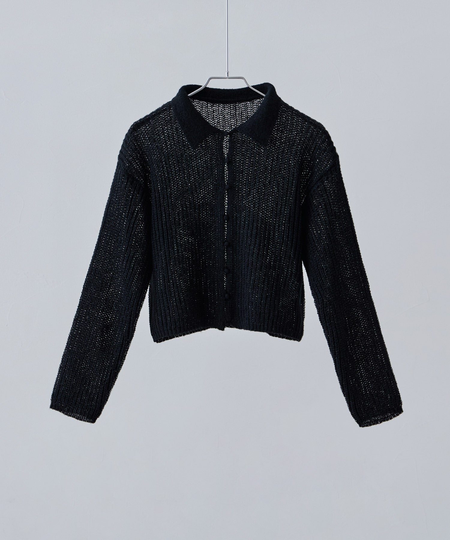 Rname モヘアタッチショートニットカーディガン トップス カーディガン ニット ニットカーデ ポロニット 長袖 モヘアタッチ モヘアライク リブニット ショートニット 畦編み 襟付き レギュラーカラー Vネック くるみボタン 起毛糸 羽織り 短丈 透け感