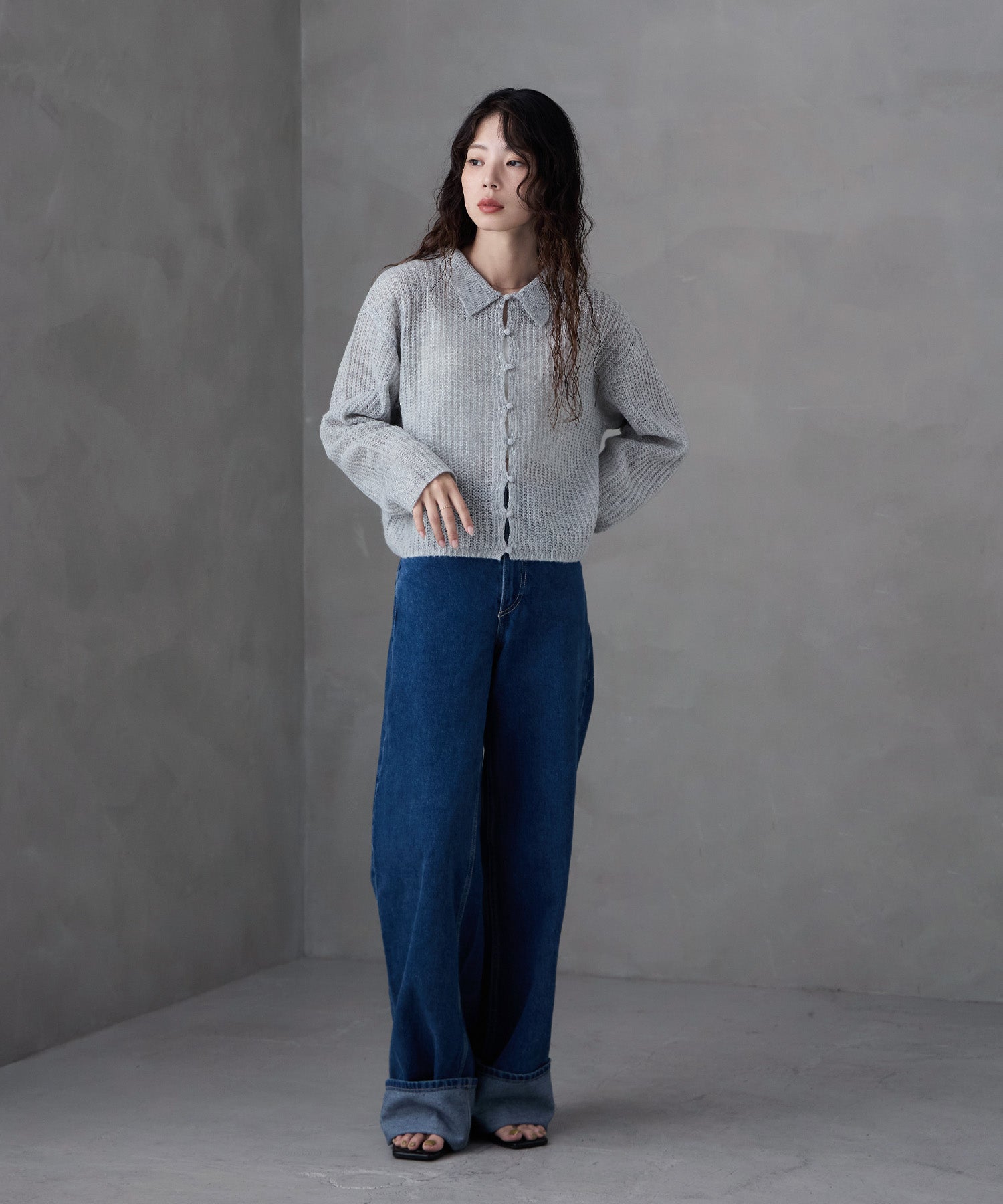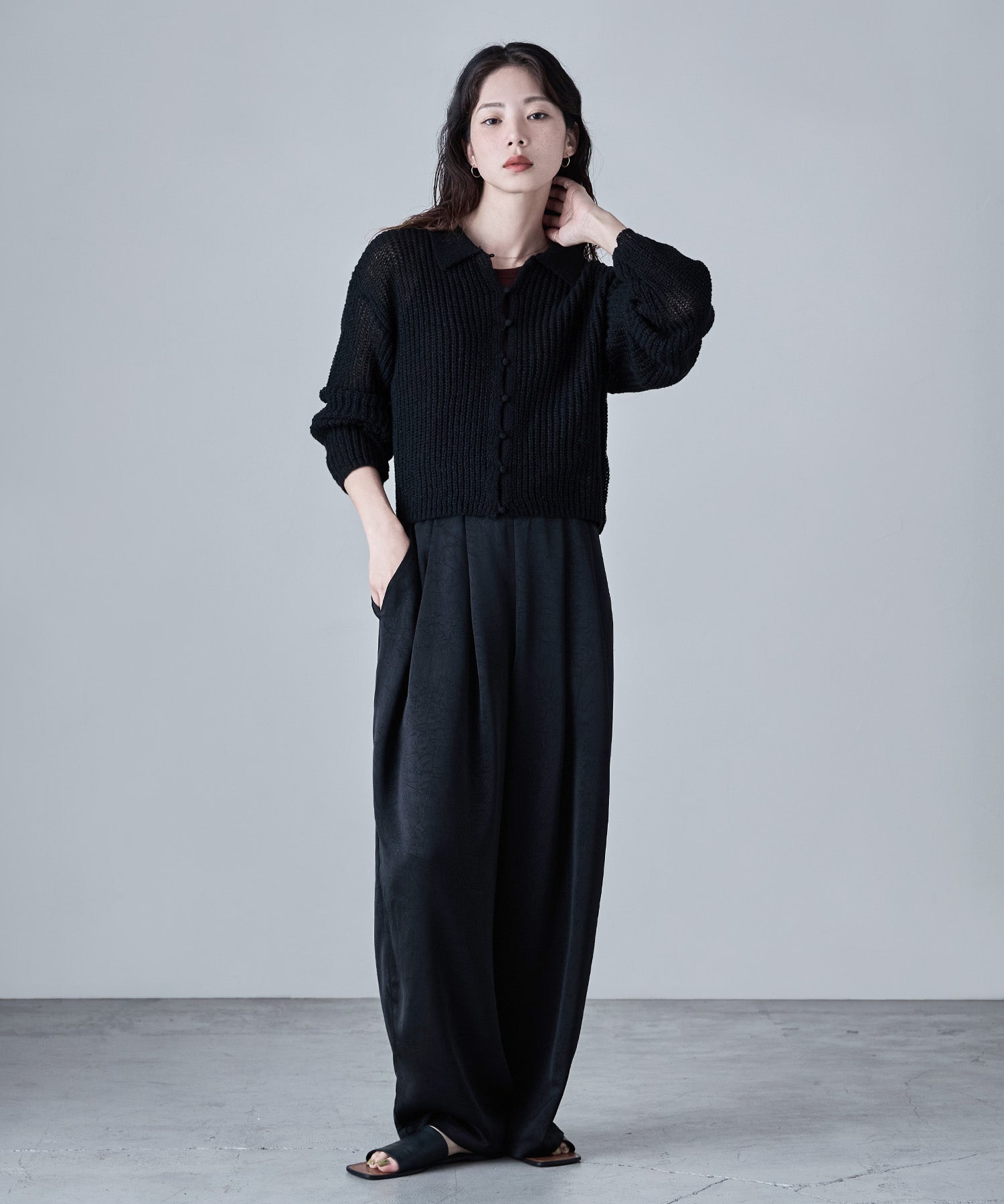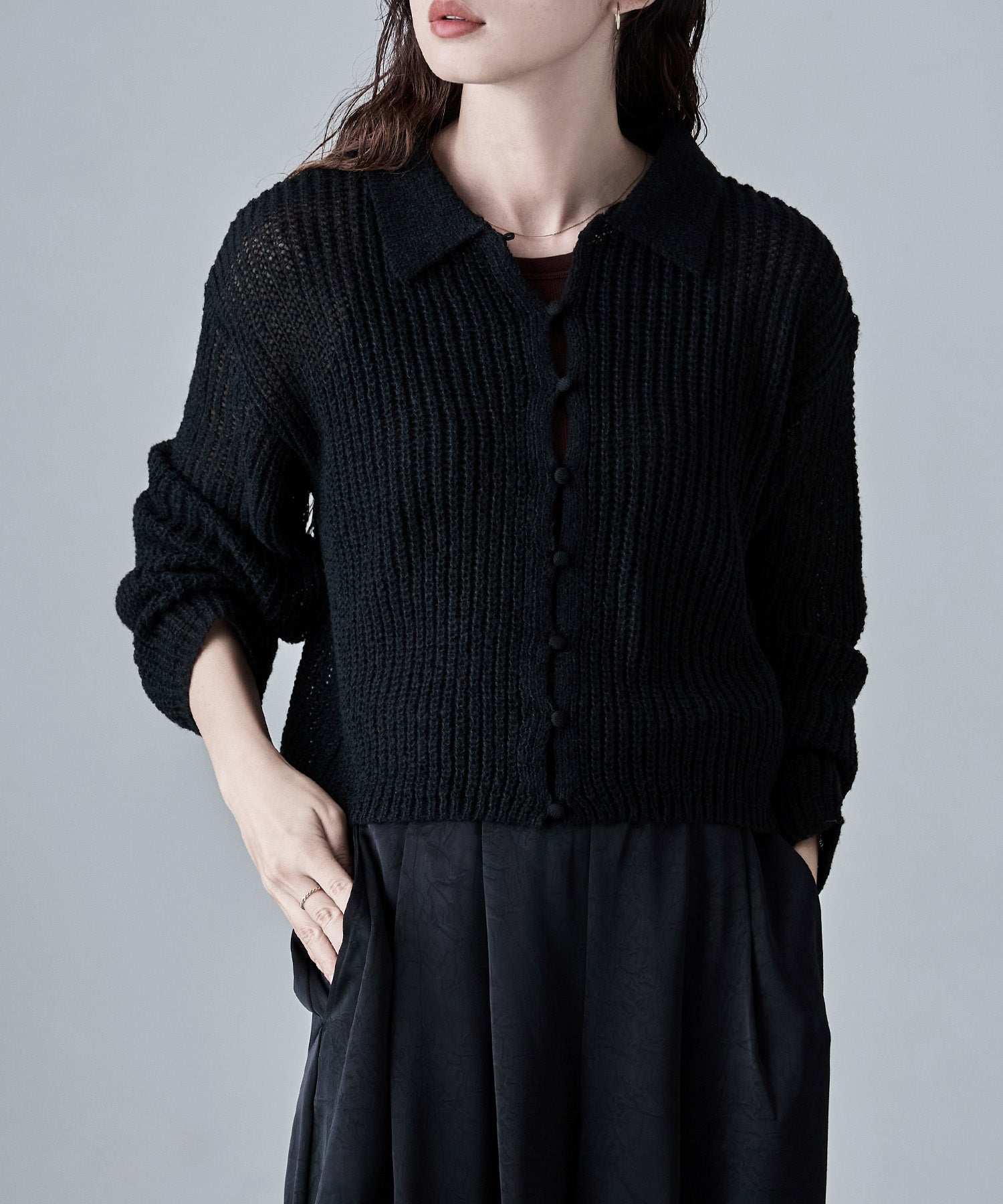 ゆるっと華奢見えに導くシルエットの襟付きニットカーディガン。