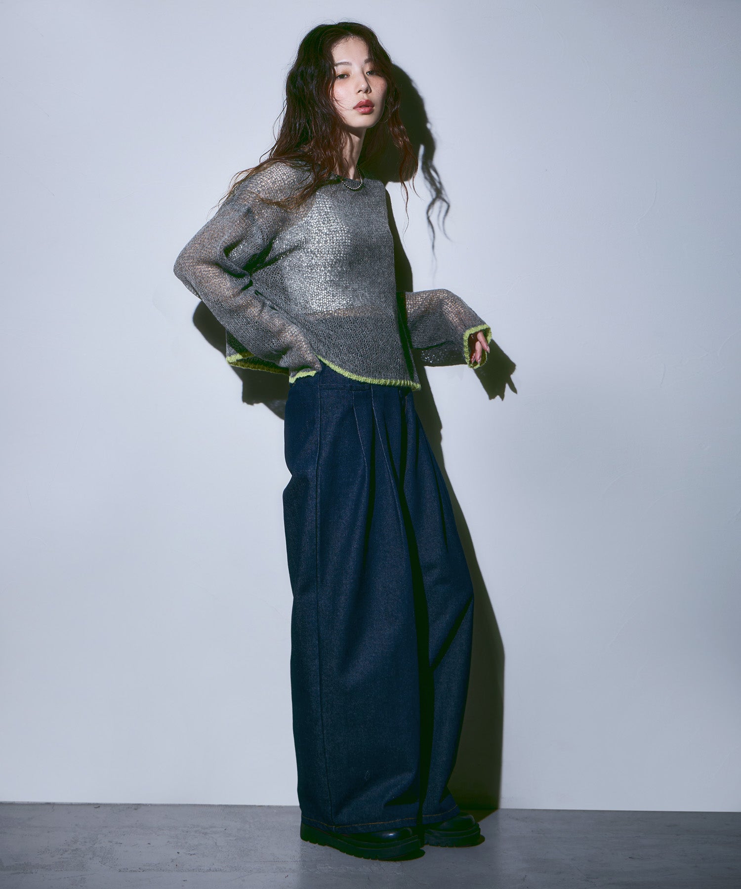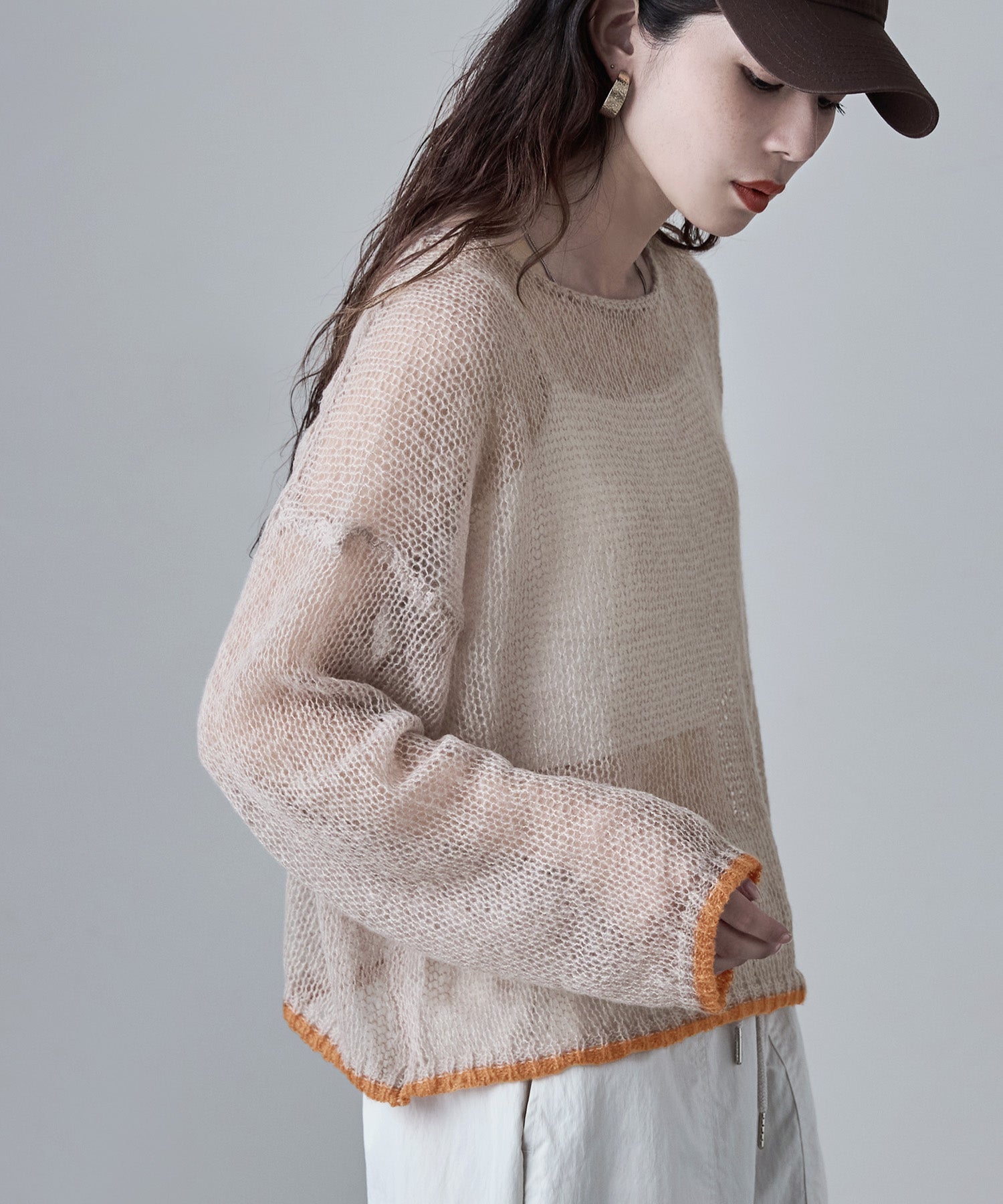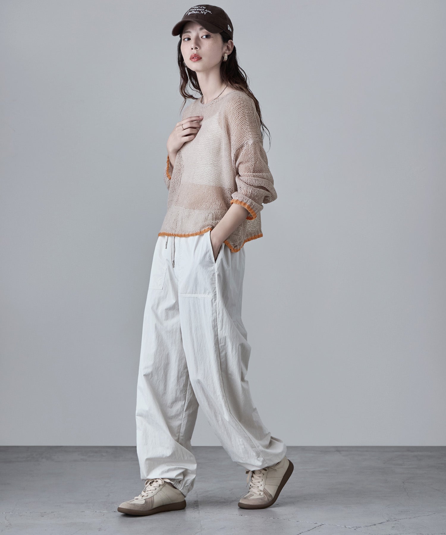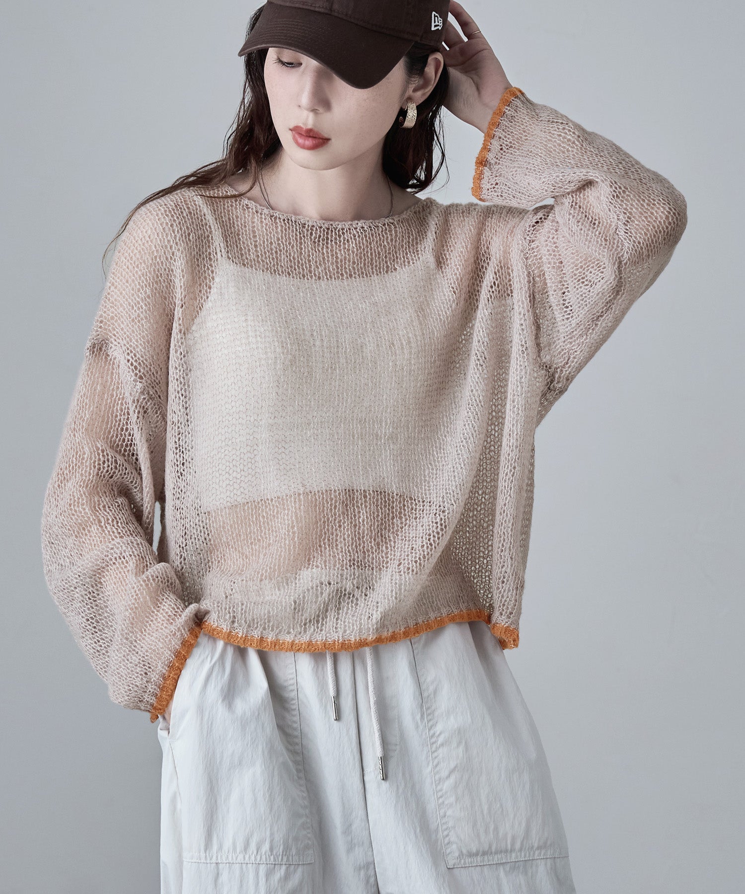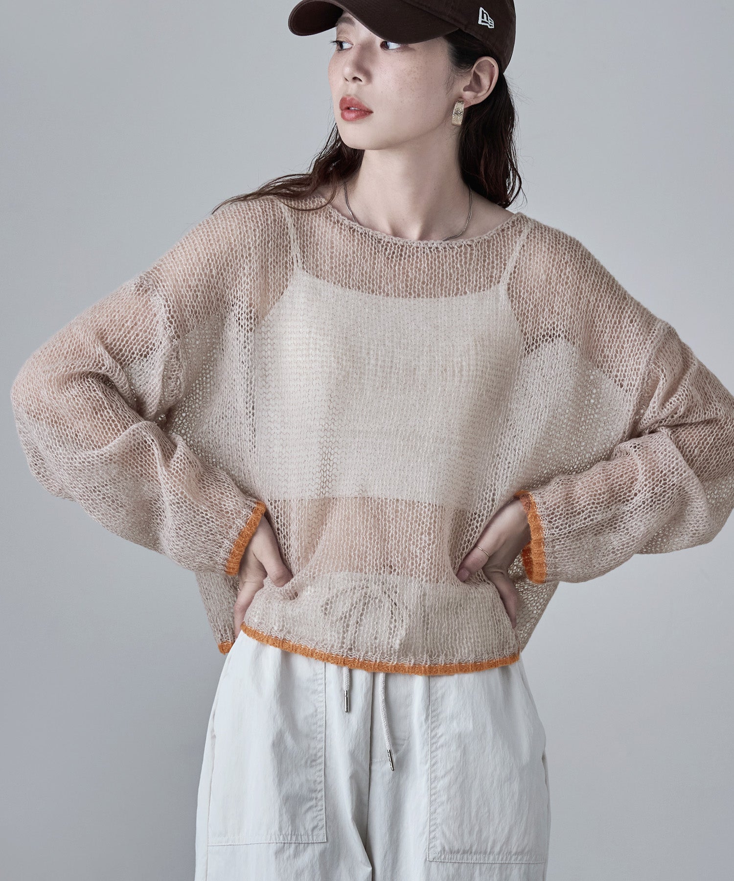 編み目の間から柄物トップスやロゴTをのぞかせ、インナーを活かしたお洒落も楽しめます。