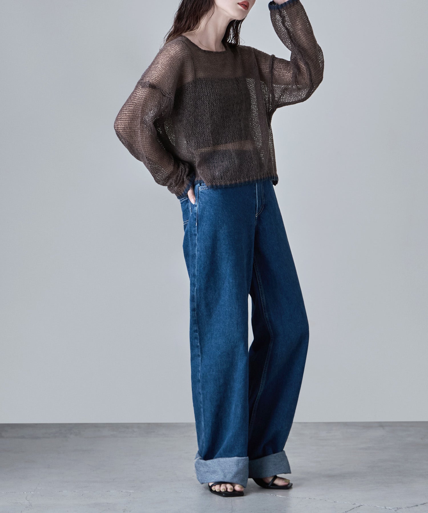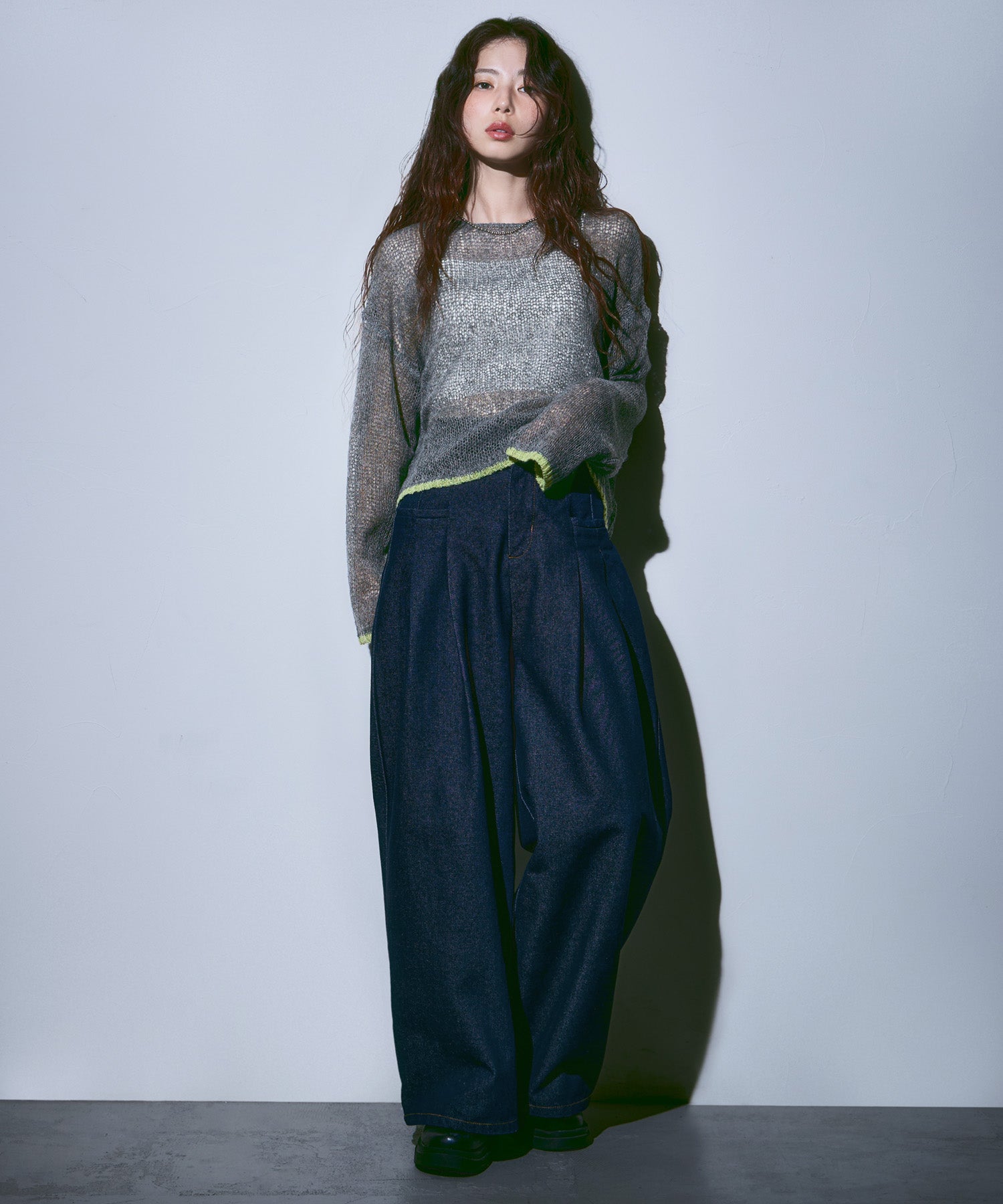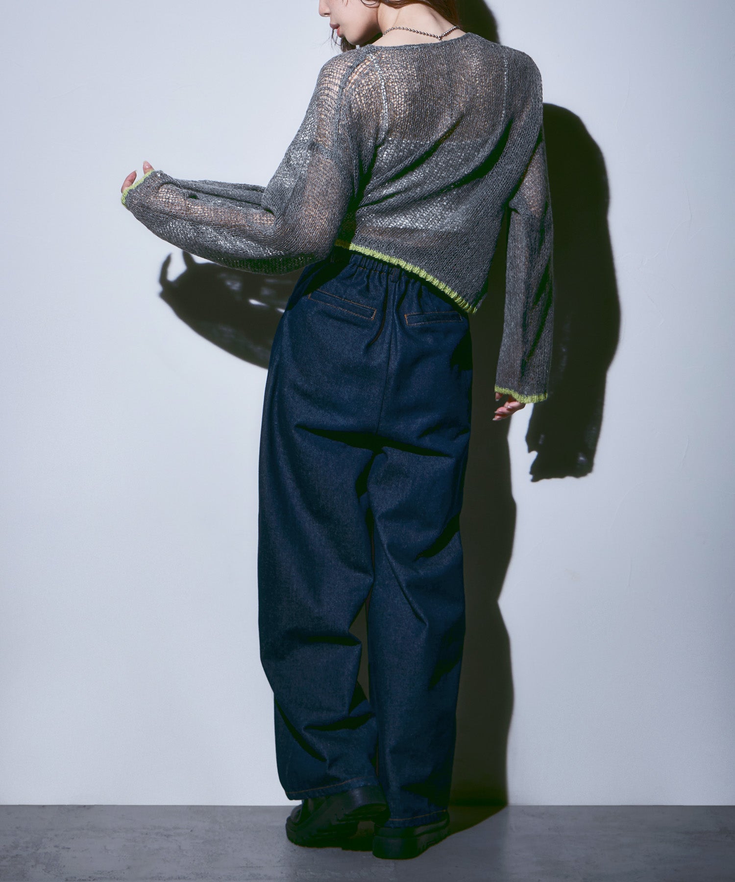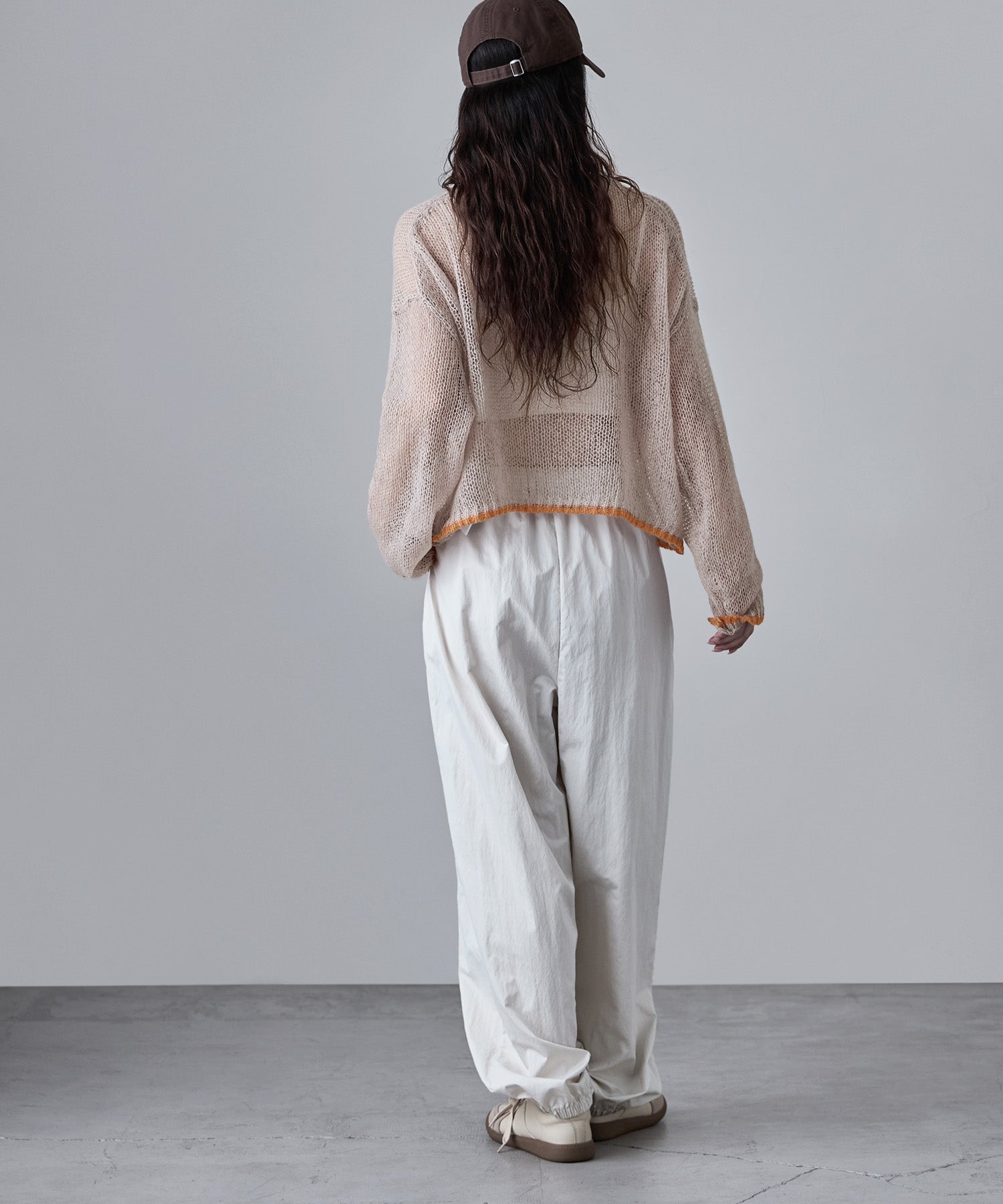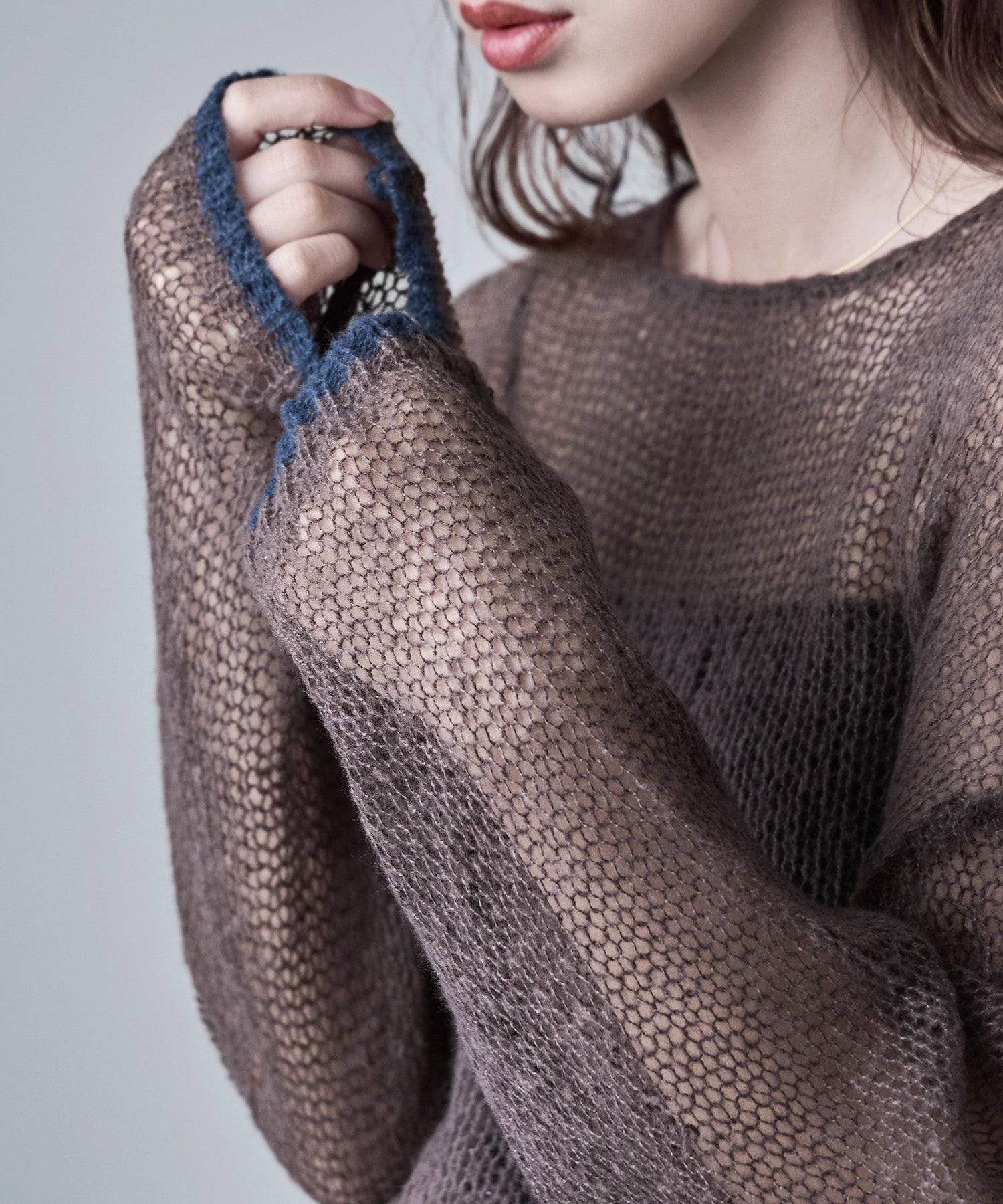 編み目の間から柄物トップスやロゴTをのぞかせ、インナーを活かしたお洒落も楽しめます。