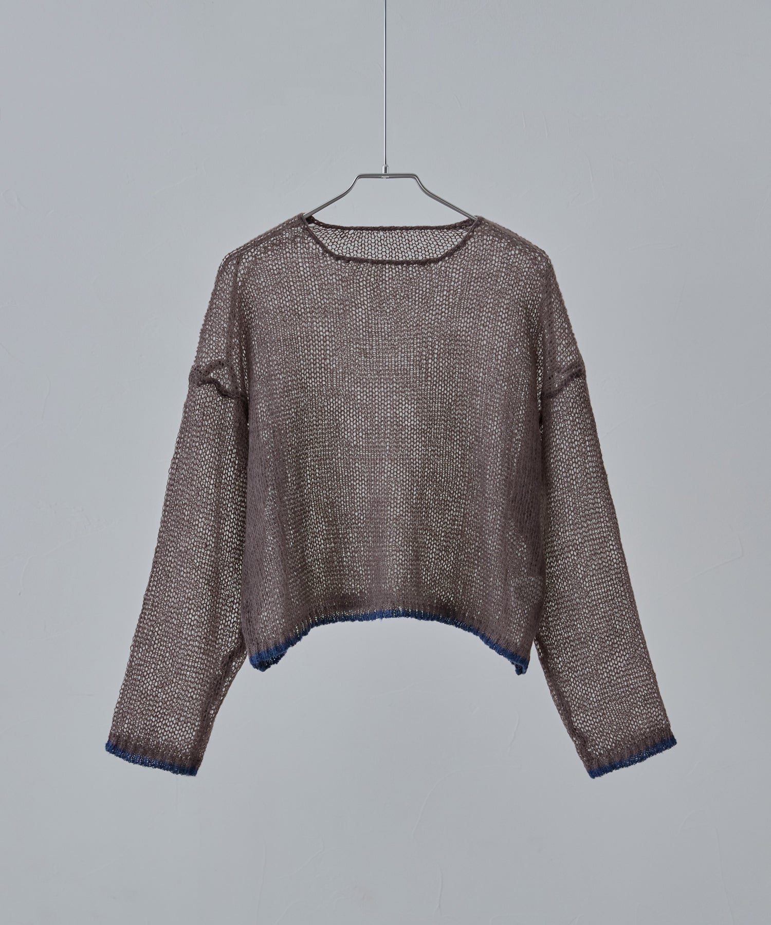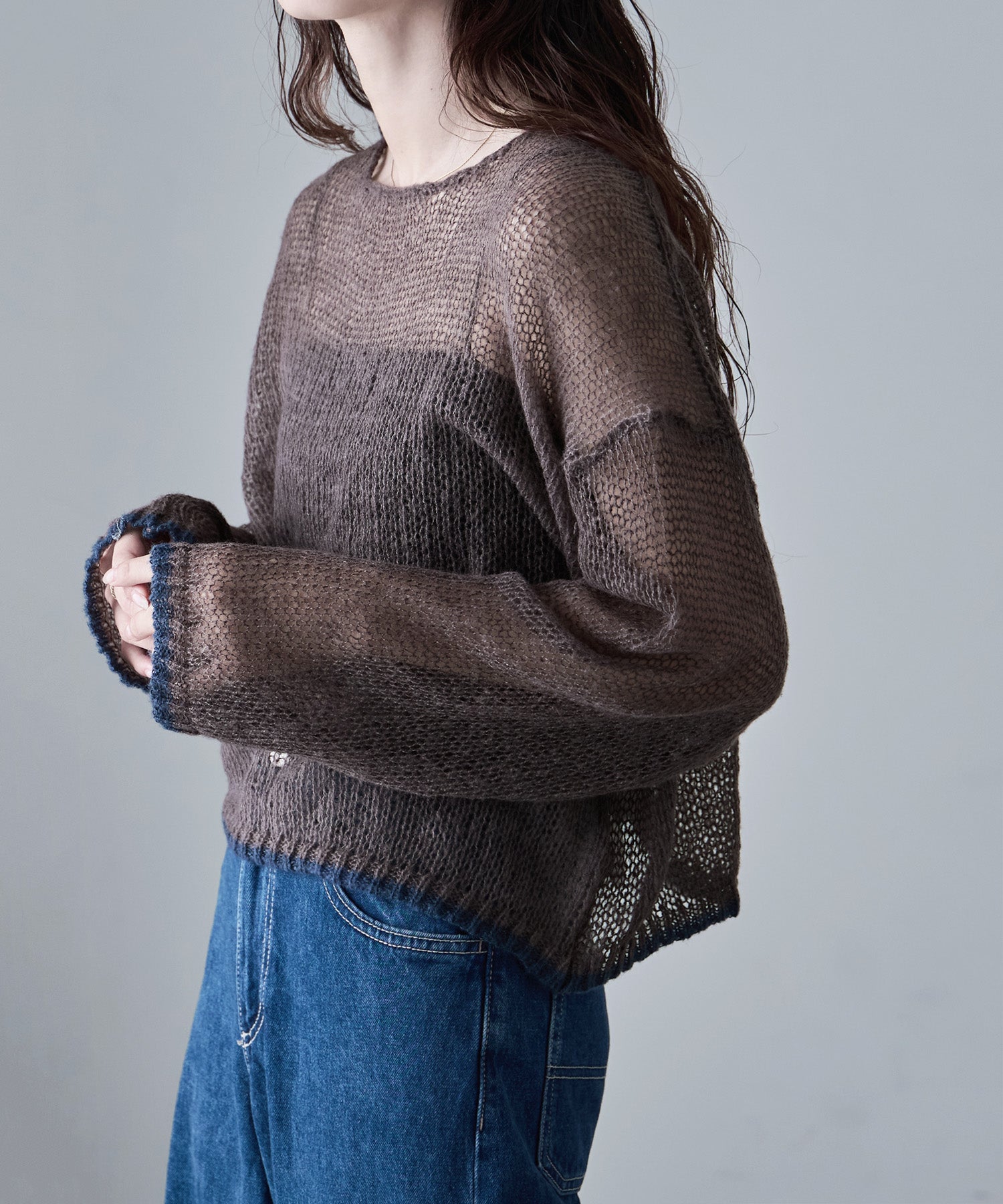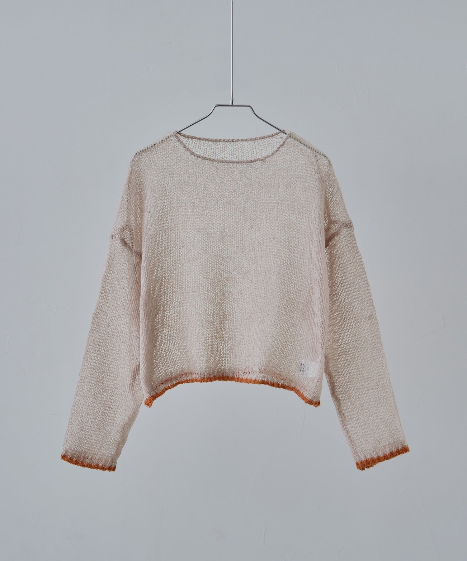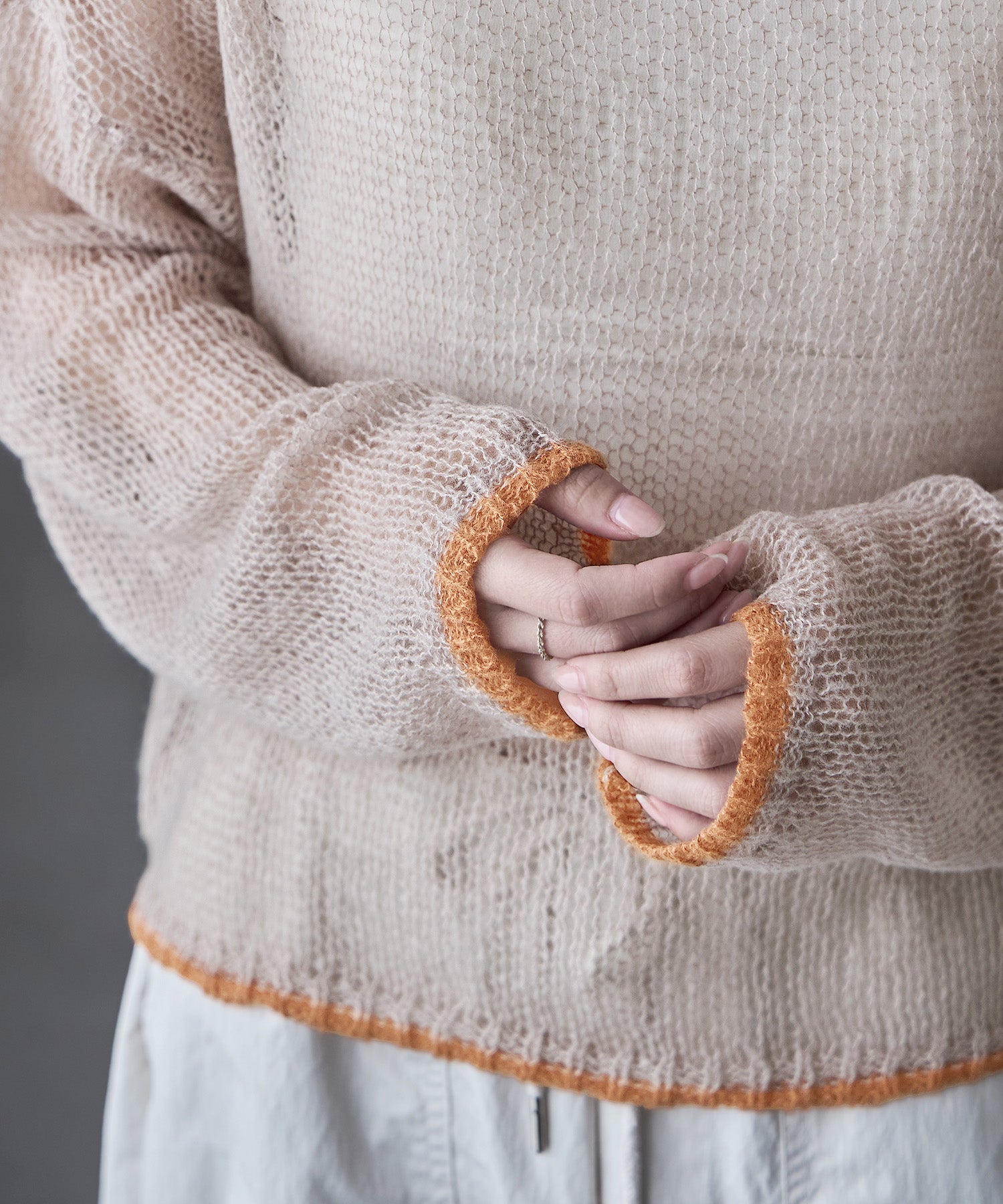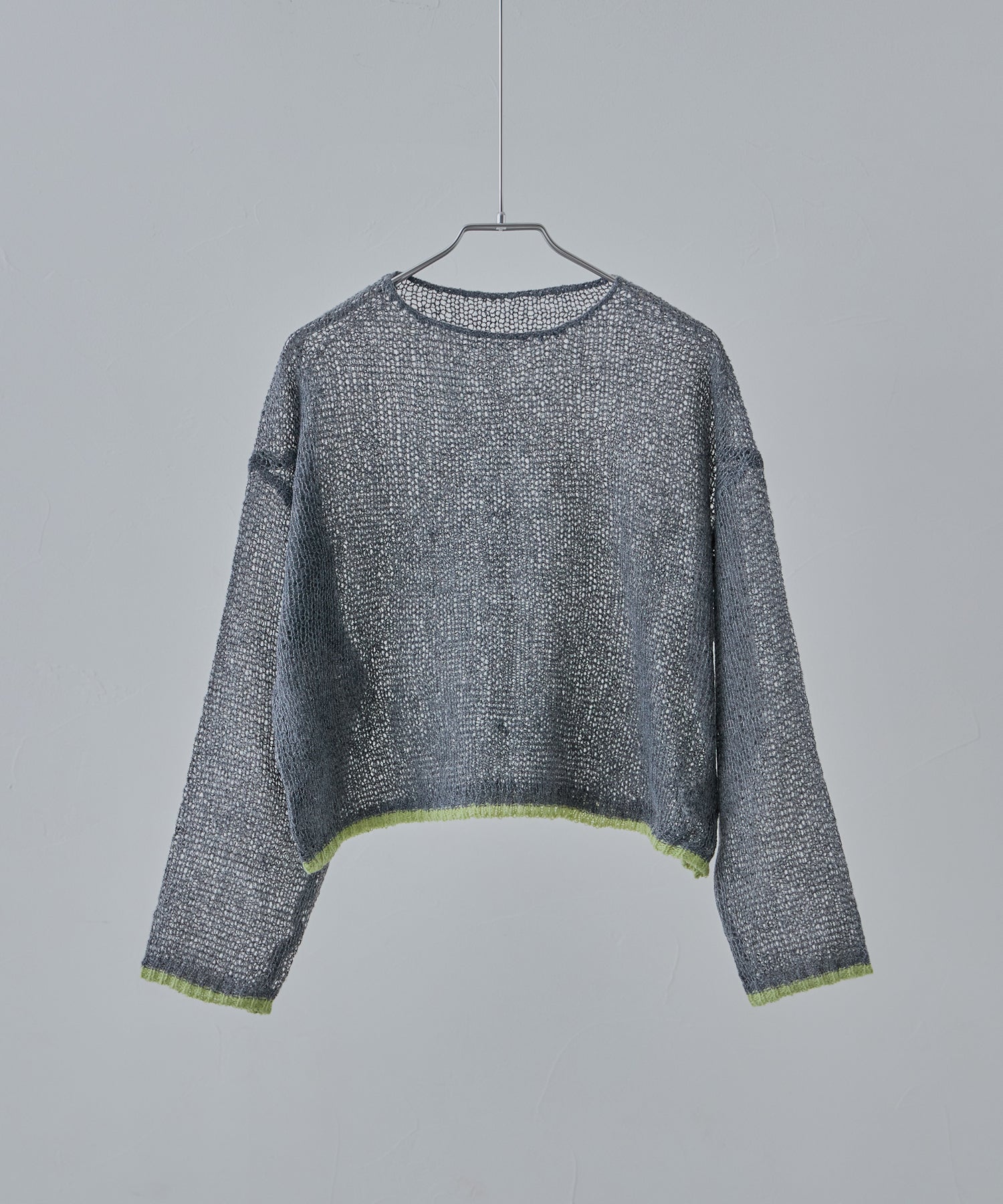 モヘアタッチの柔らかな糸で仕立てた、ショート丈の配色ローゲージニット。