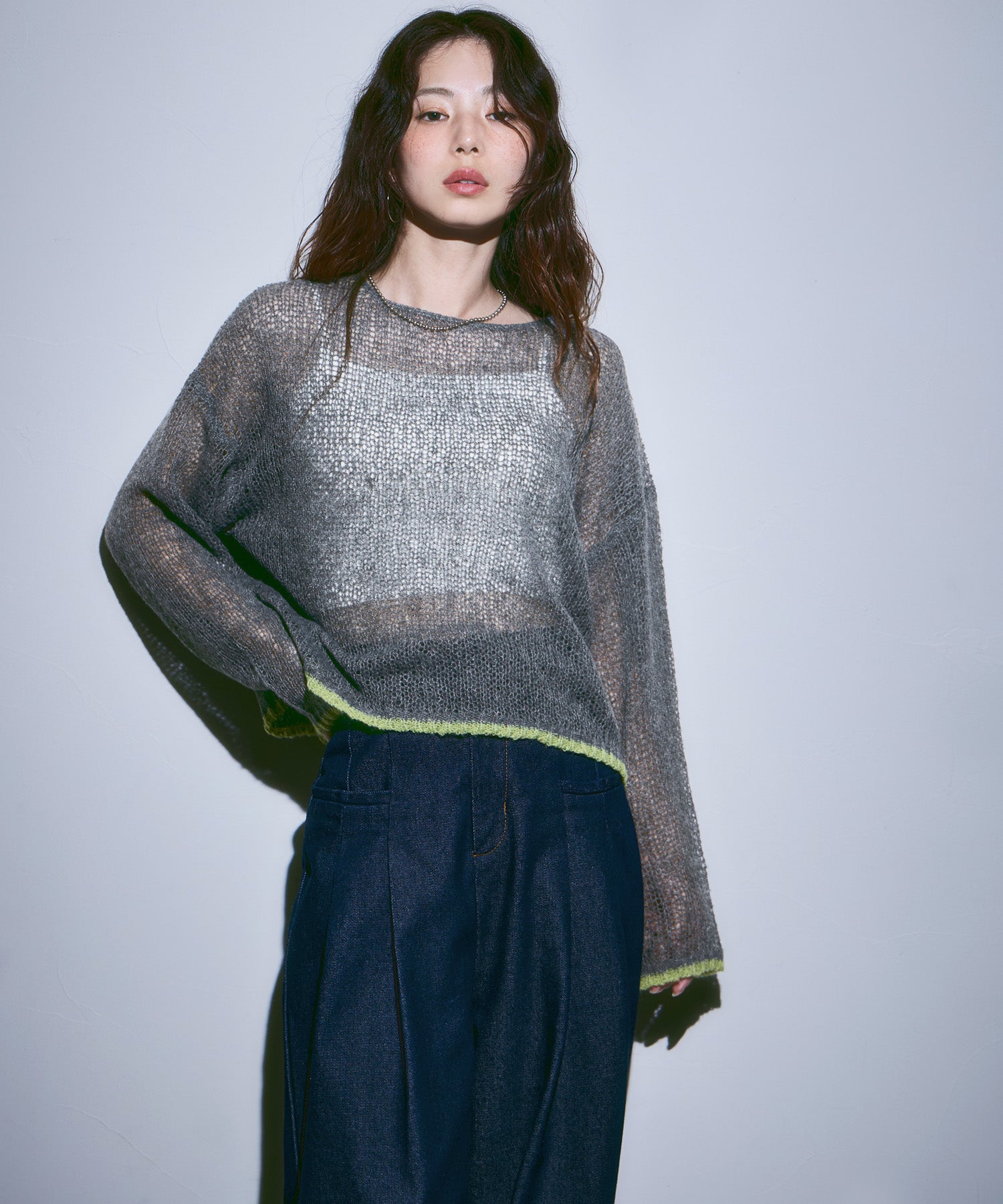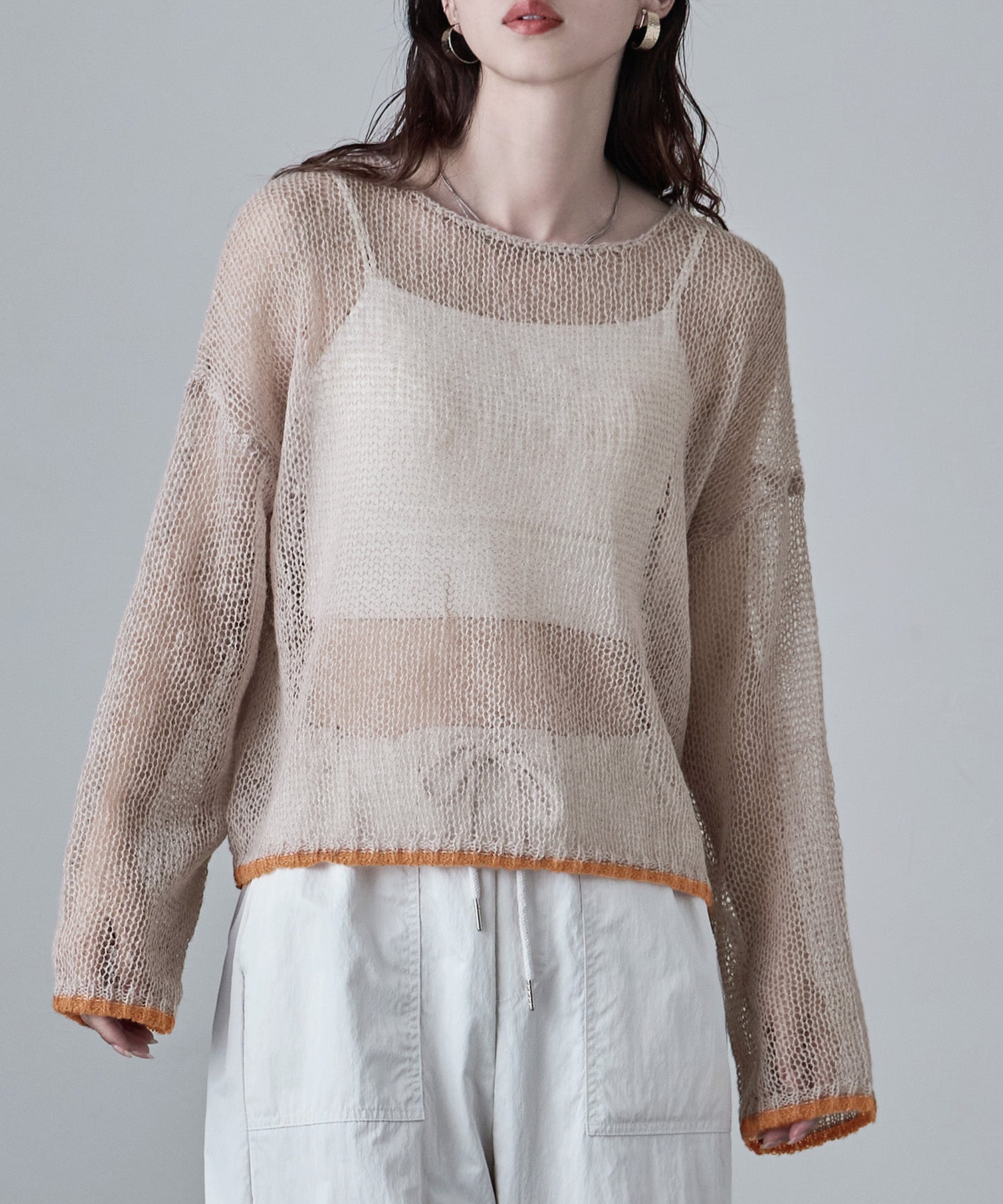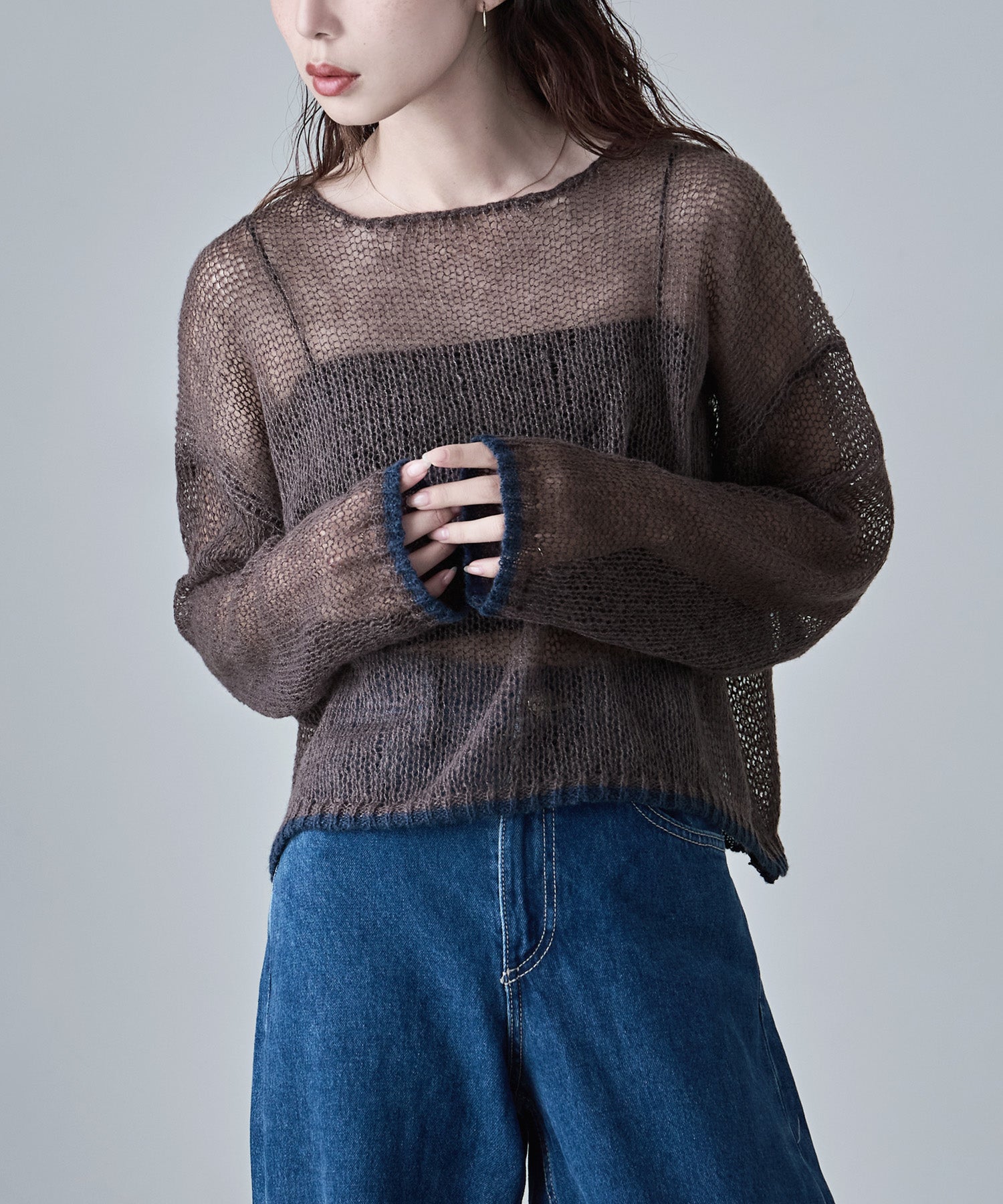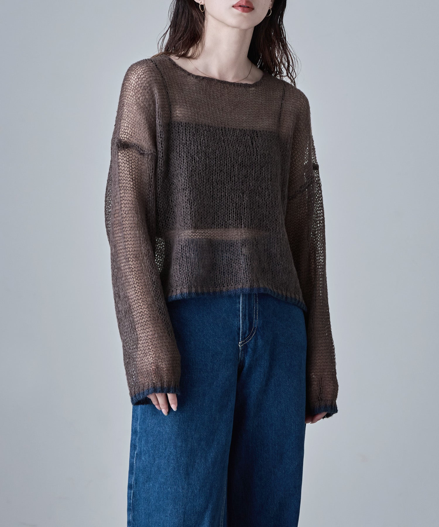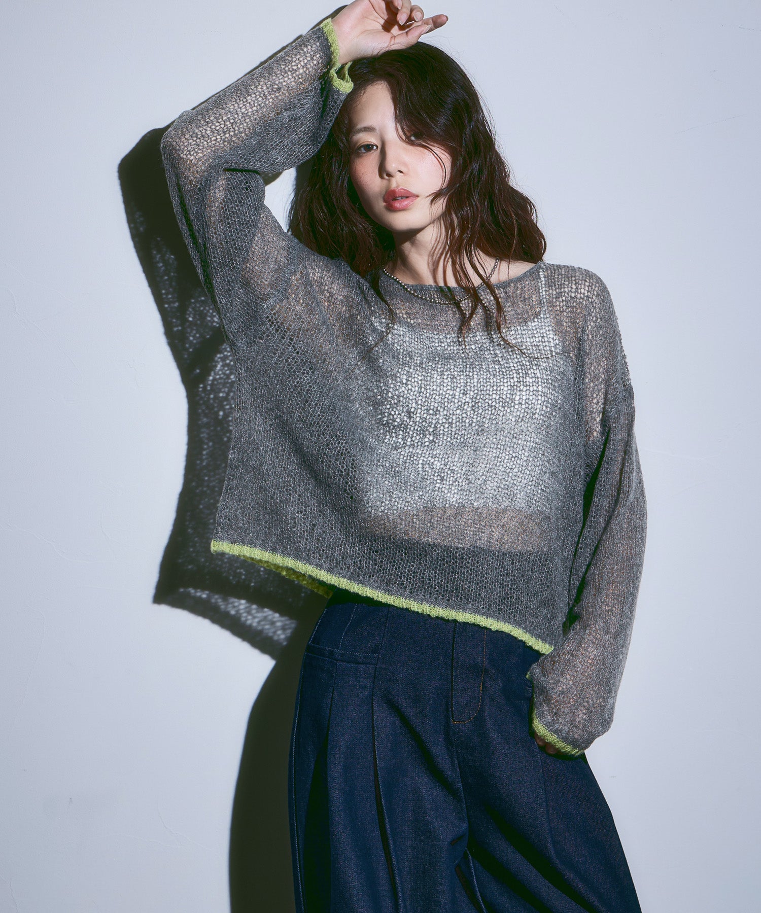 Rname モヘアタッチ配色ニット プルオーバー ローゲージショートニット トップス シアー ニット セーター モヘアライク 長袖 バイカラー 配色 クロップド ショート丈 ボートネック 透け感 ゆったり メッシュニット 短丈 無地