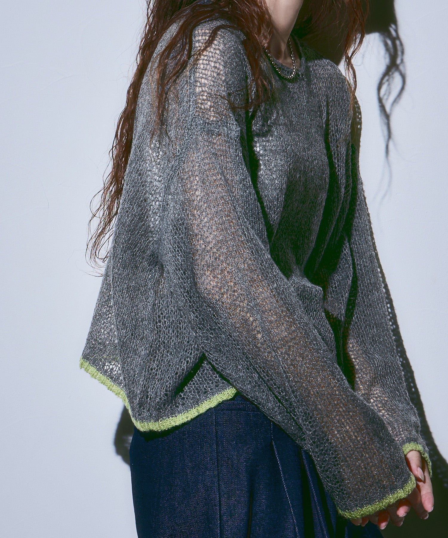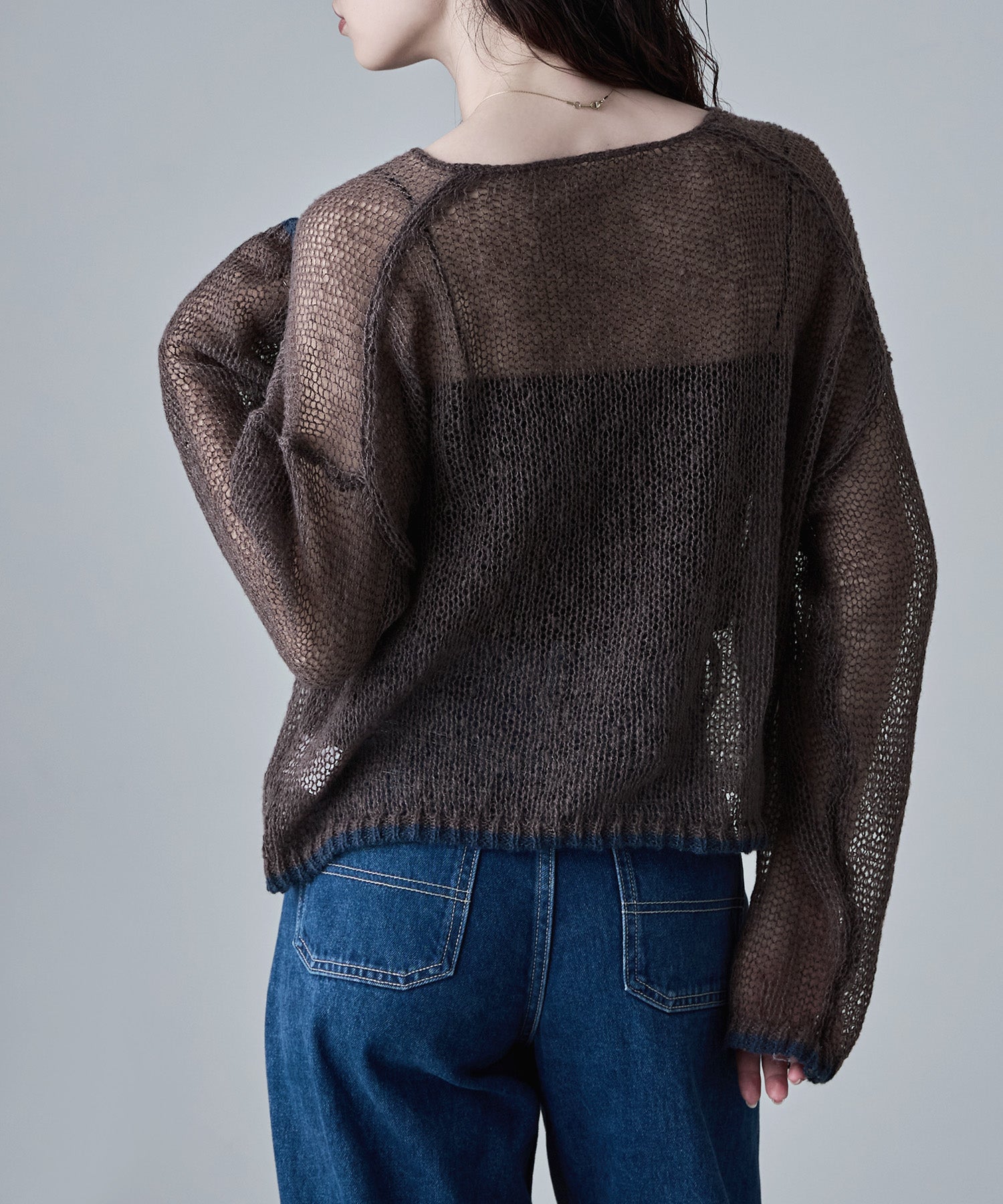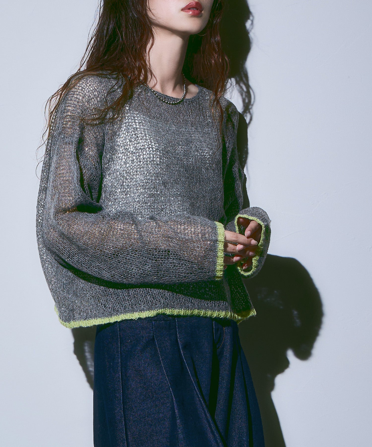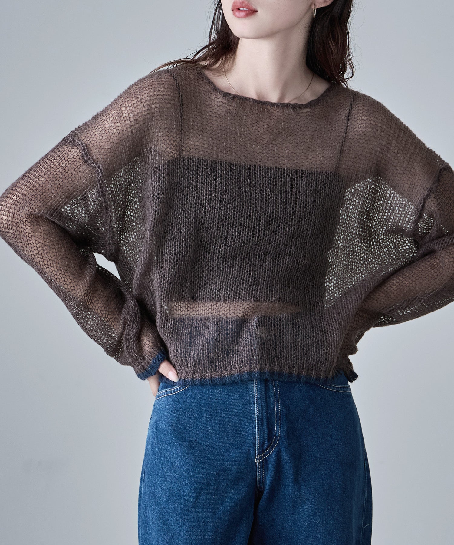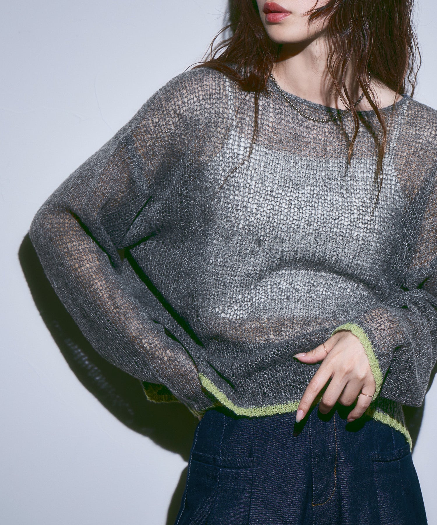 Rname モヘアタッチ配色ニット プルオーバー ローゲージショートニット トップス シアー ニット セーター モヘアライク 長袖 バイカラー 配色 クロップド ショート丈 ボートネック 透け感 ゆったり メッシュニット 短丈 無地