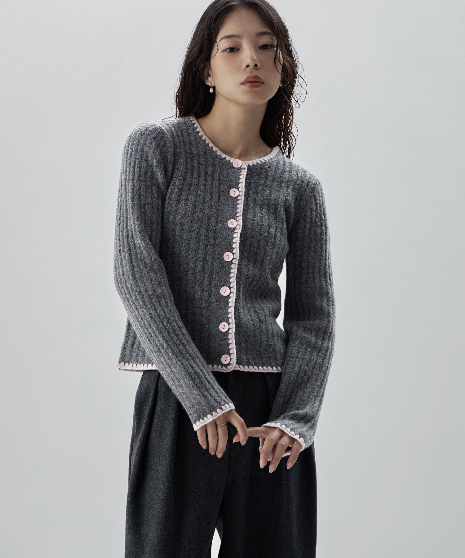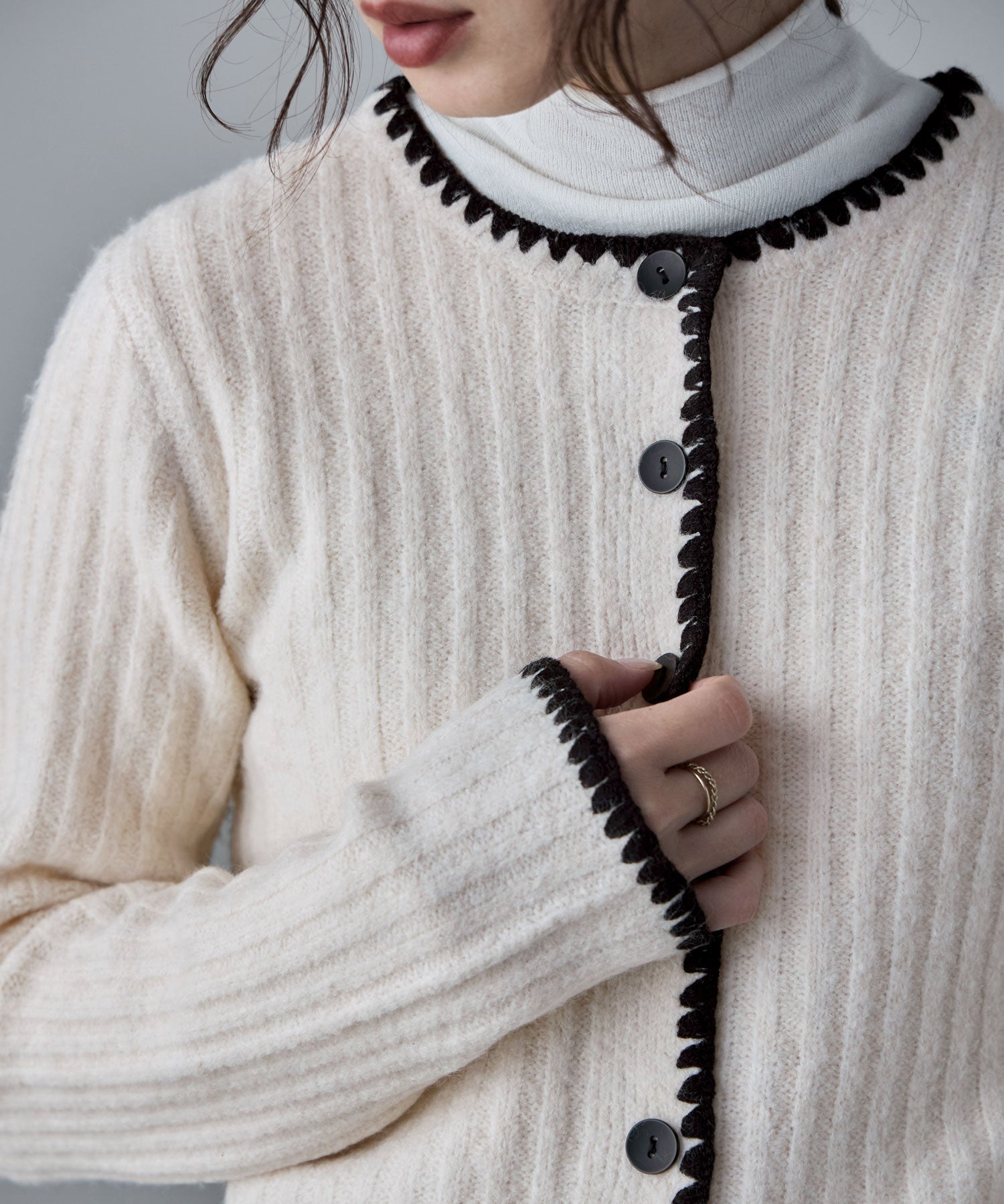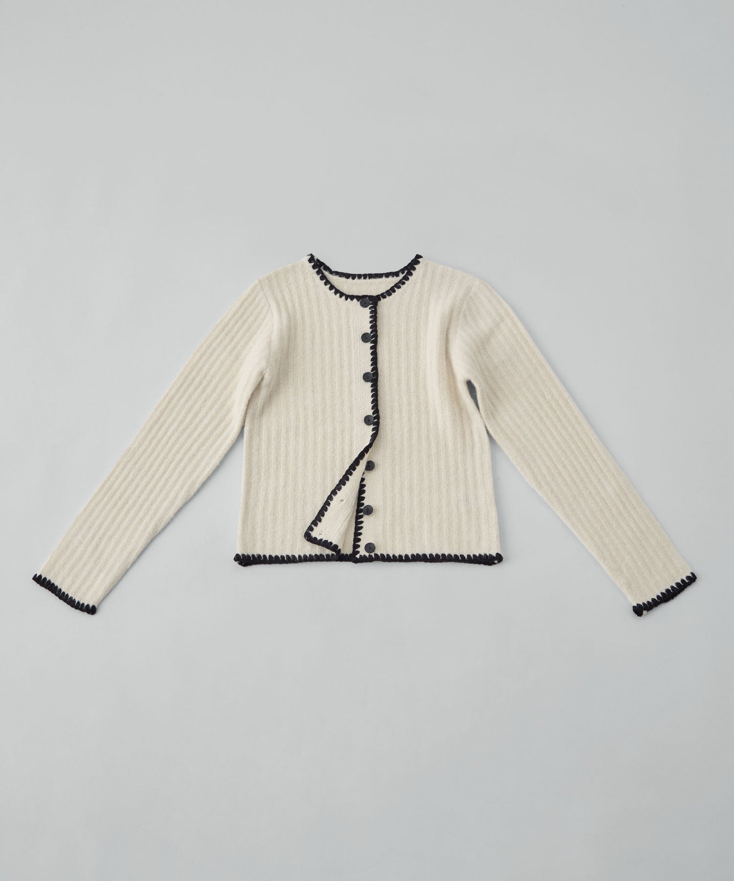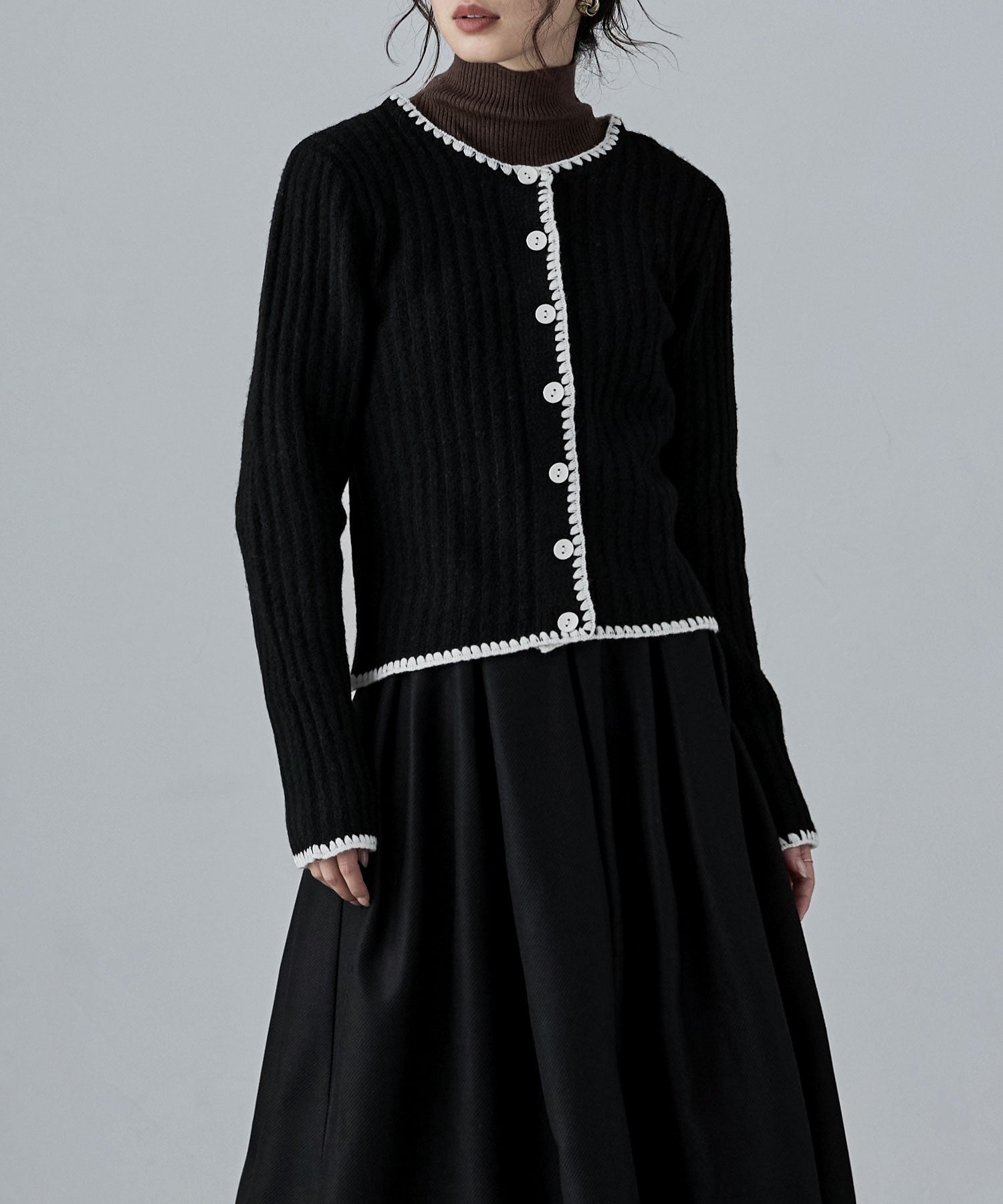 Rname 配色ステッチニットカーディガン トップス アウター カーディガン カーデ ニット リブニット 長袖 カラーカーデ バイカラー クルーネック リンガーネック 丸首 配色 タイト 伸縮性 前開き 羽織り