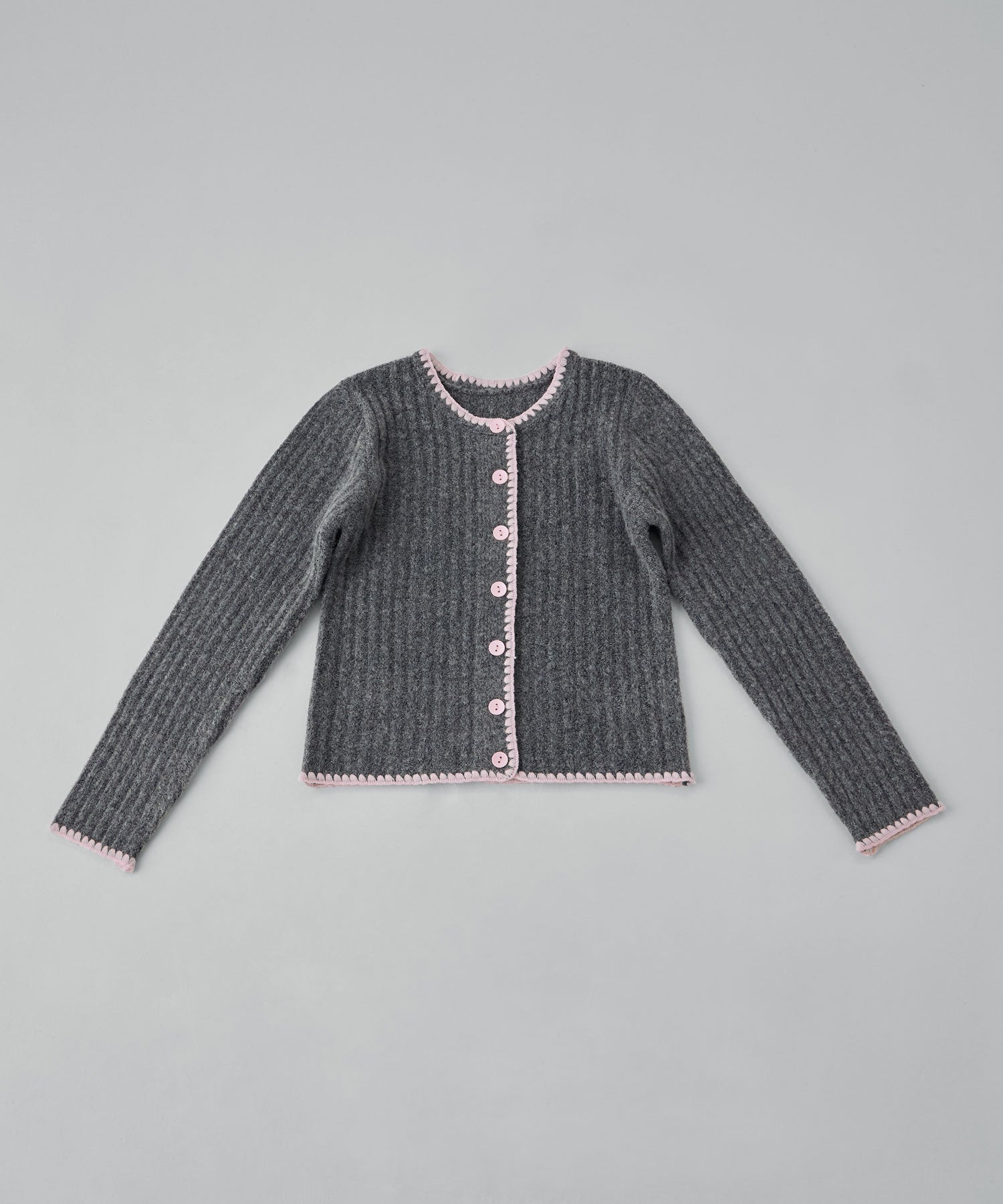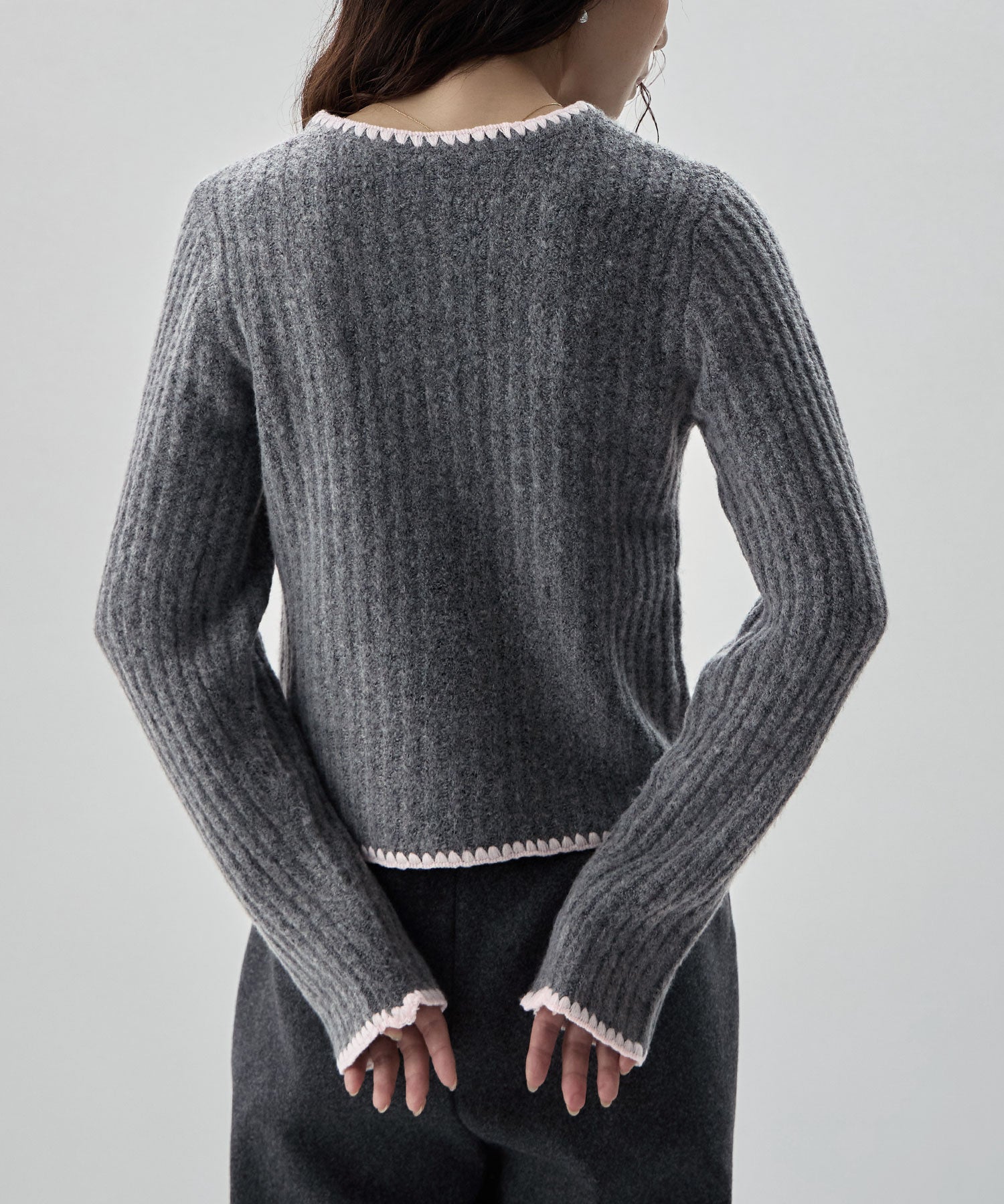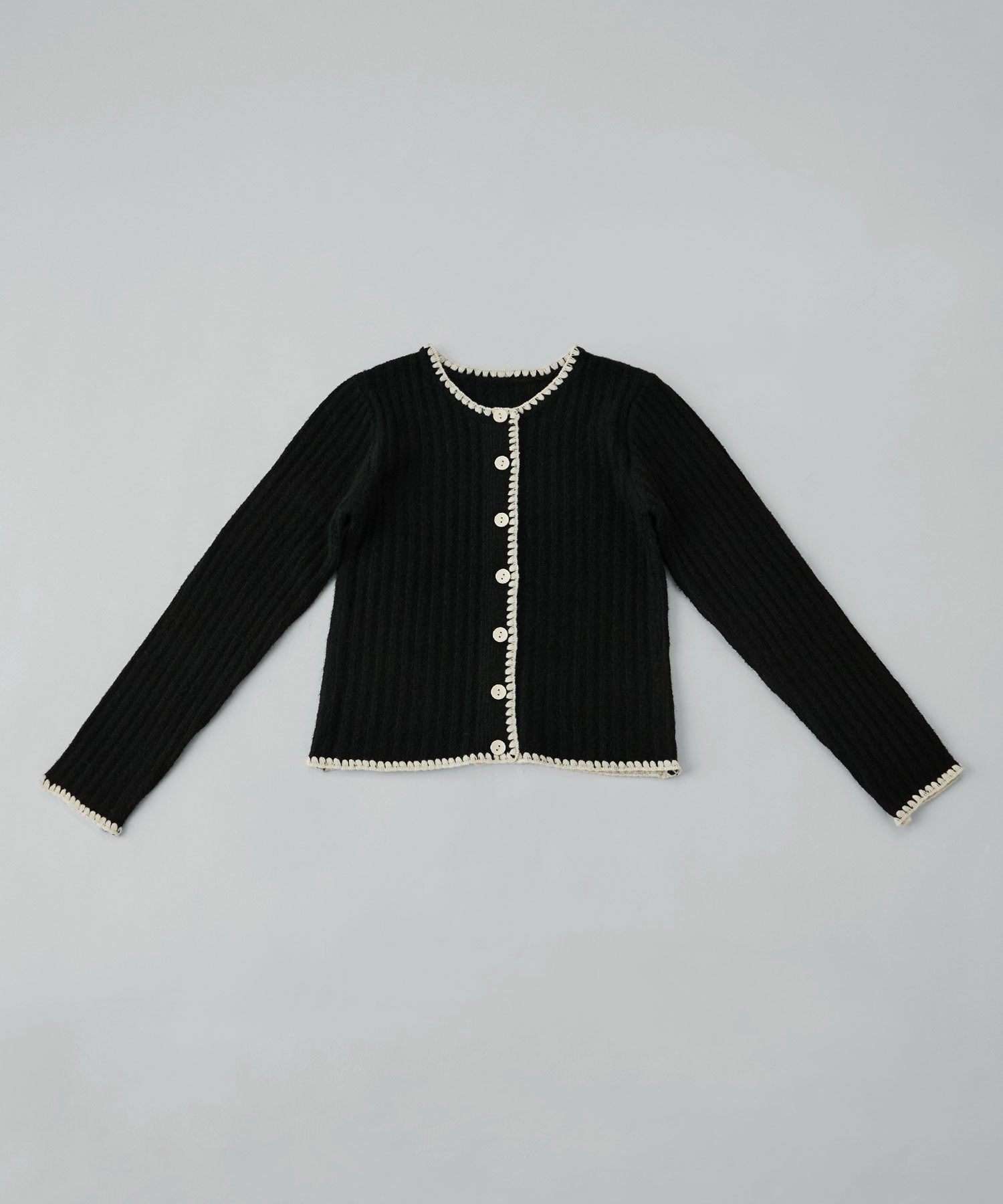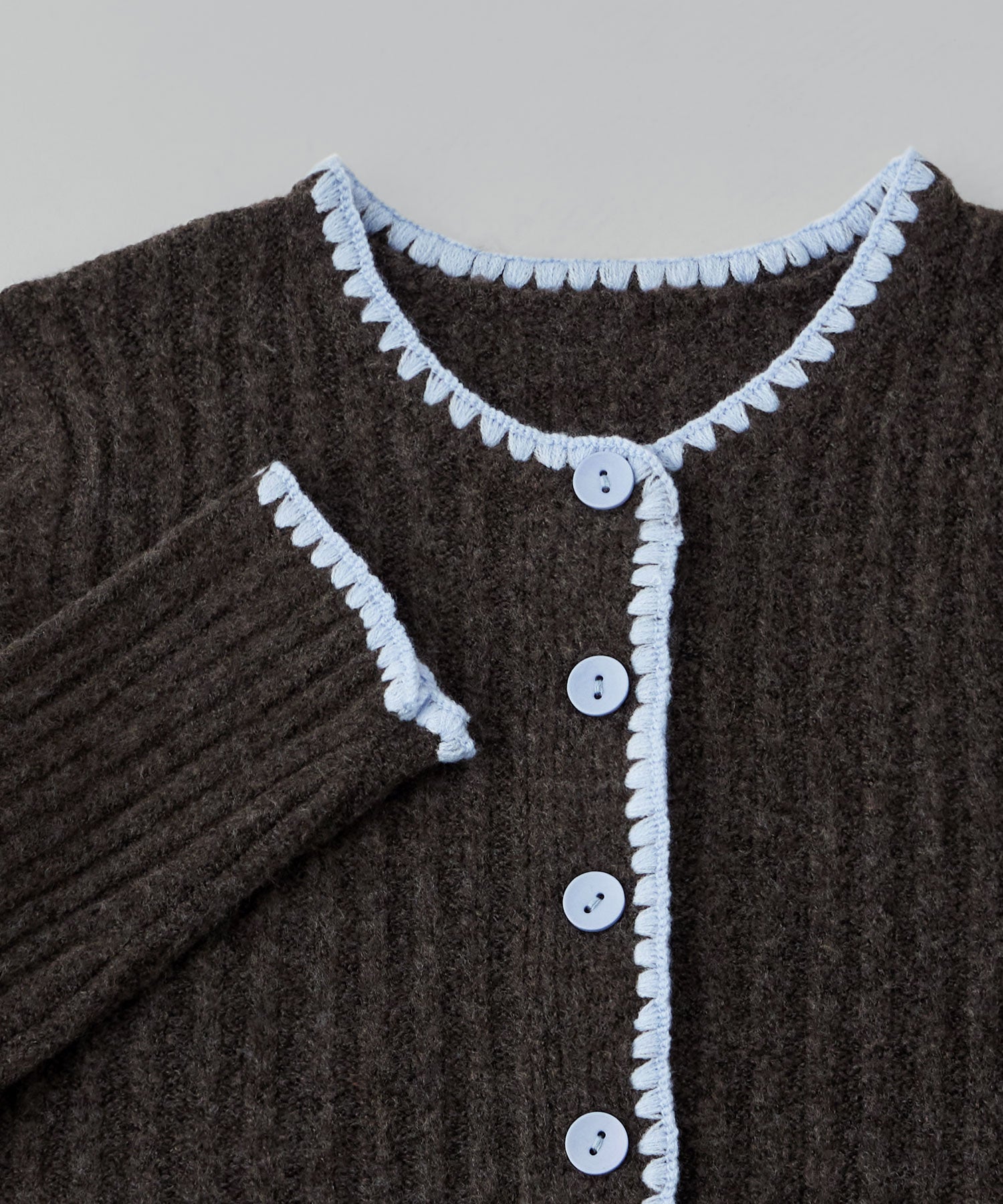 Rname 配色ステッチニットカーディガン トップス アウター カーディガン カーデ ニット リブニット 長袖 カラーカーデ バイカラー クルーネック リンガーネック 丸首 配色 タイト 伸縮性 前開き 羽織り