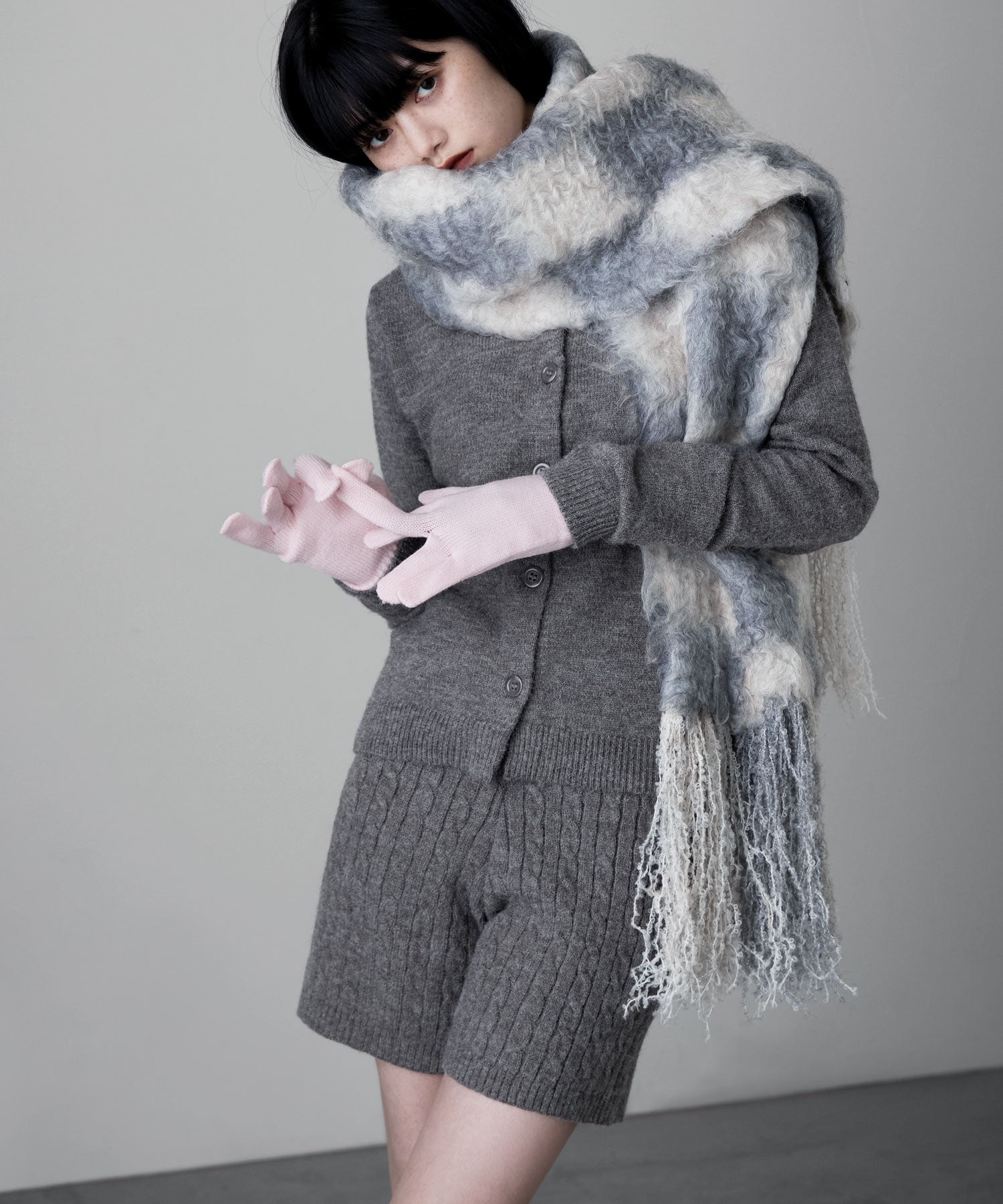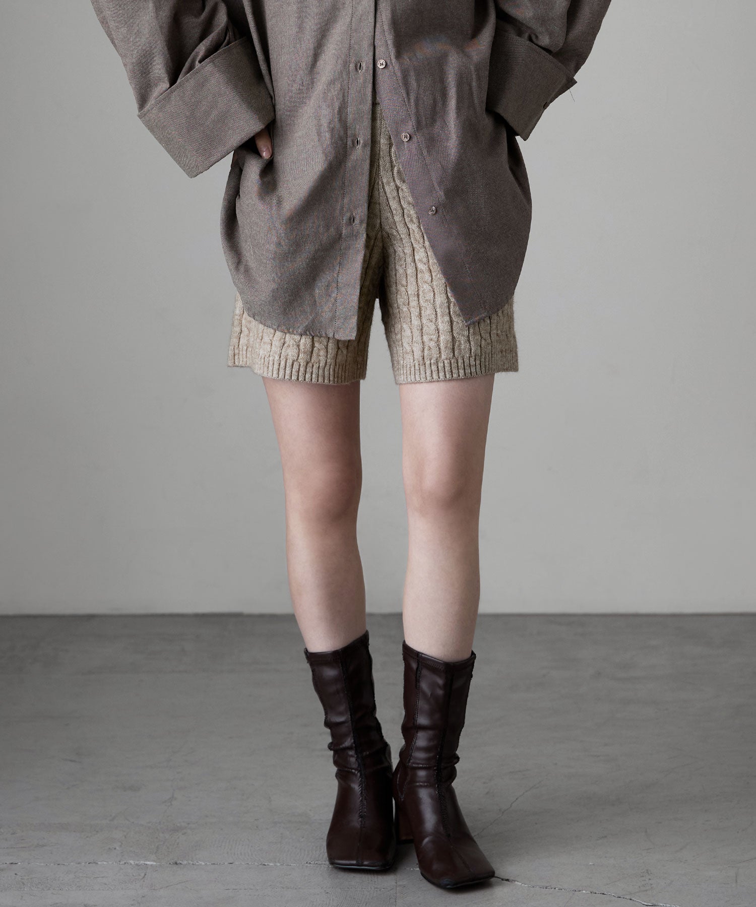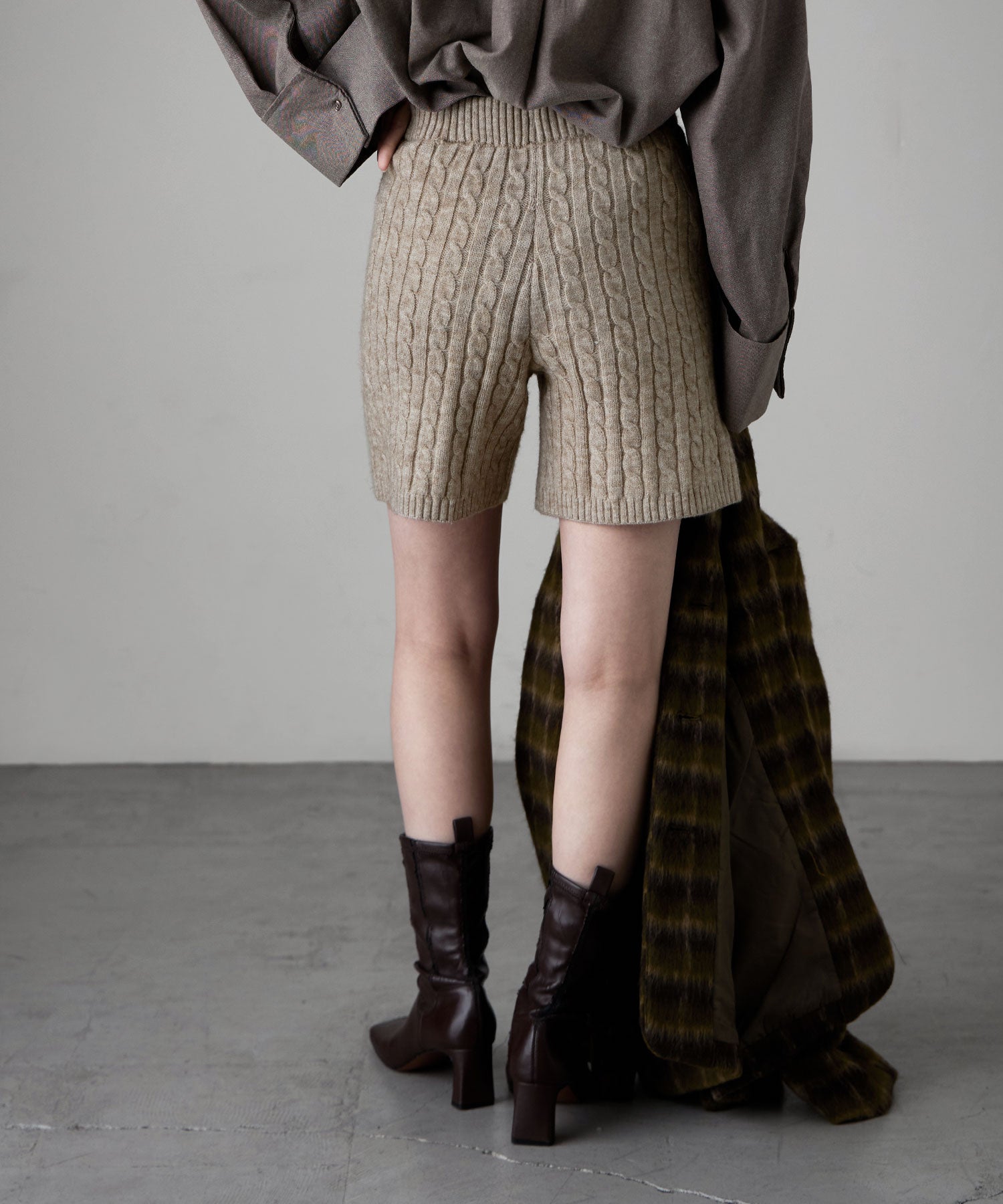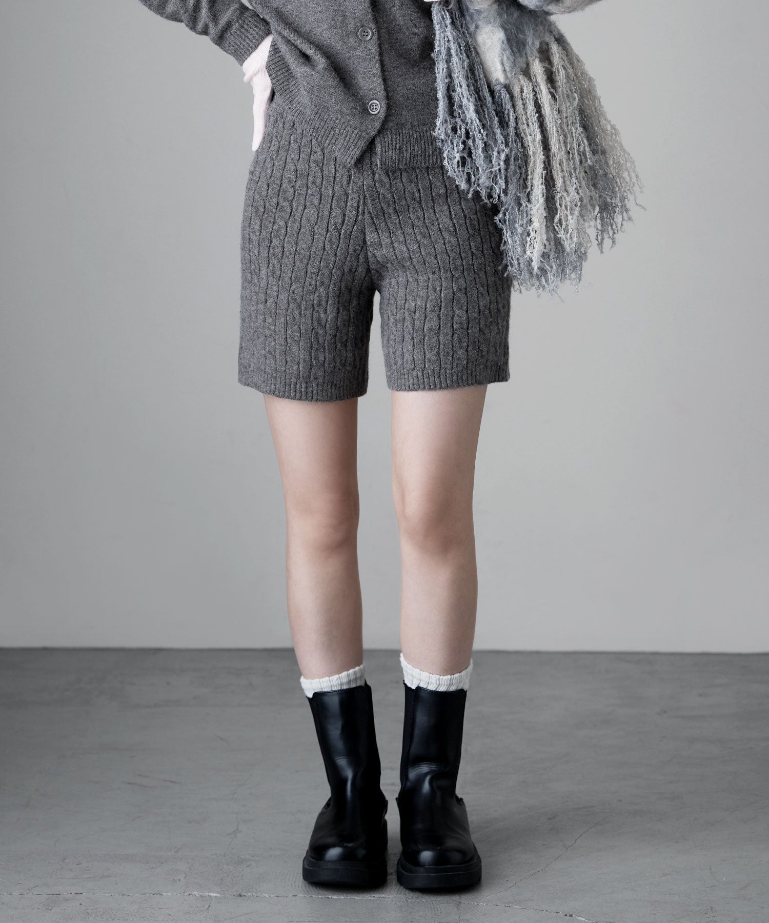 柔らかな印象のアルパカタッチのニット素材で、ケーブル編みの柄模様が目を惹くショートパンツ。