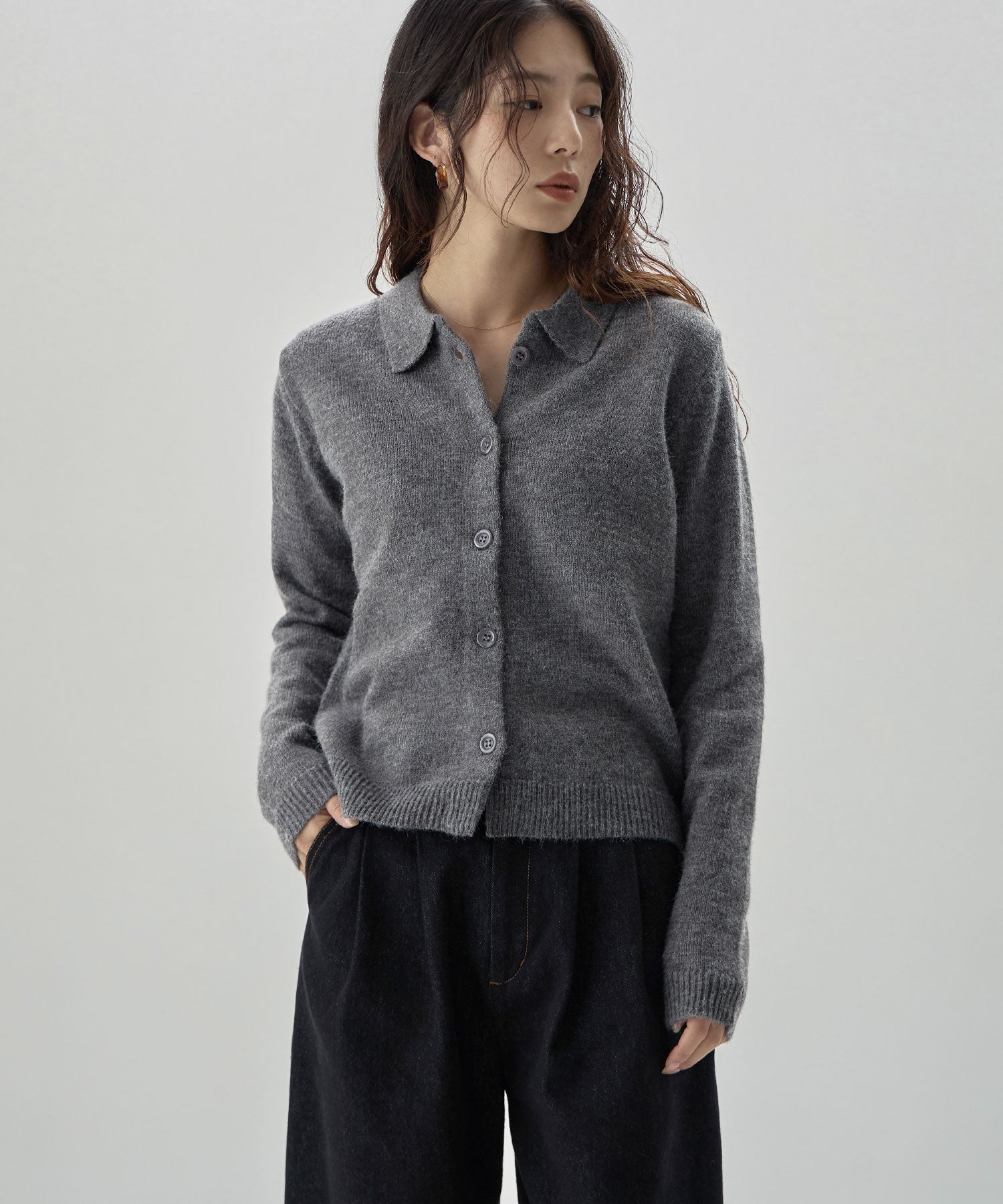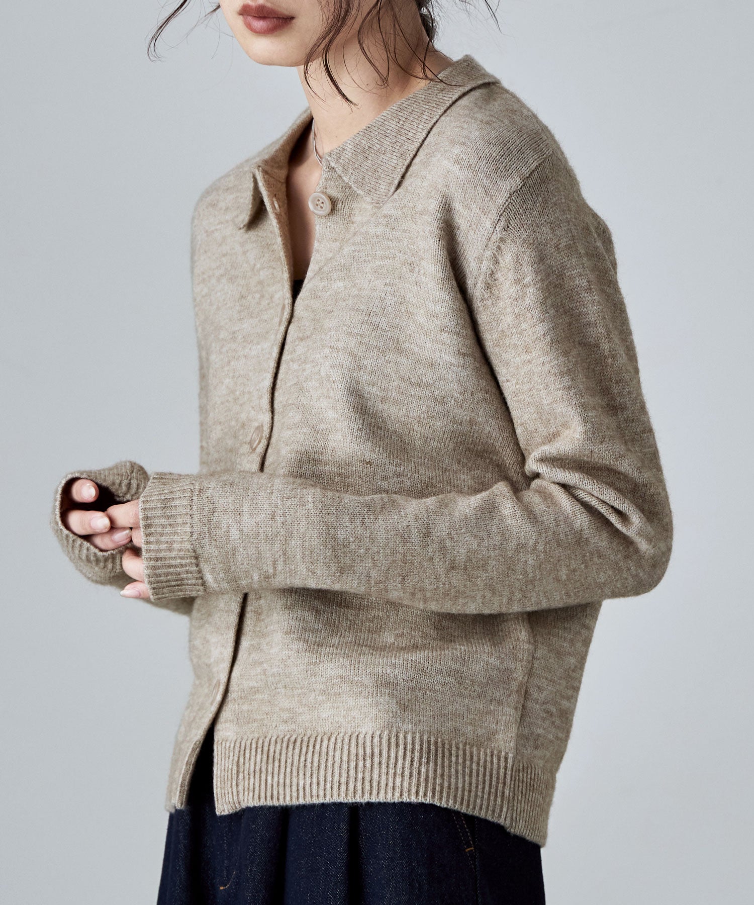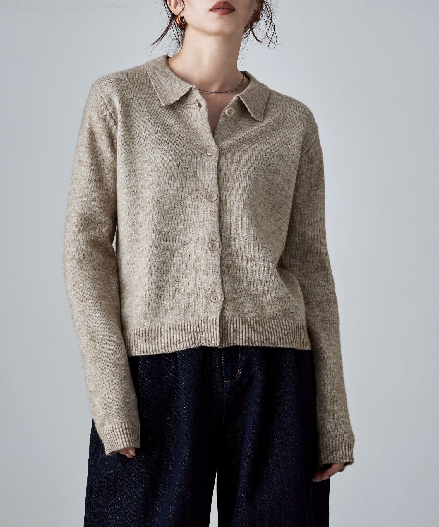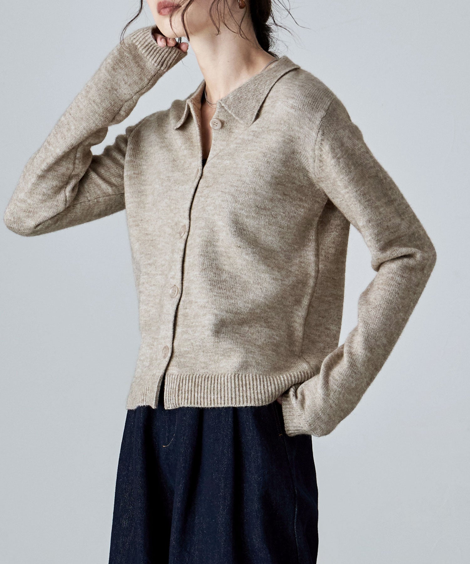 柔らかなアルパカタッチの素材で仕立てた、ポロ襟ニットカーディガン。