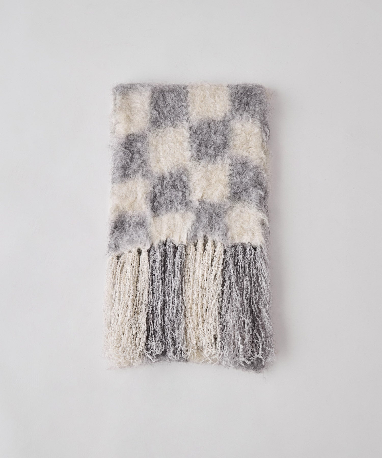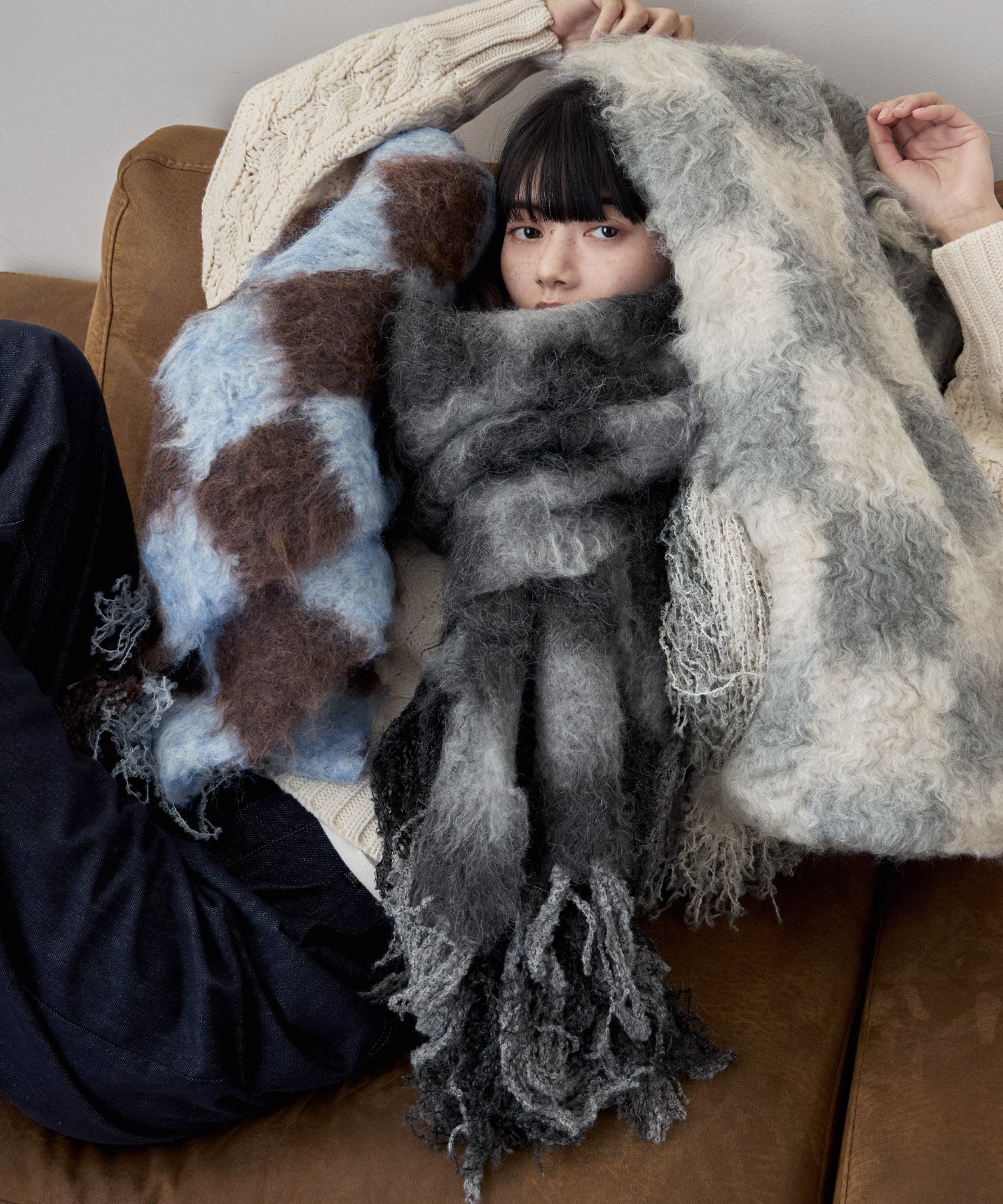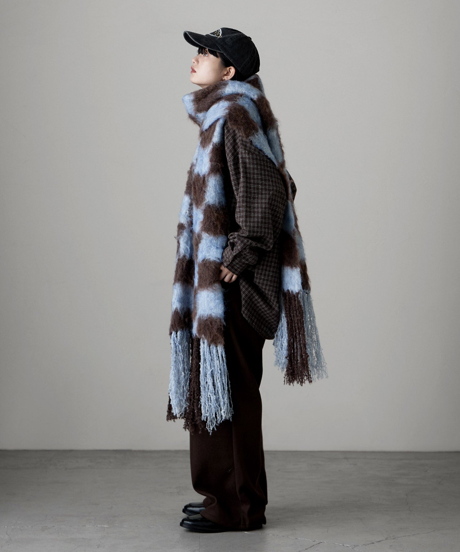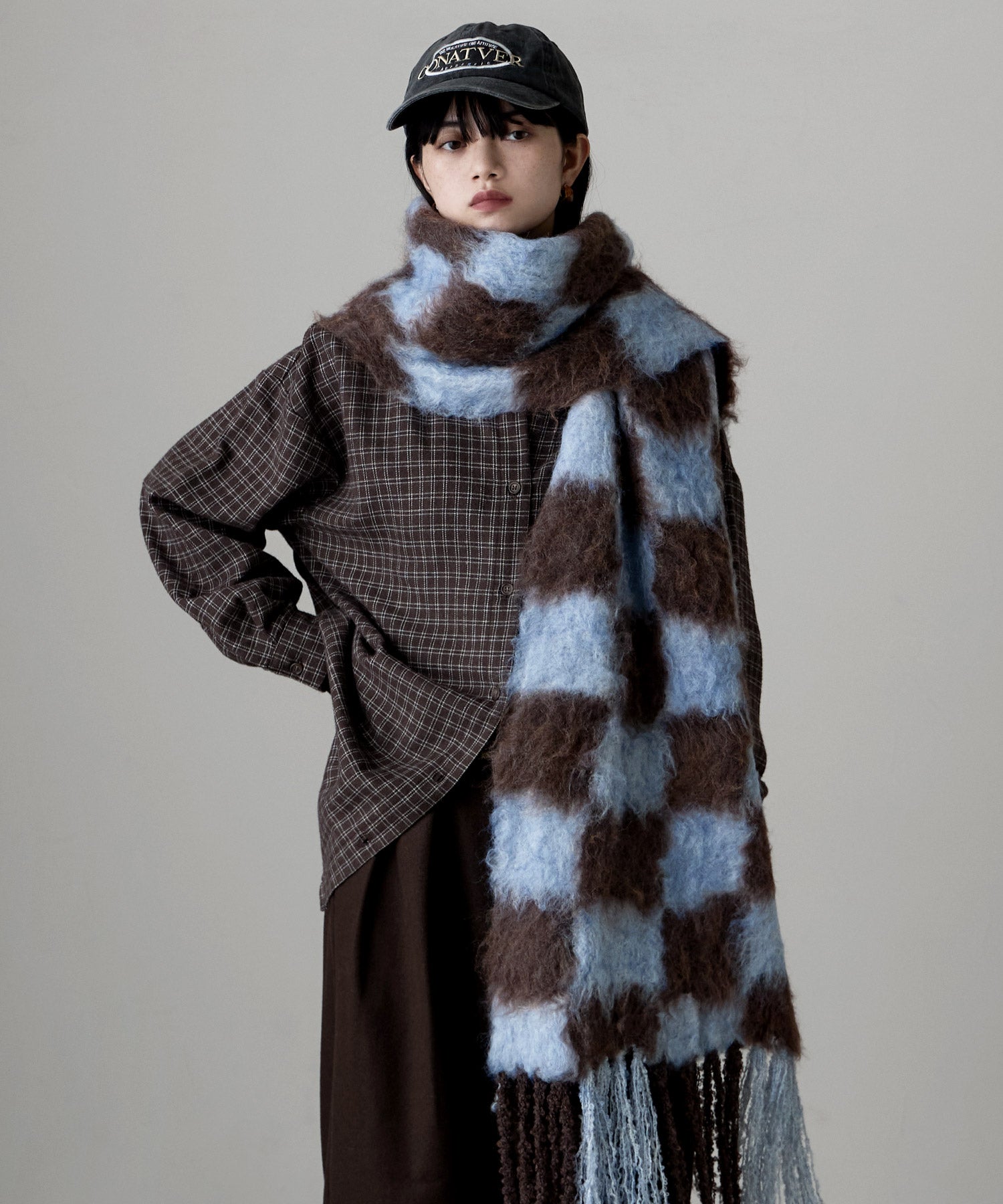 顔が埋もれるくらいふわりとした素材感で、主役級の存在感を発揮してくれるチェッカーボードマフラー。