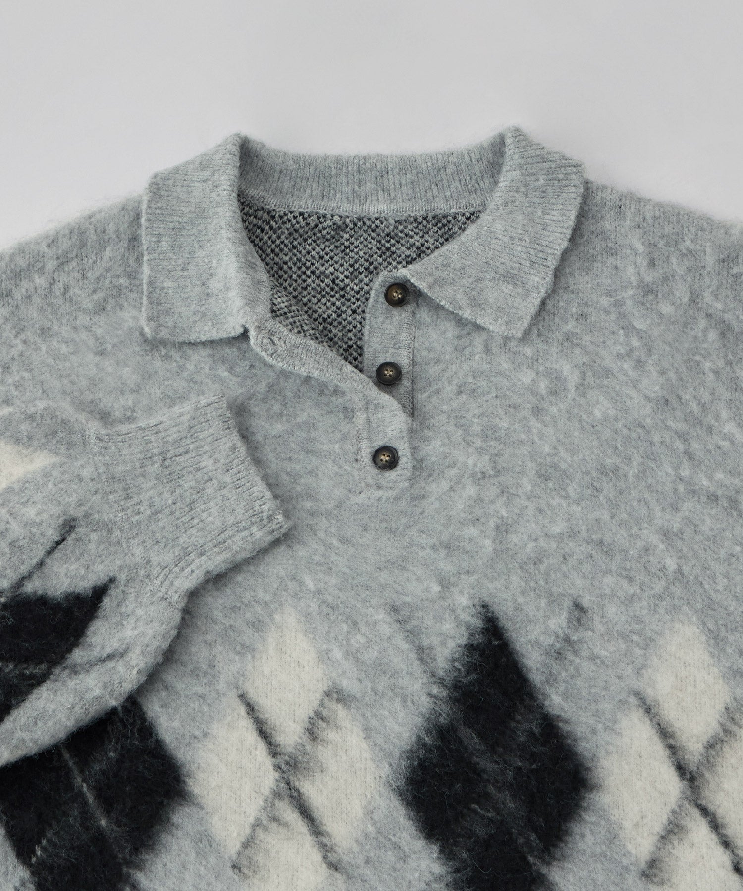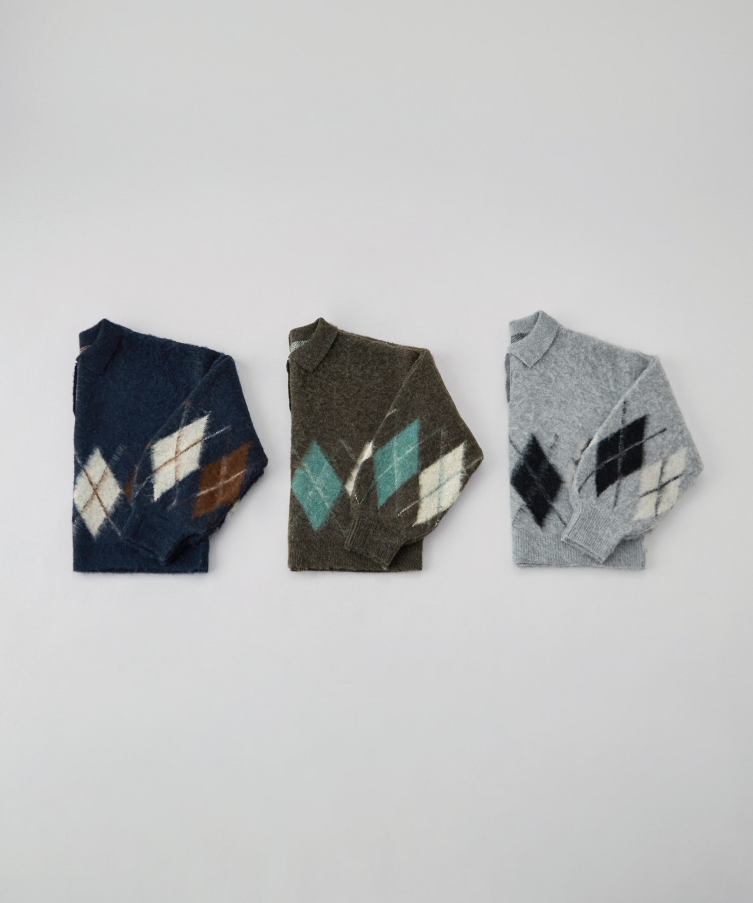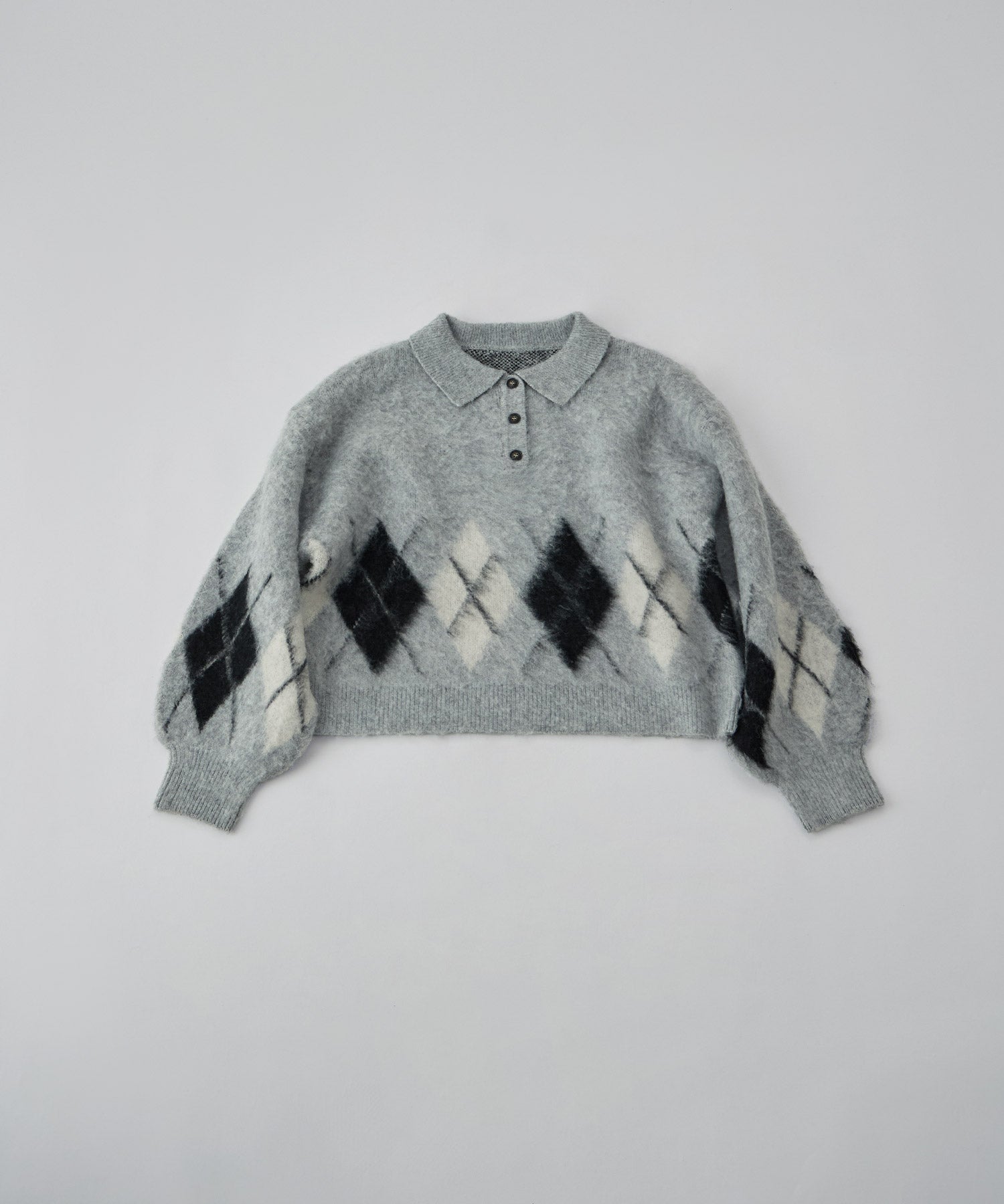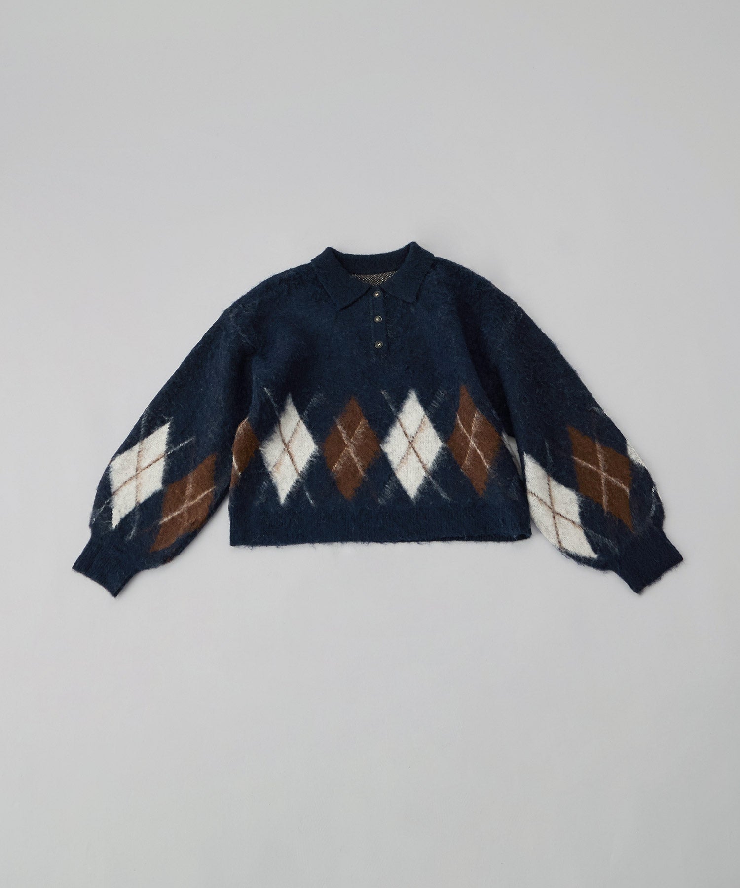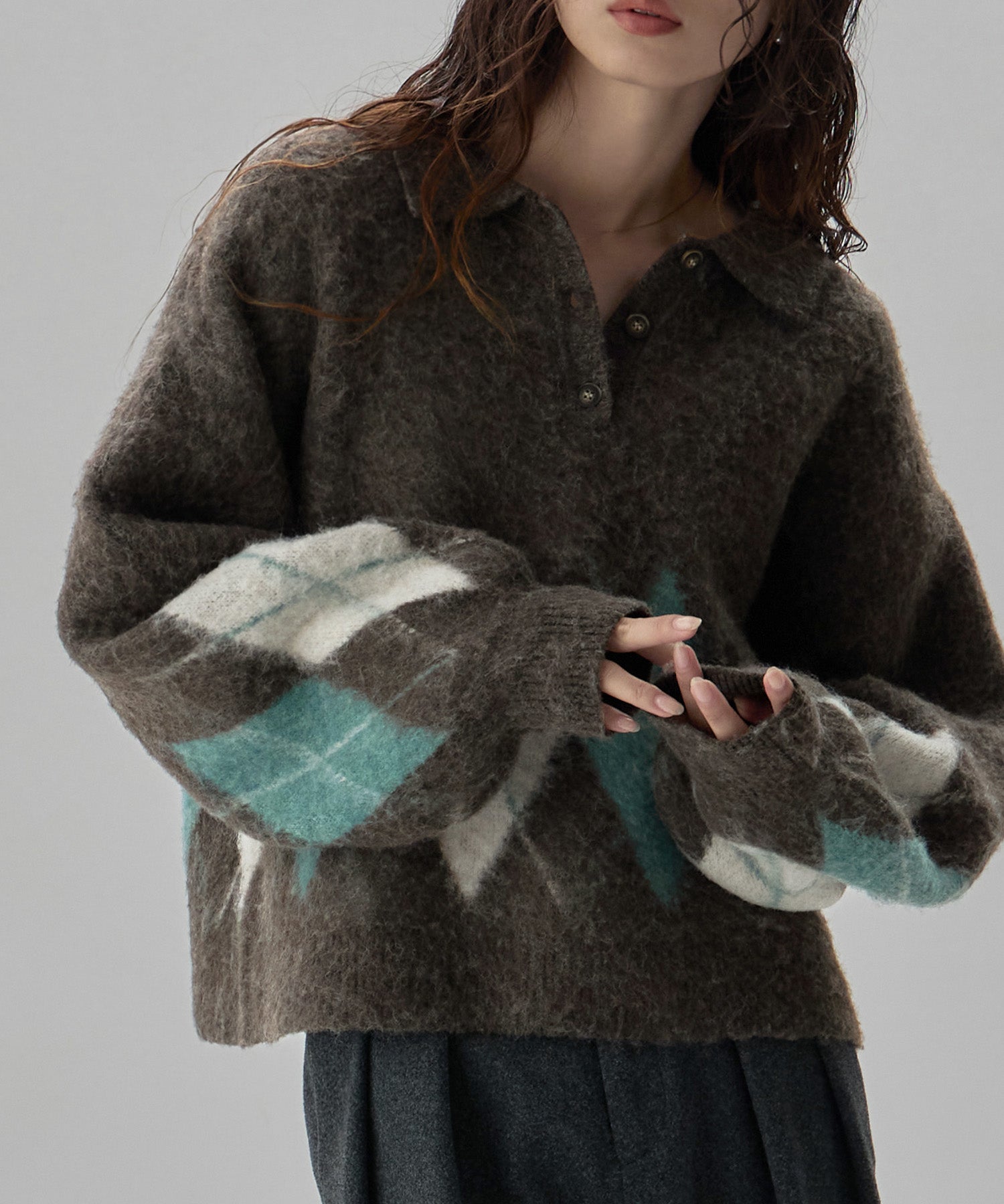 ダッドニットのようなボリューム感が可愛い、アーガイル柄のポロニット。