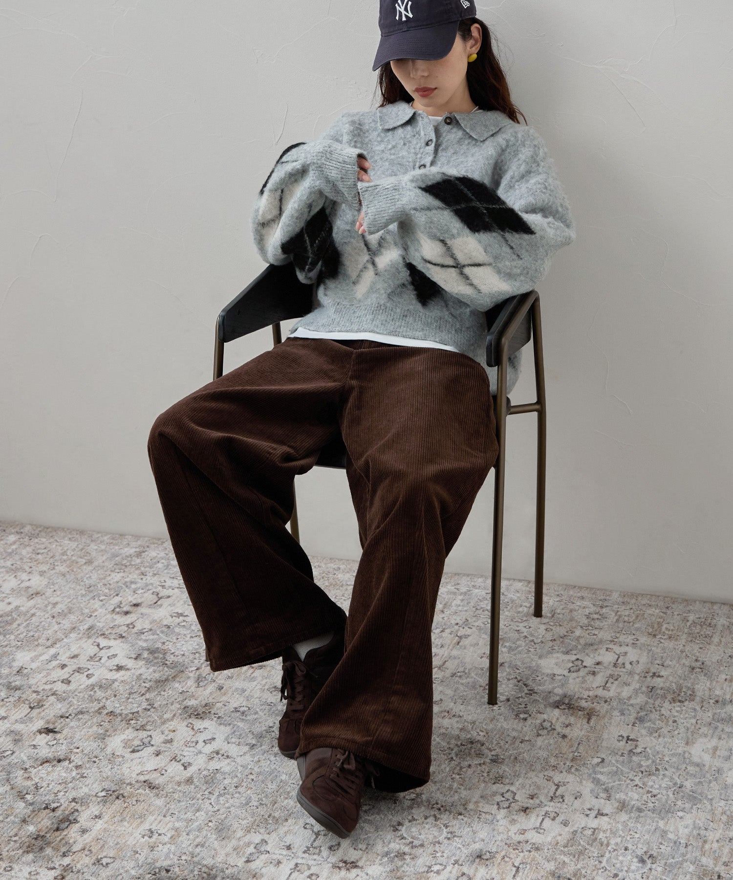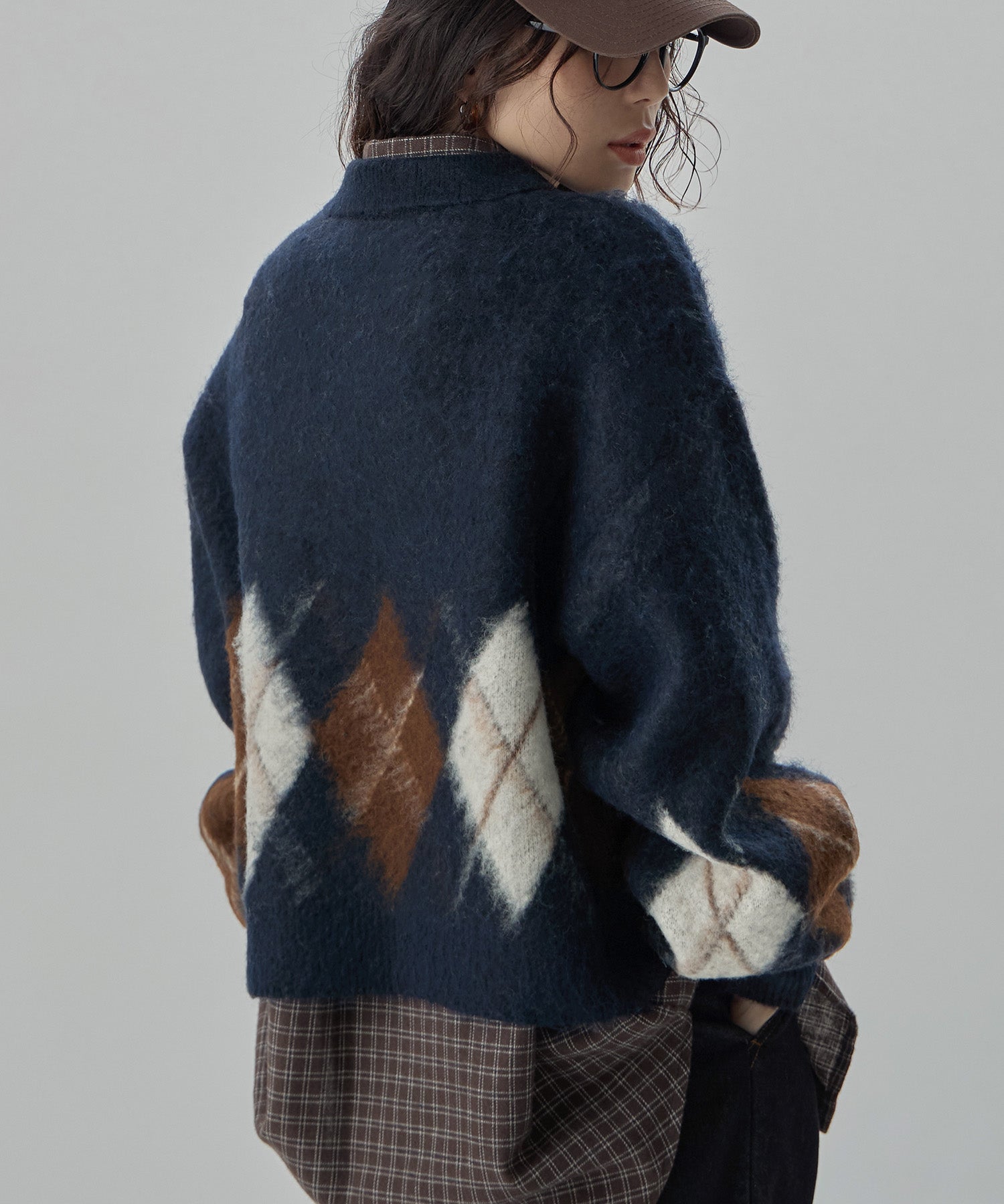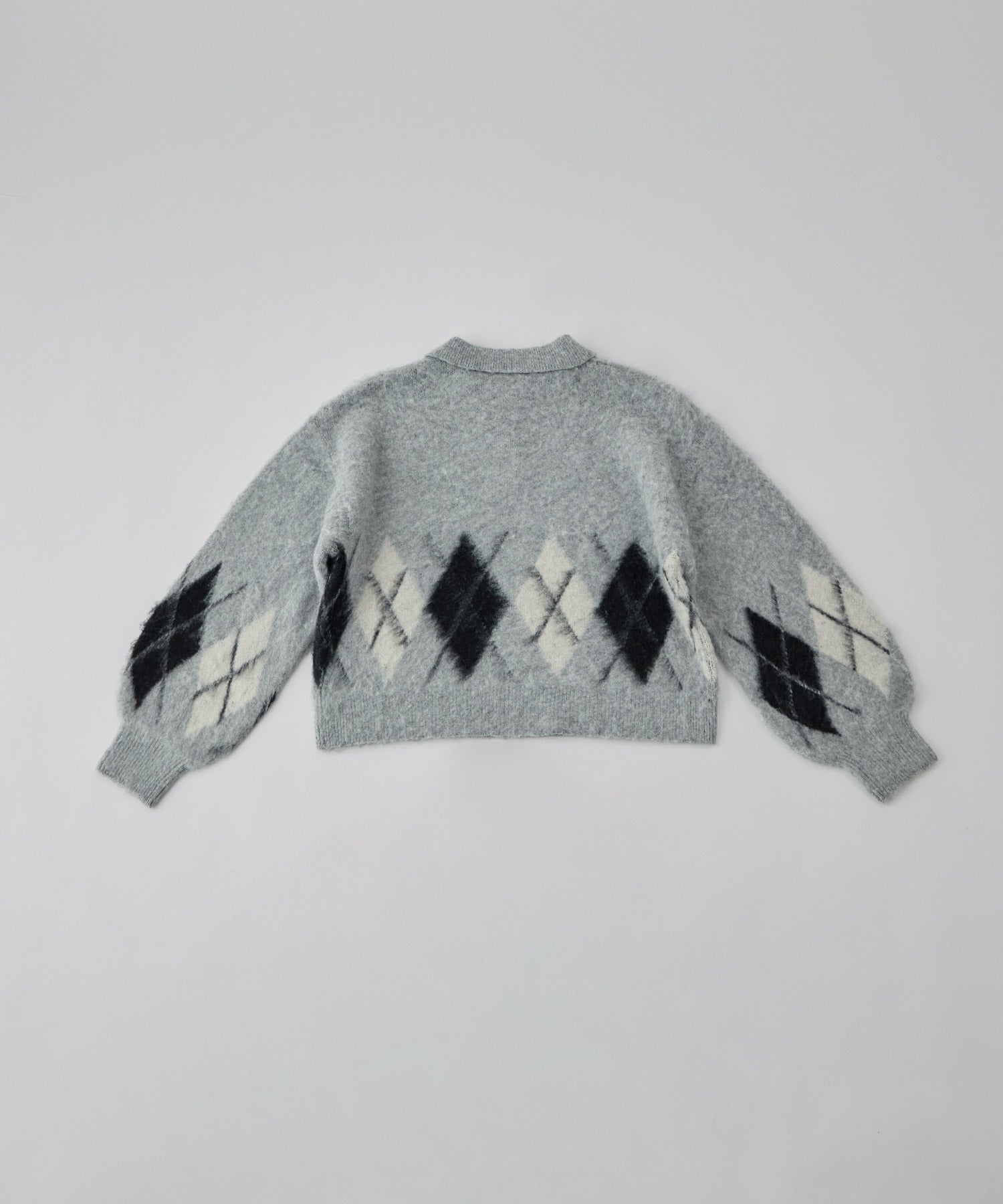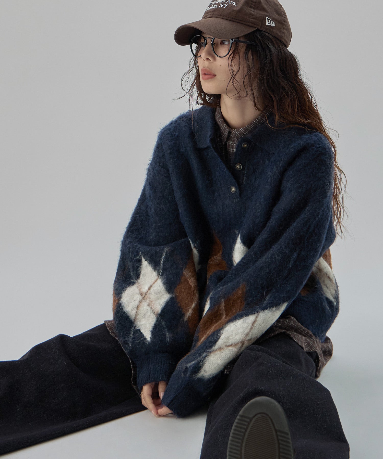 ダッドニットのようなボリューム感が可愛い、アーガイル柄のポロニット。