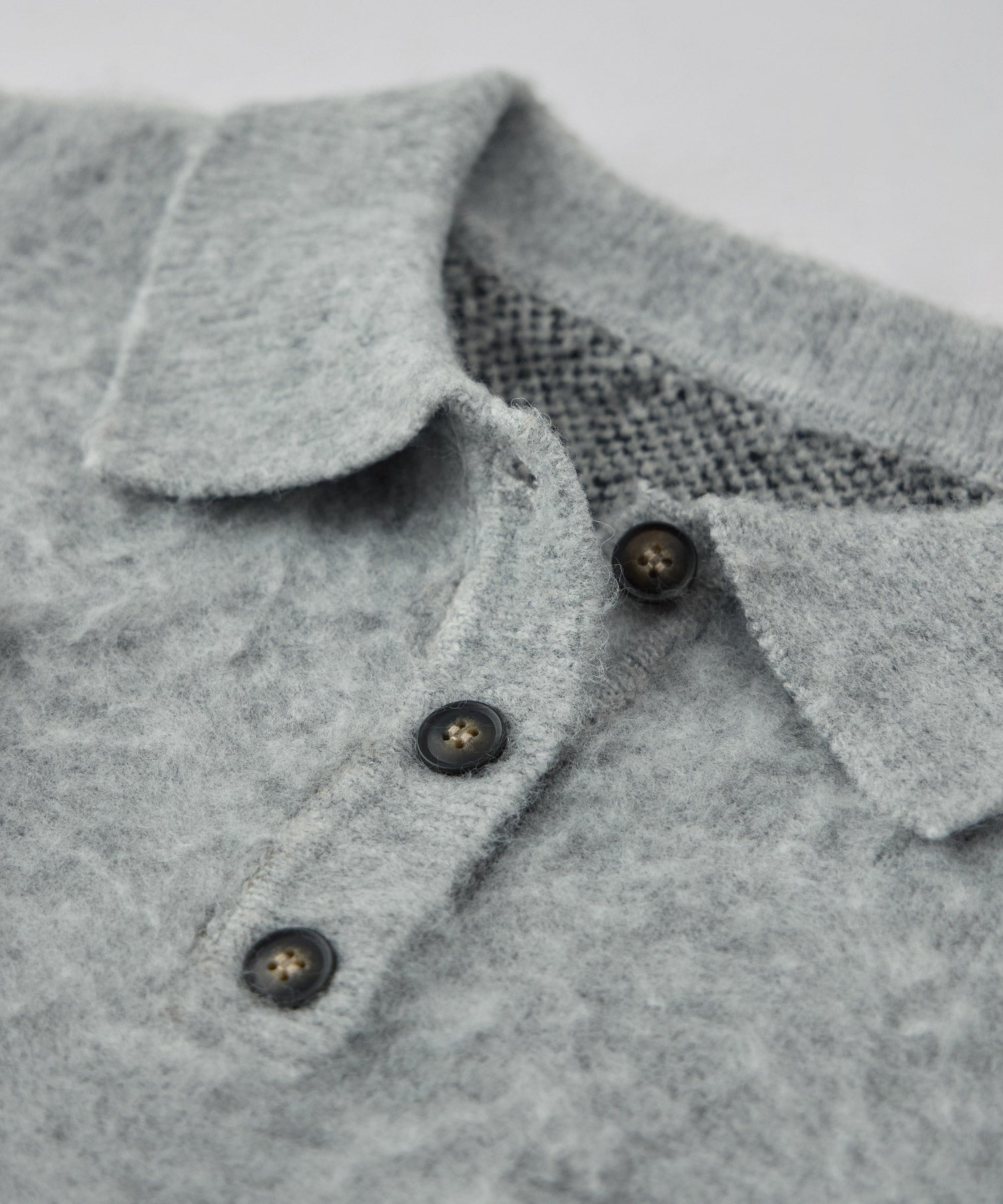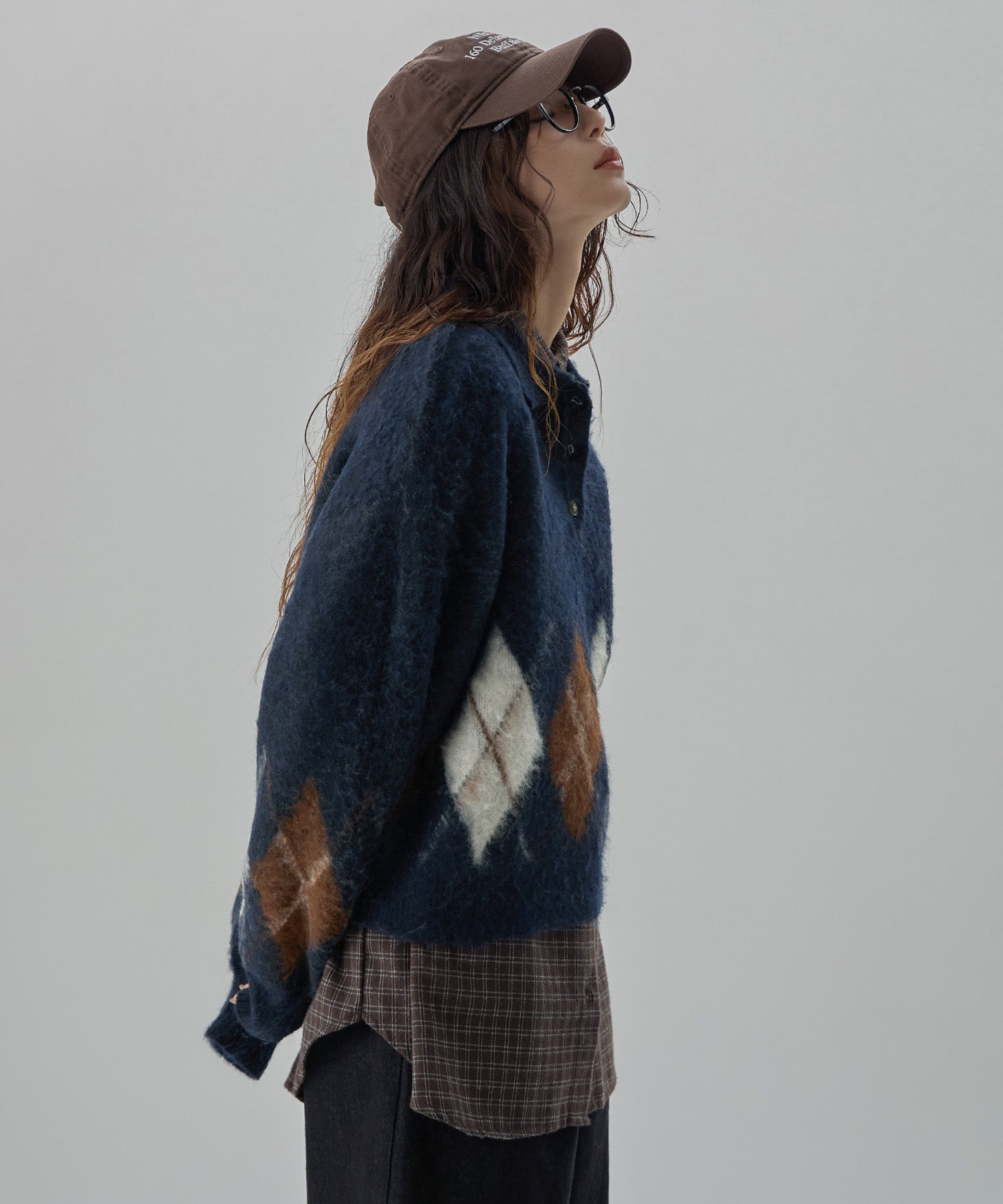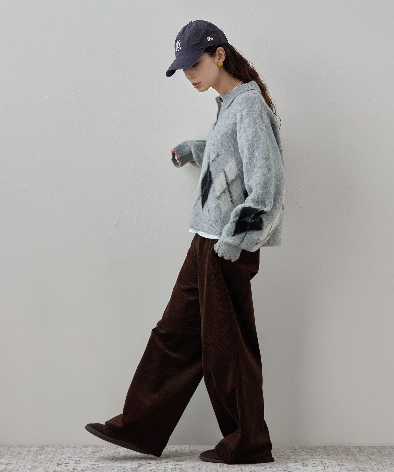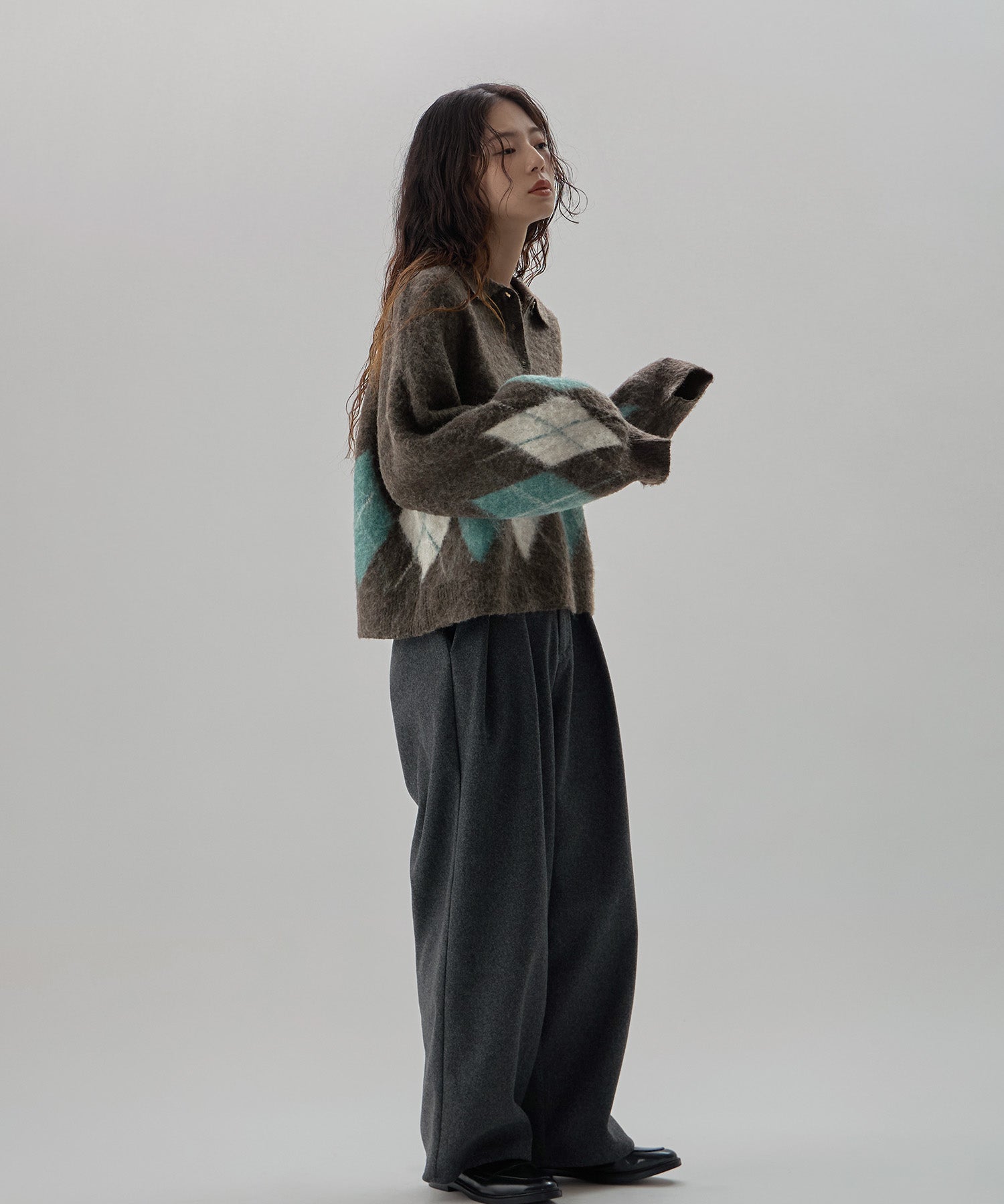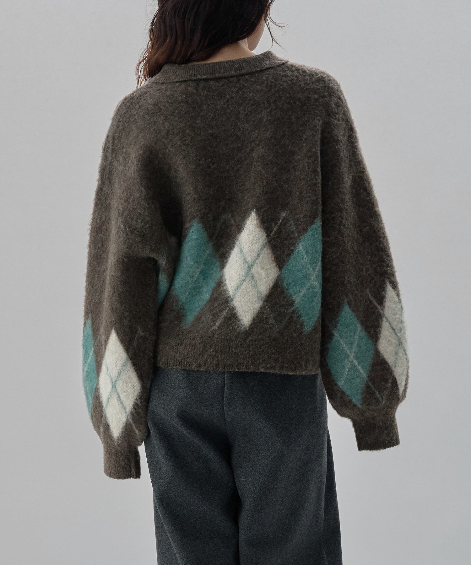 ダッドニットのようなボリューム感が可愛い、アーガイル柄のポロニット。