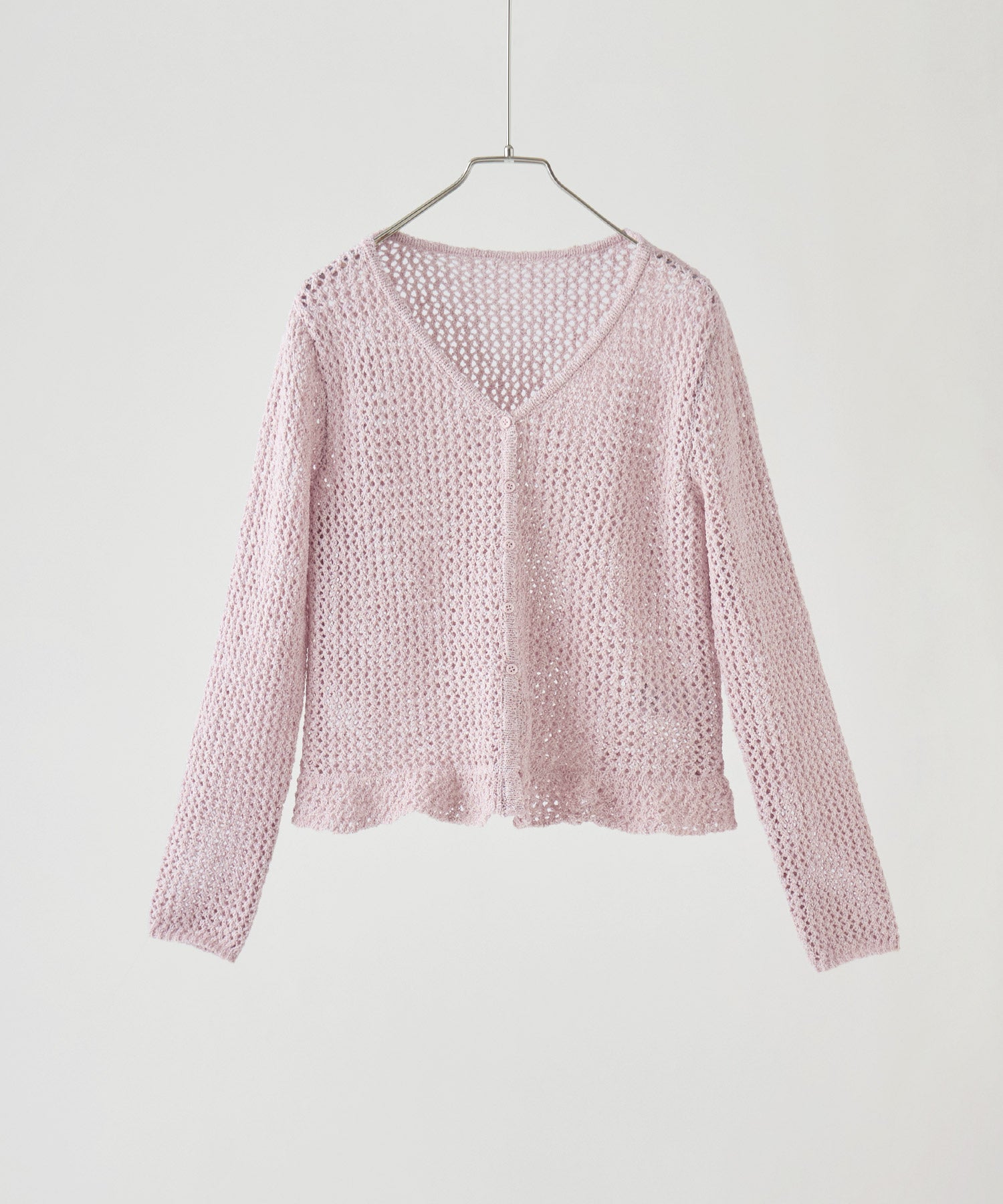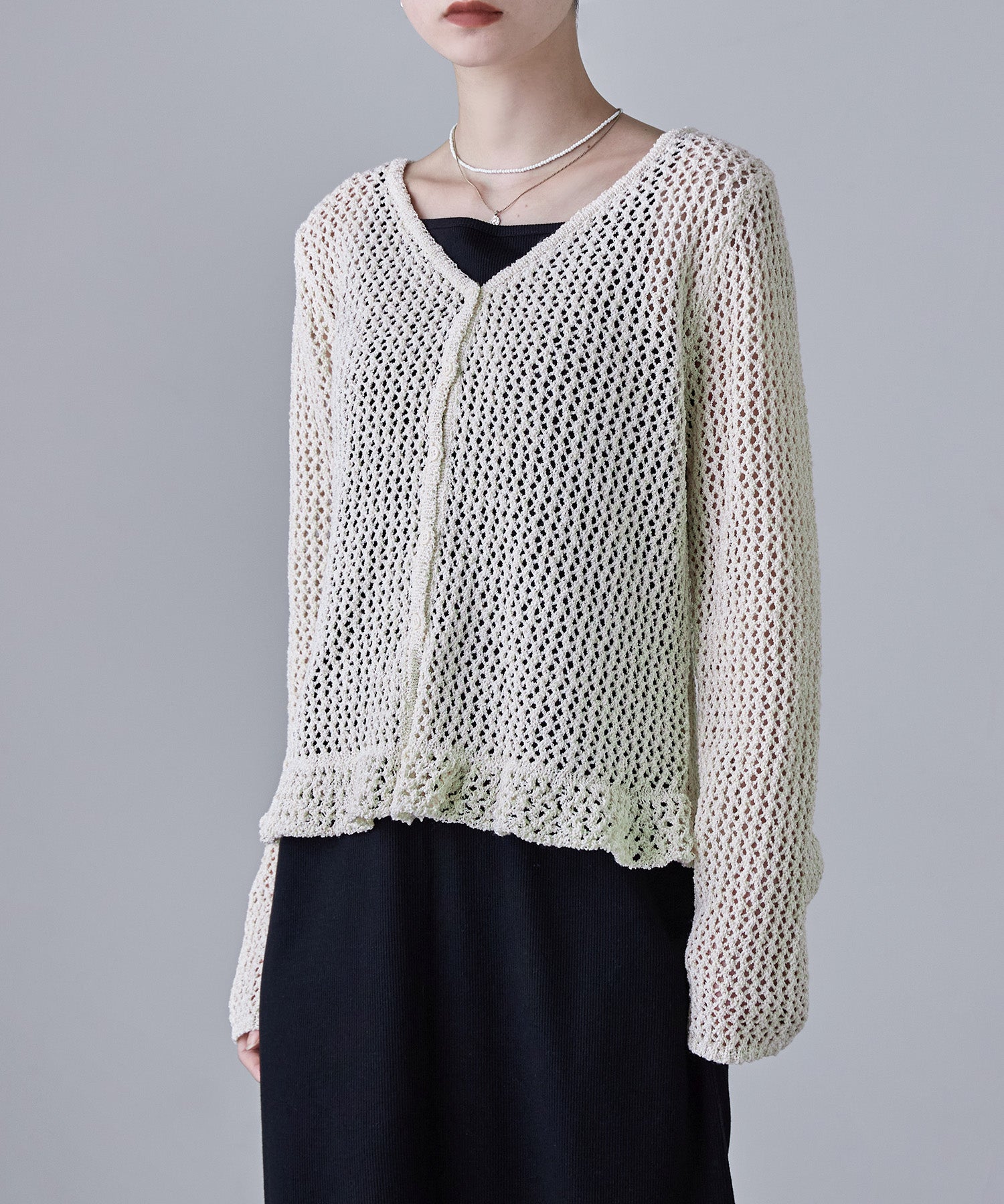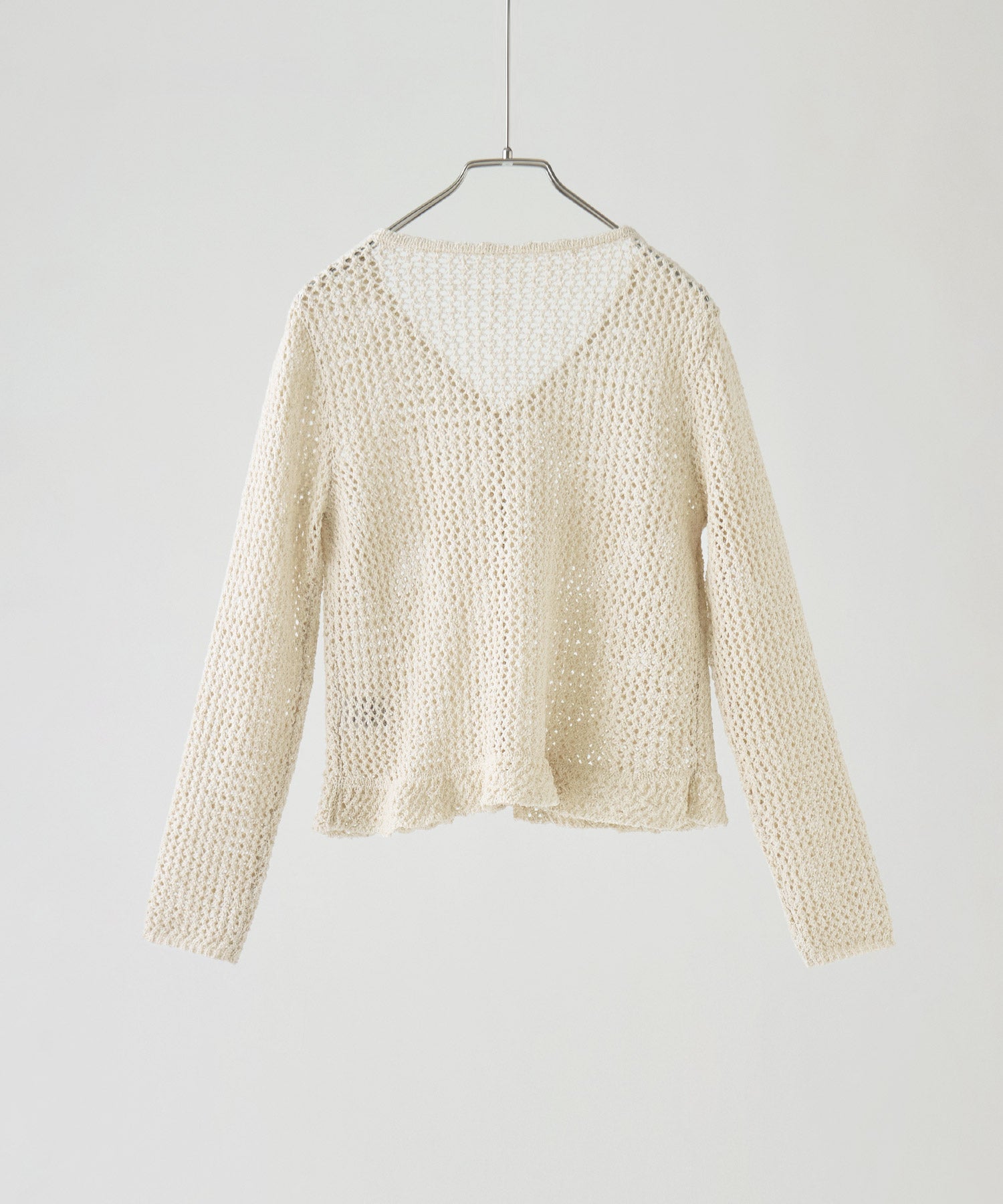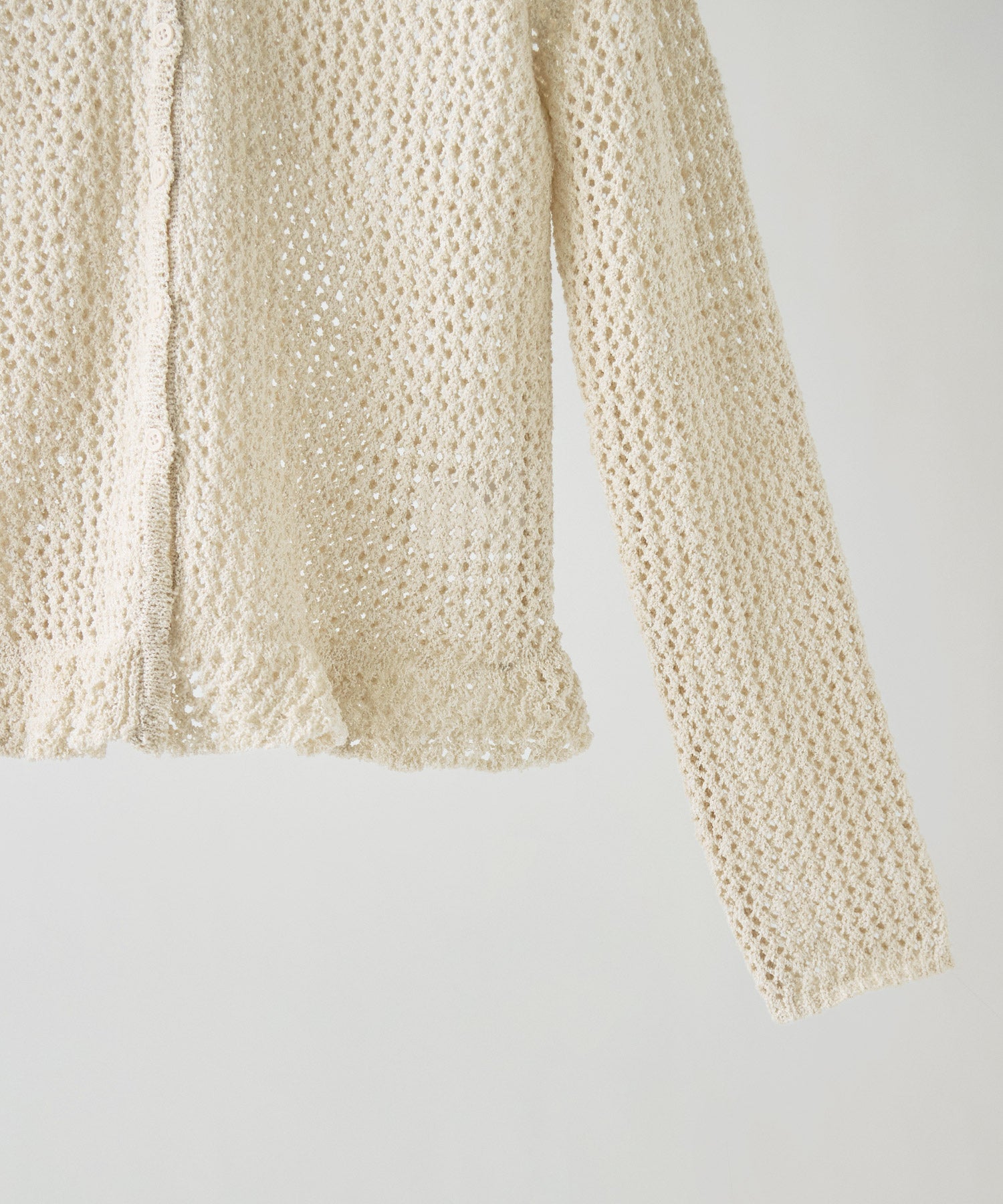 裾のフリルデザインが目を惹く、メッシュ編みのVネックカーディガン。