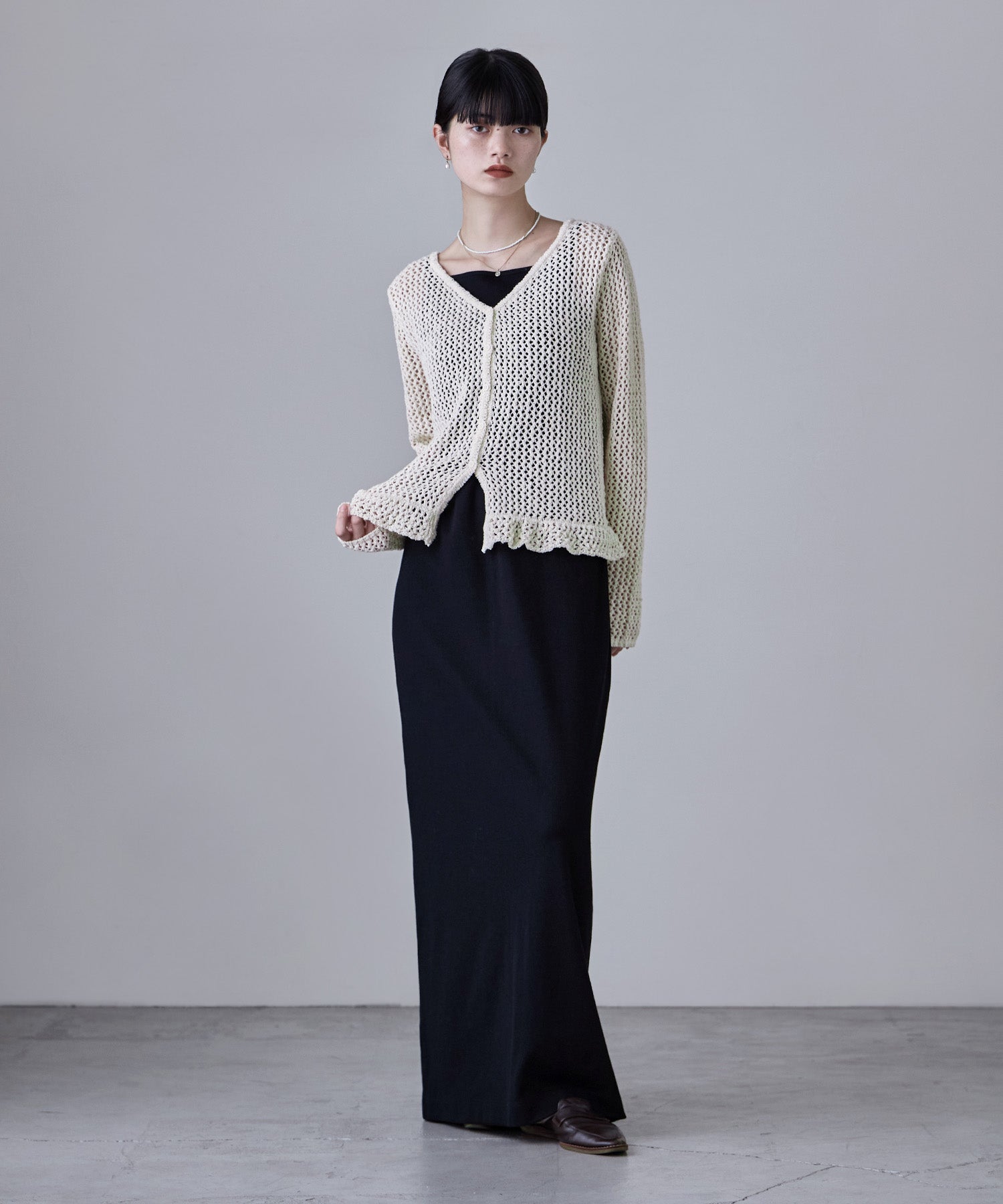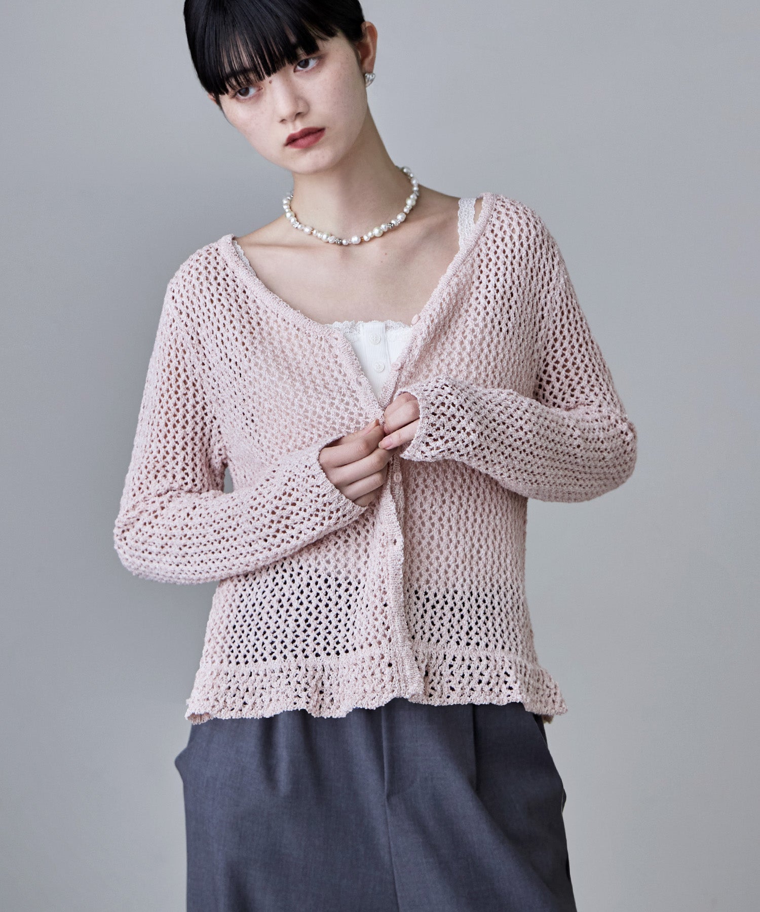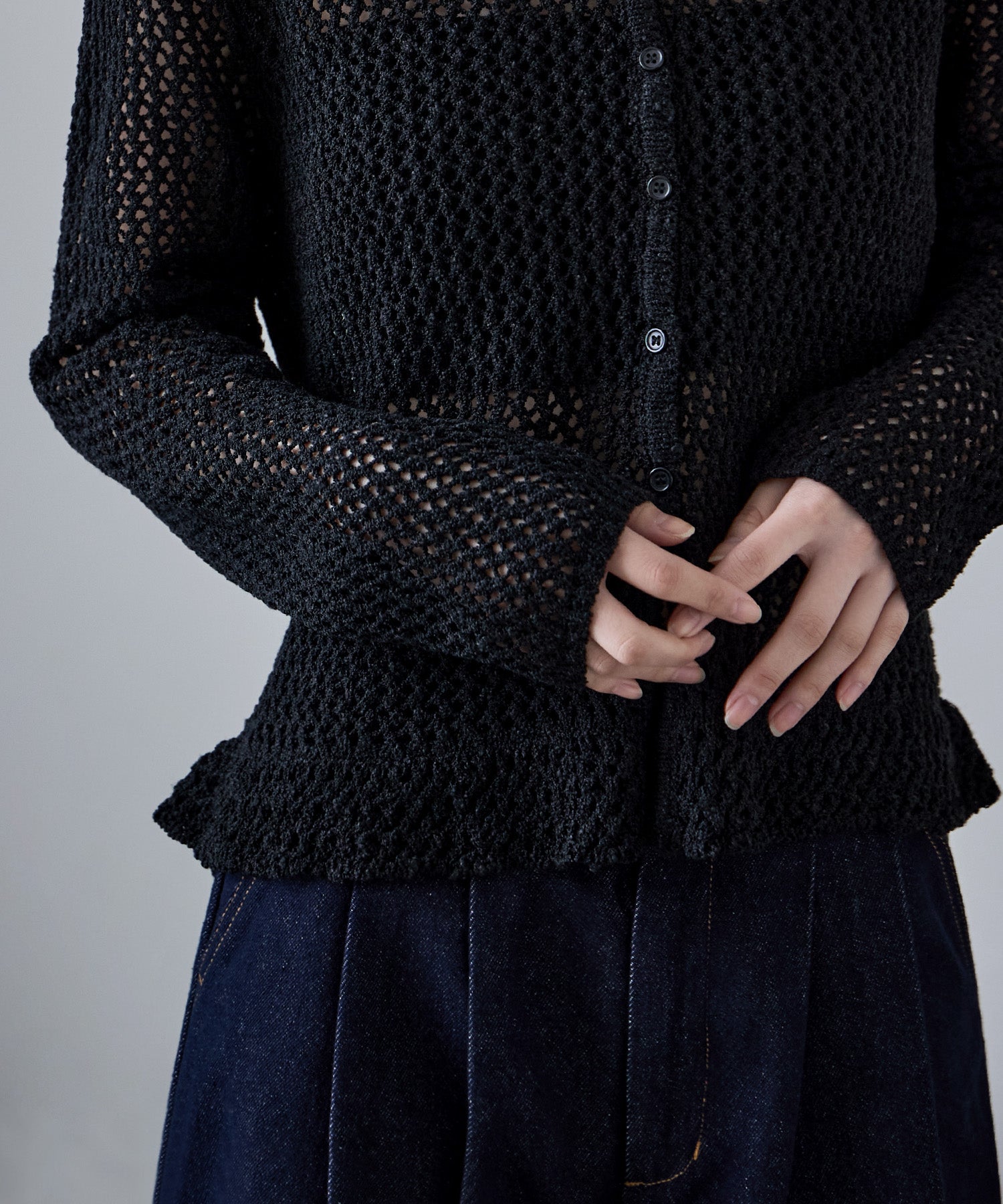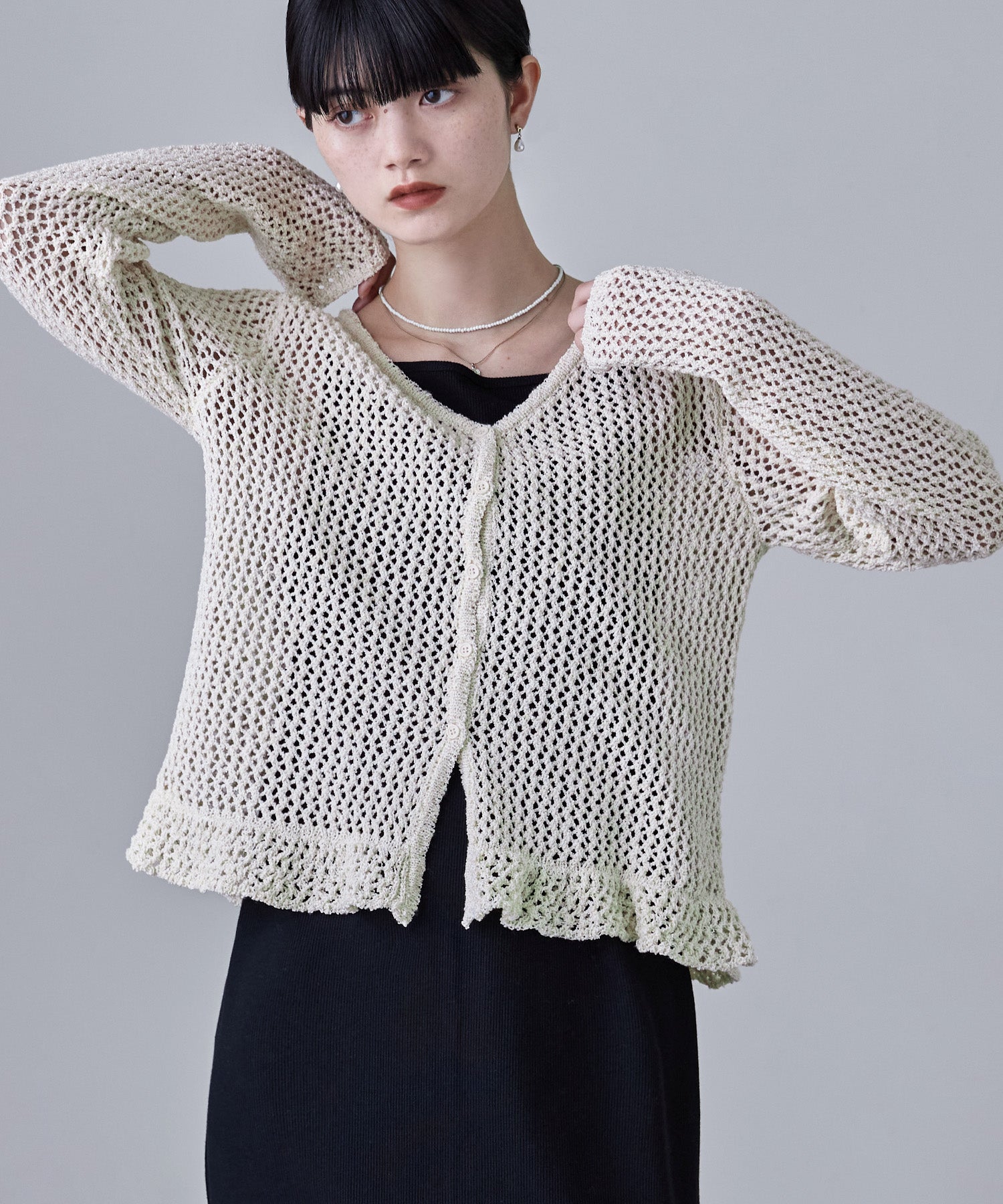 裾のフリルデザインが目を惹く、メッシュ編みのVネックカーディガン。