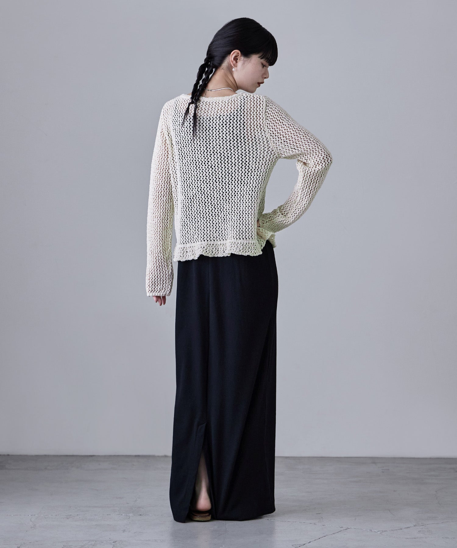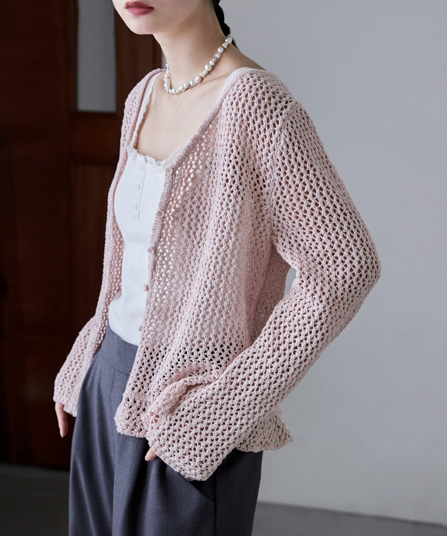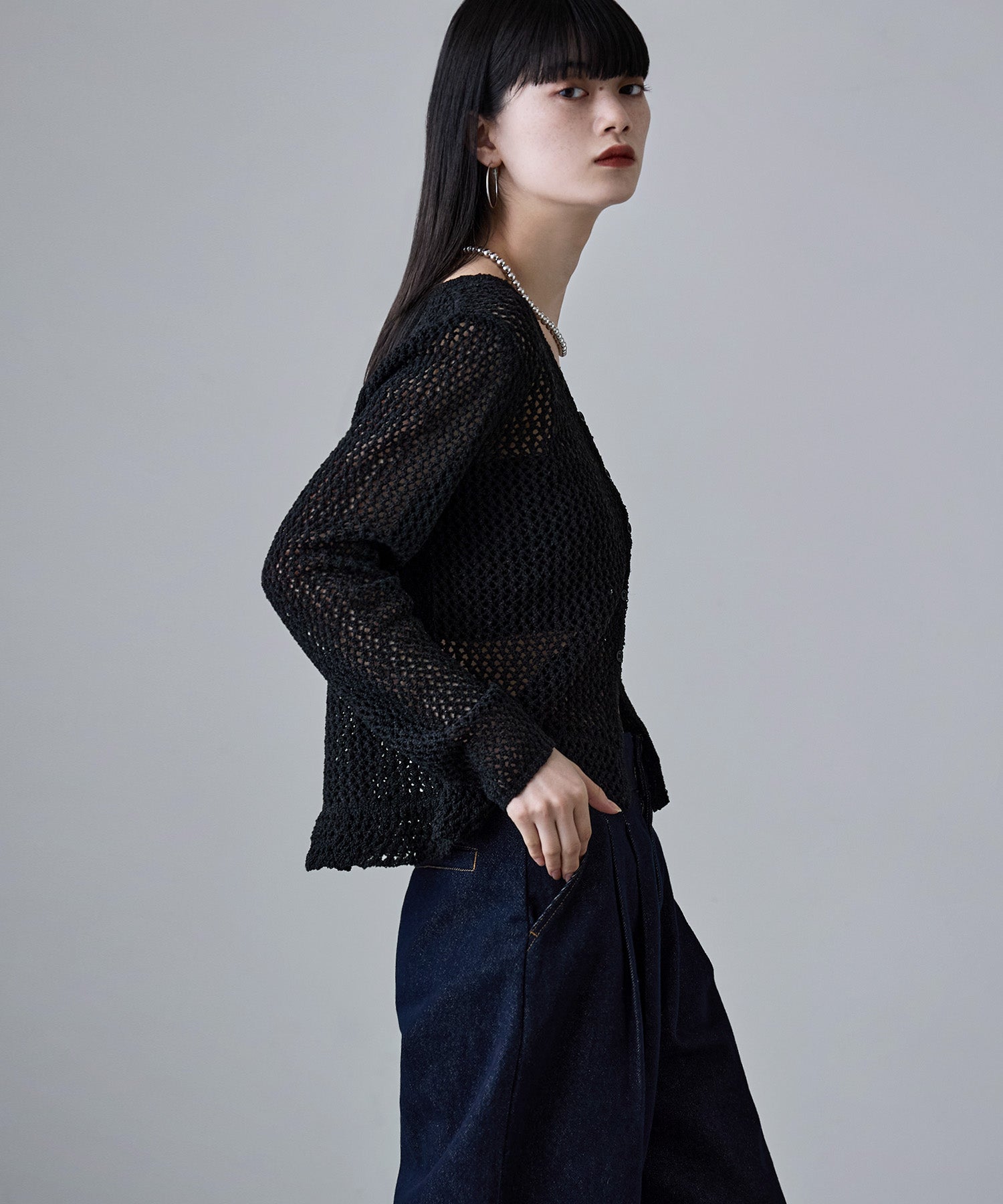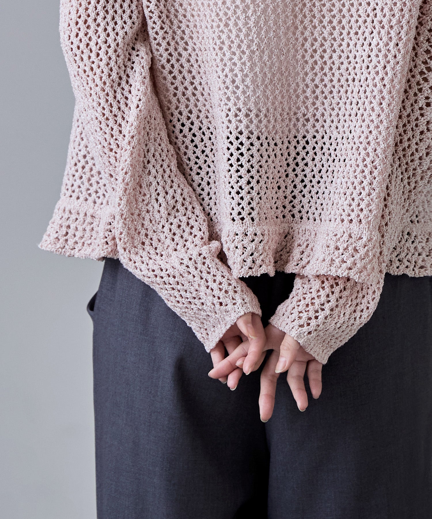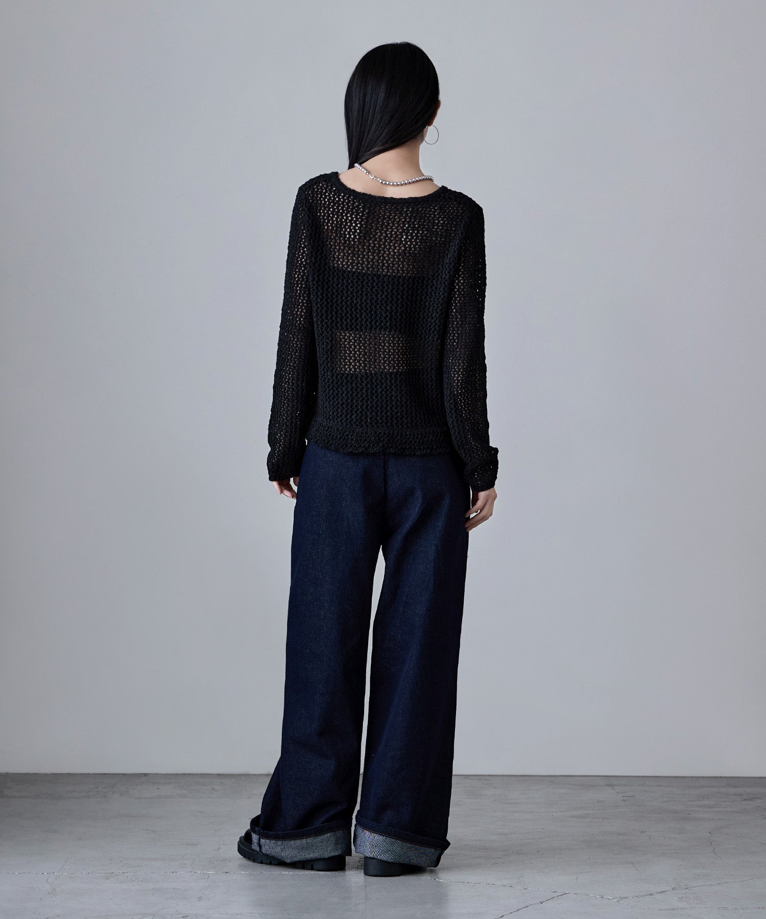 隙間からのぞく程度の肌と、ニットならではのドライな風合いのおかげで「透け」をカジュアルダウン。