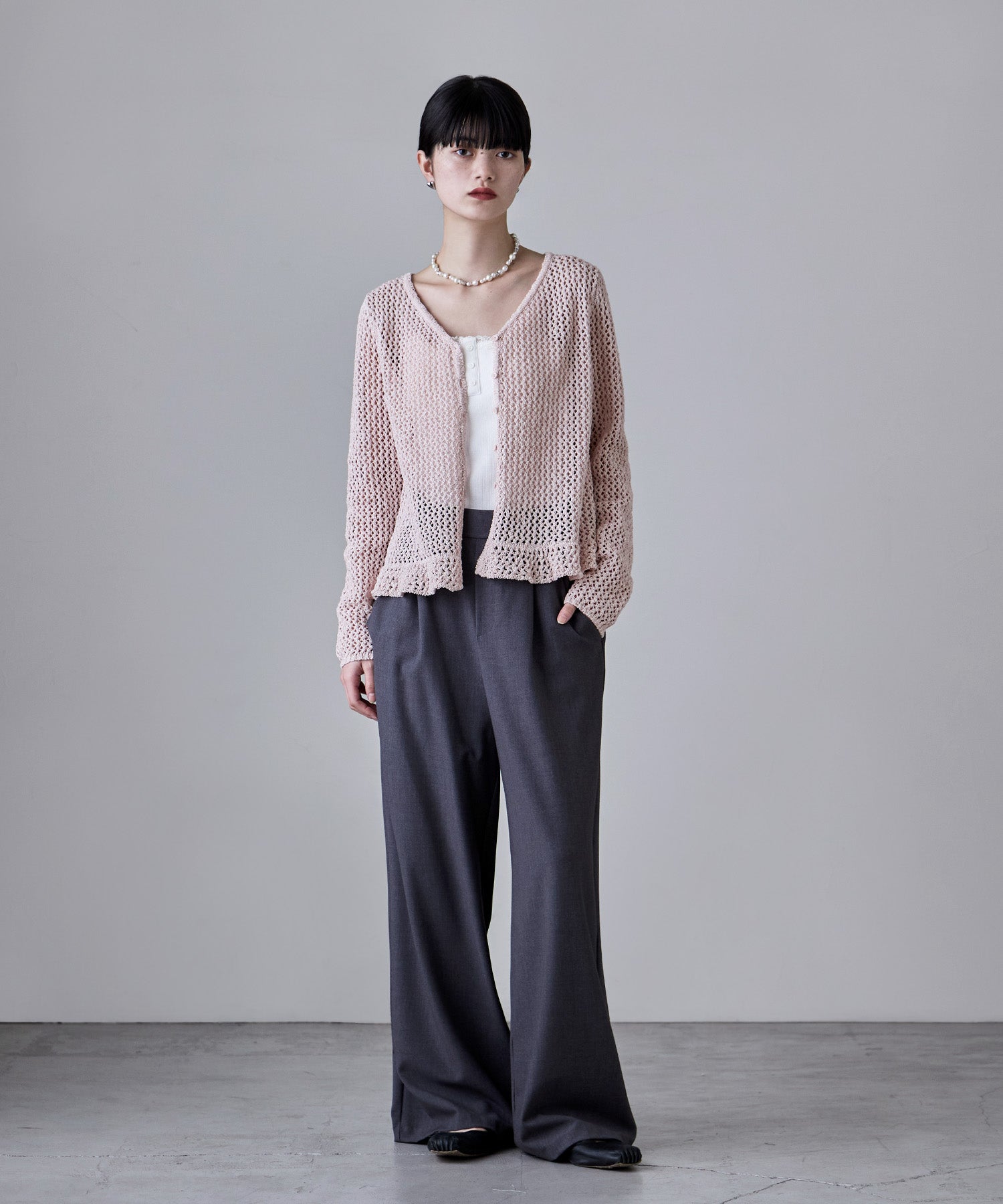 ボリュームを控えたフリルデザインのさりげない甘さはスタイリングに馴染みやすく、