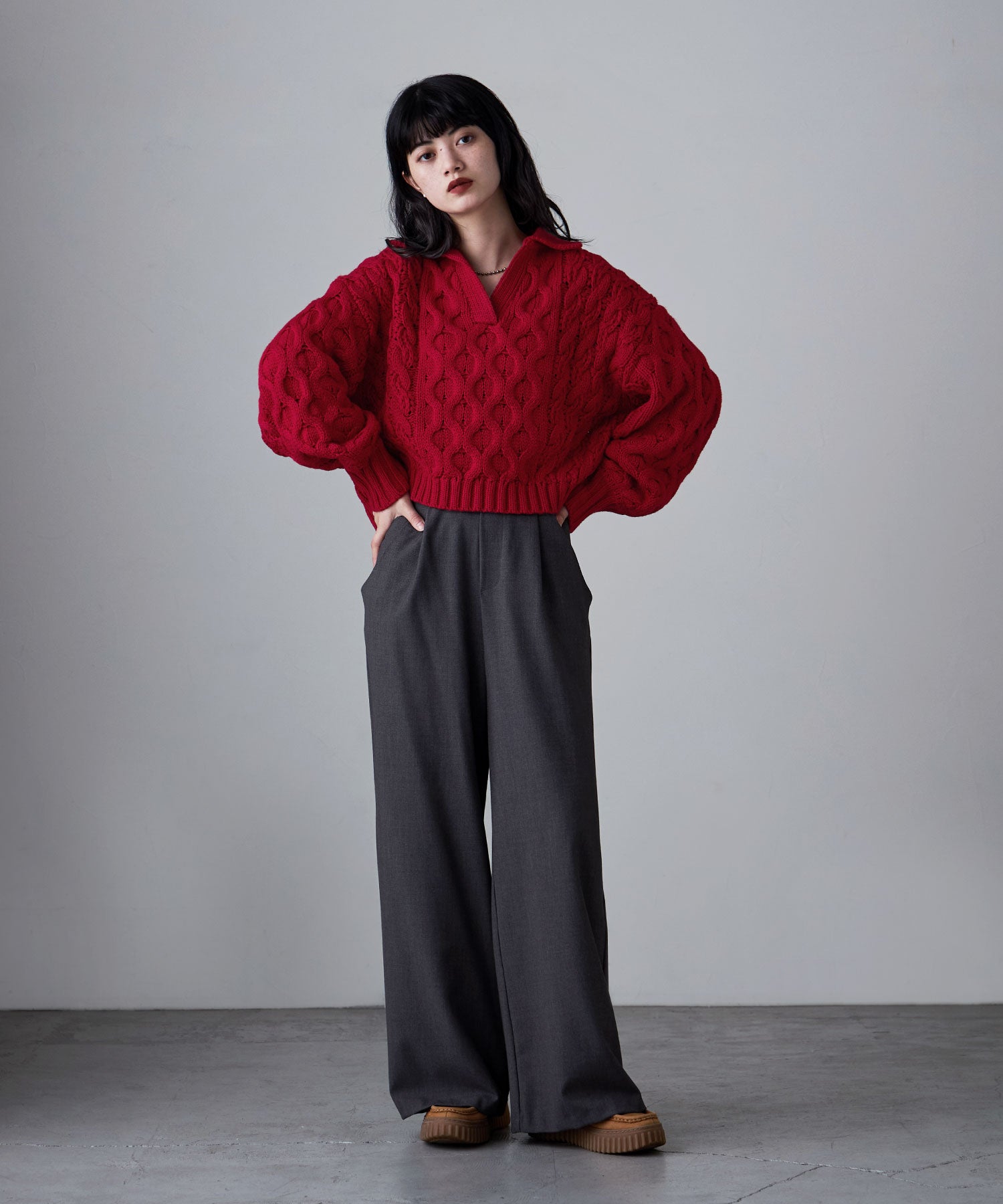 ダッドニットのようなボリューム感にショート丈のバランスが華奢さに繋がるポイント。