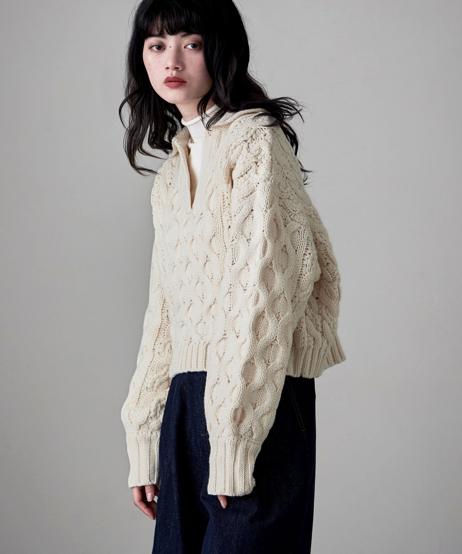 少し重めのな太糸なのでボリューミーになりがちなニットに落ち感が生まれ、女性らしい骨感が残り華奢見せへと繋がります。