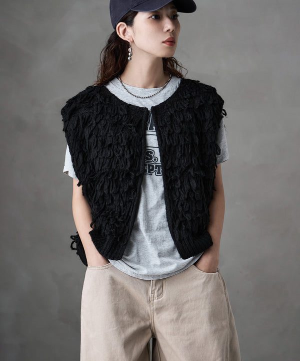 Rname ループデザインショートニットベスト トップス ニット ベスト ノースリーブ ループ クルーネック ループ編み ループデザイン クロップド ショート丈 ビッグシルエット オーバーサイズ ゆったり 重ね着 レイヤード フリンジ 短丈 フロントホック