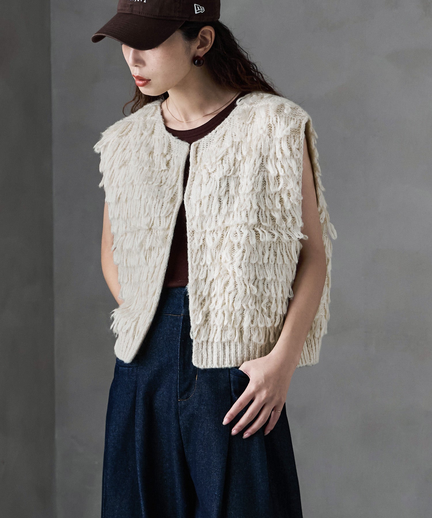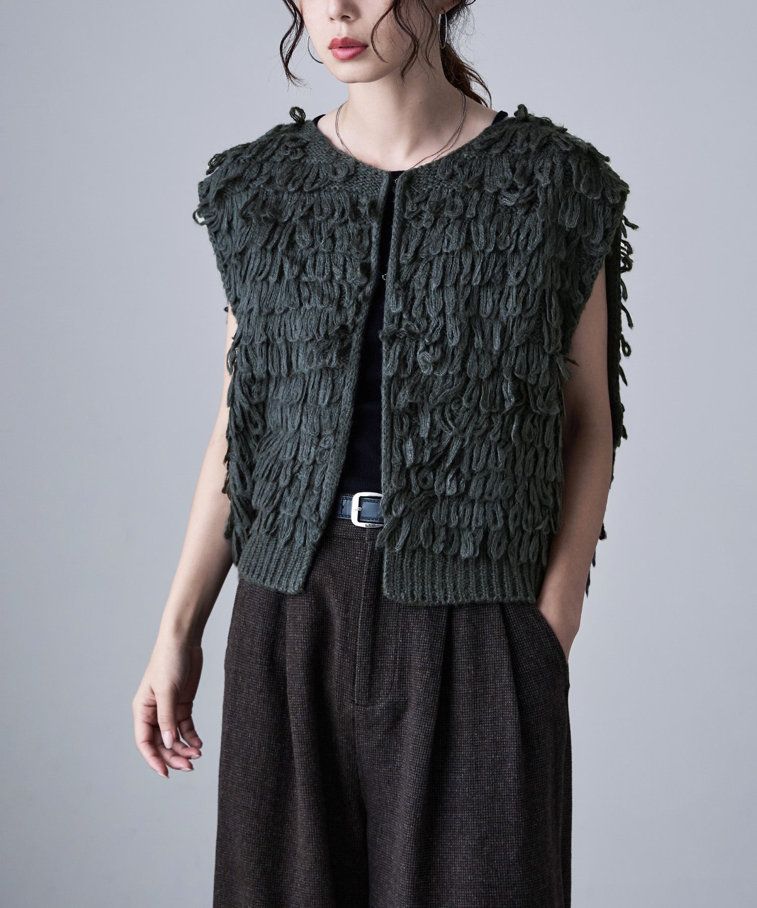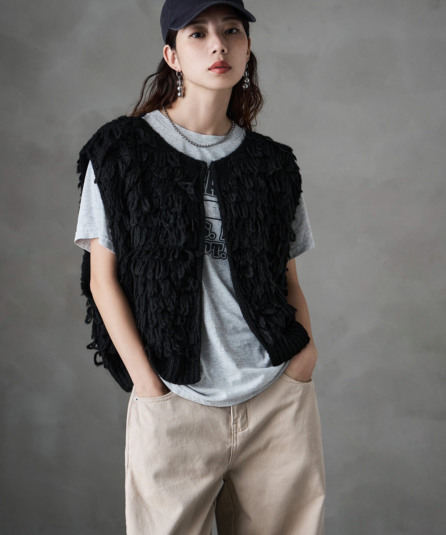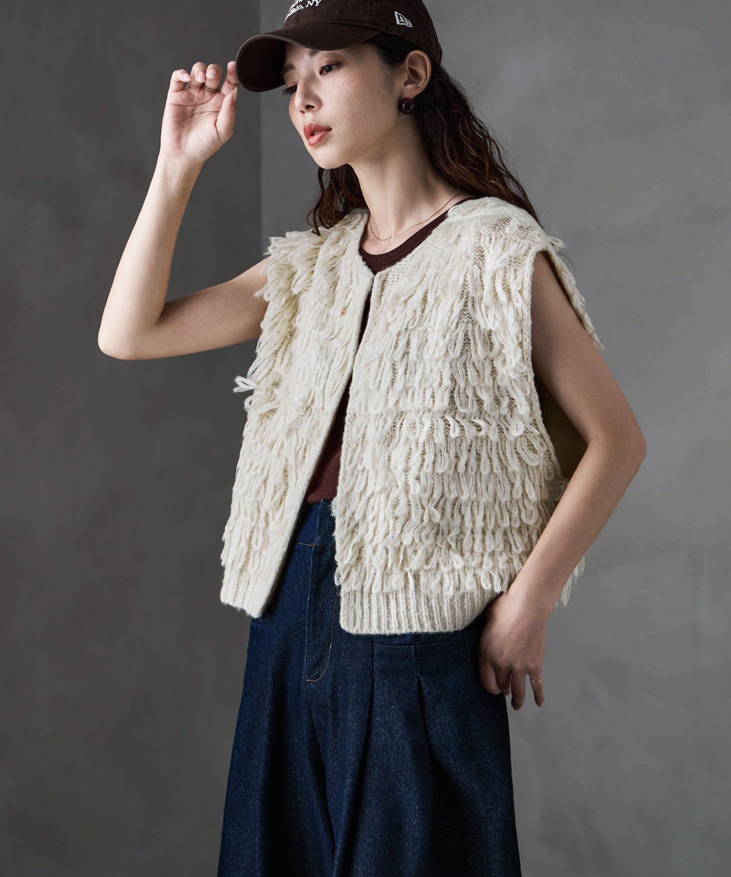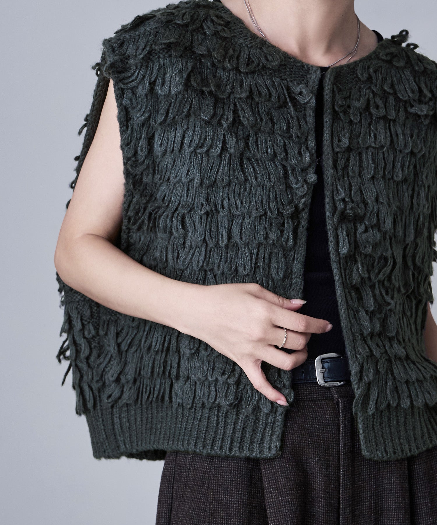 存在感たっぷりのループデザインがアクセントのニットベストの登場です。