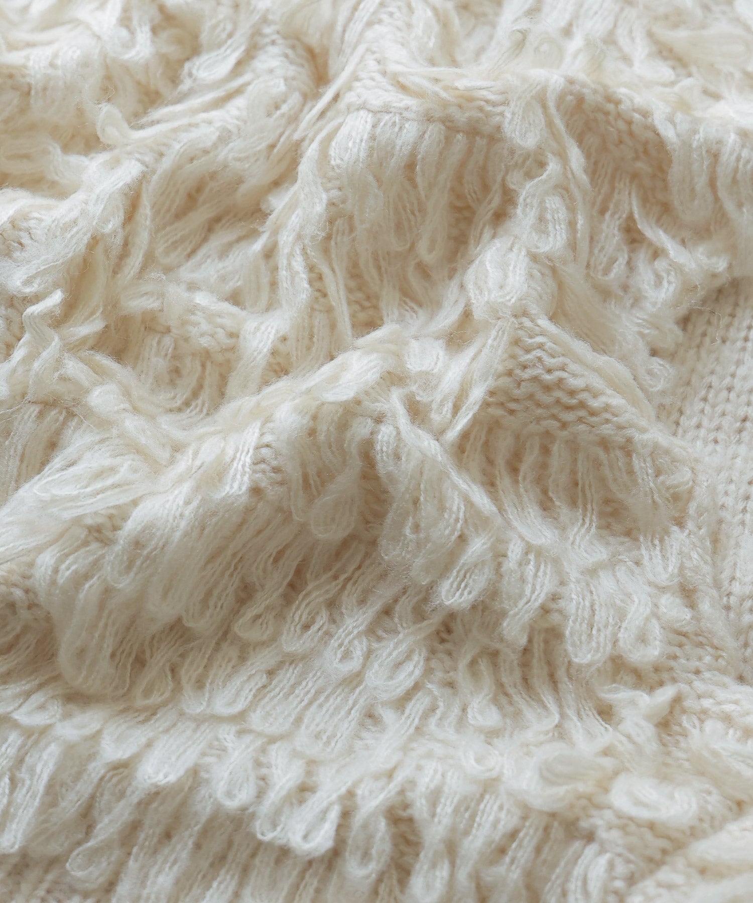 ざっくりと編まれたボリューム感とフラッフィーな見た目が、大人カジュアルスタイルに好マッチ。
