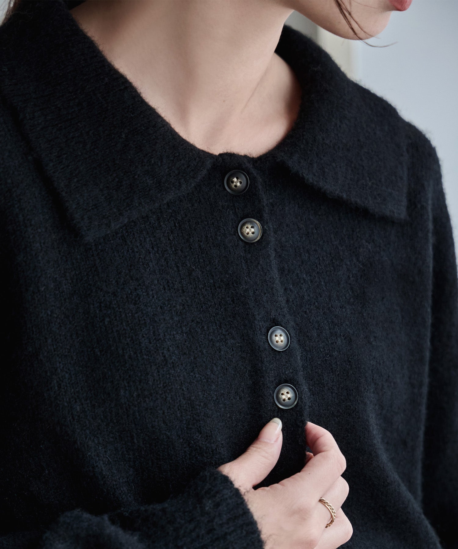 Rname ポロ襟ショートニットカーディガン トップス アウター カーディガン カーデ ニット ニットカーデ ポロニット 長袖 ショート丈 短丈 襟付き 天竺 レギュラーカラー 無地 羽織り ミックスニット メランジ 柔らか ダブルボタン