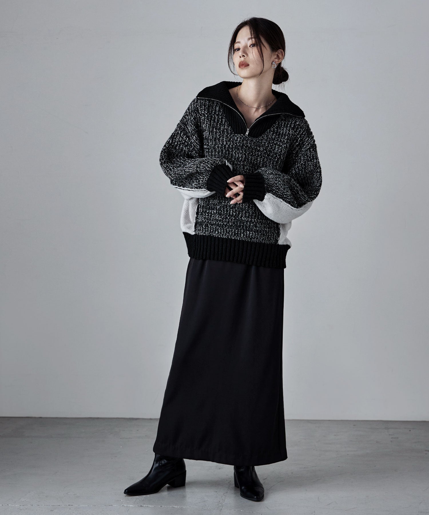 ボリューム感が可愛いサイジングで絶妙な抜け感を演出してくれる、ハーフジップのプルオーバーニット。