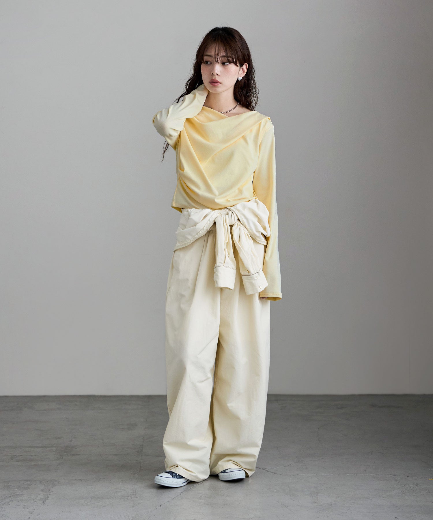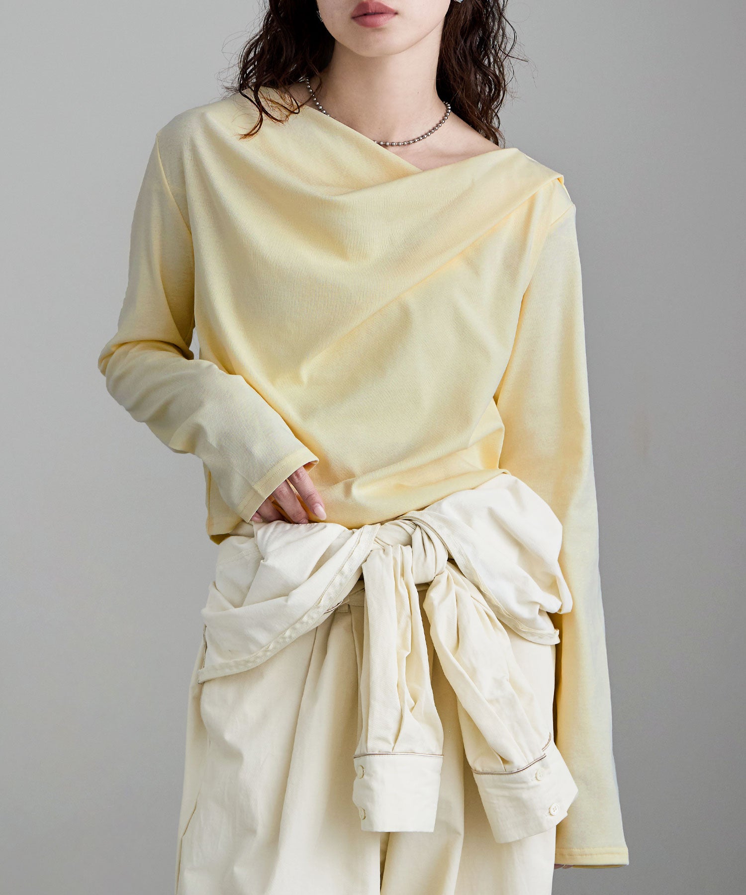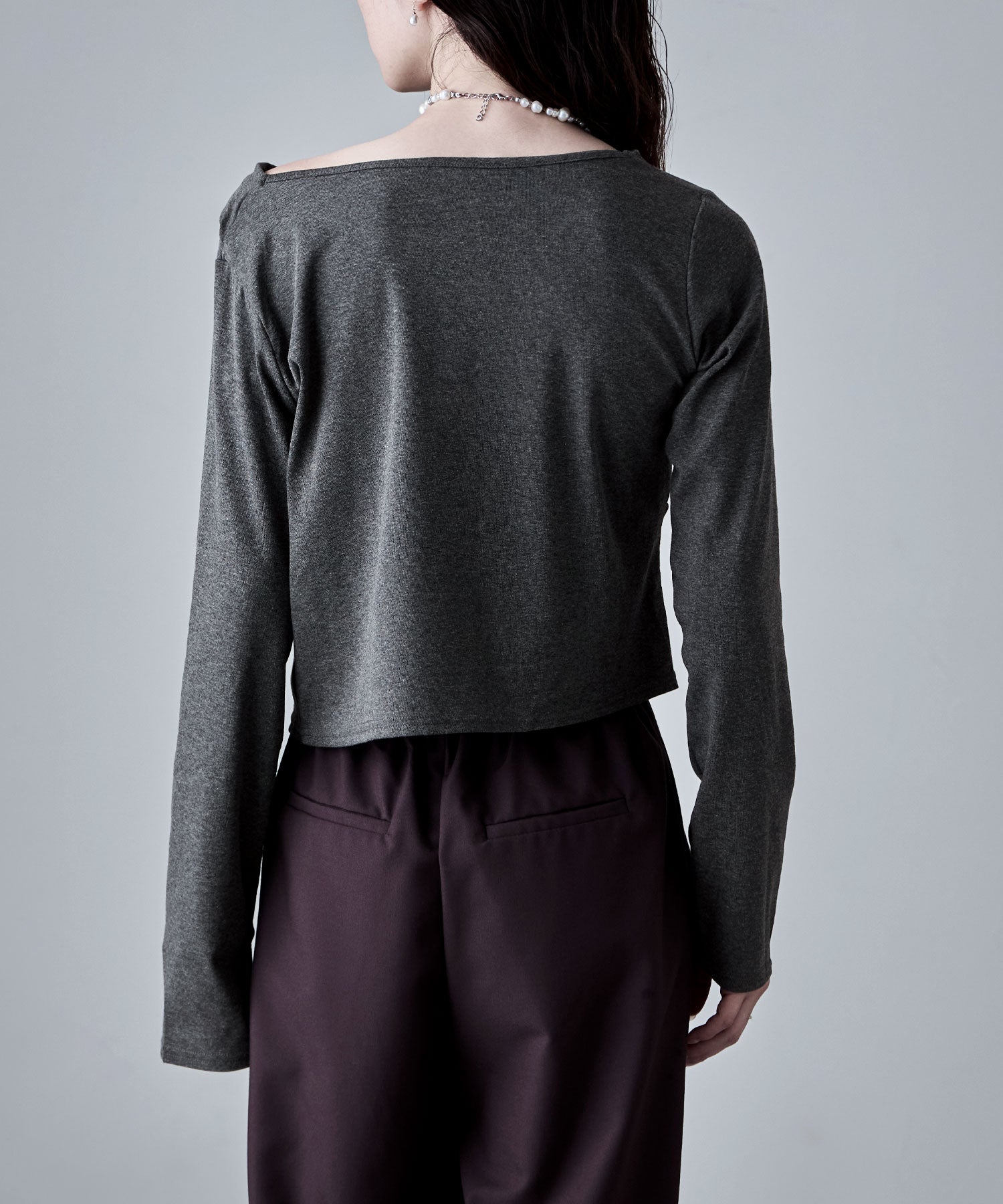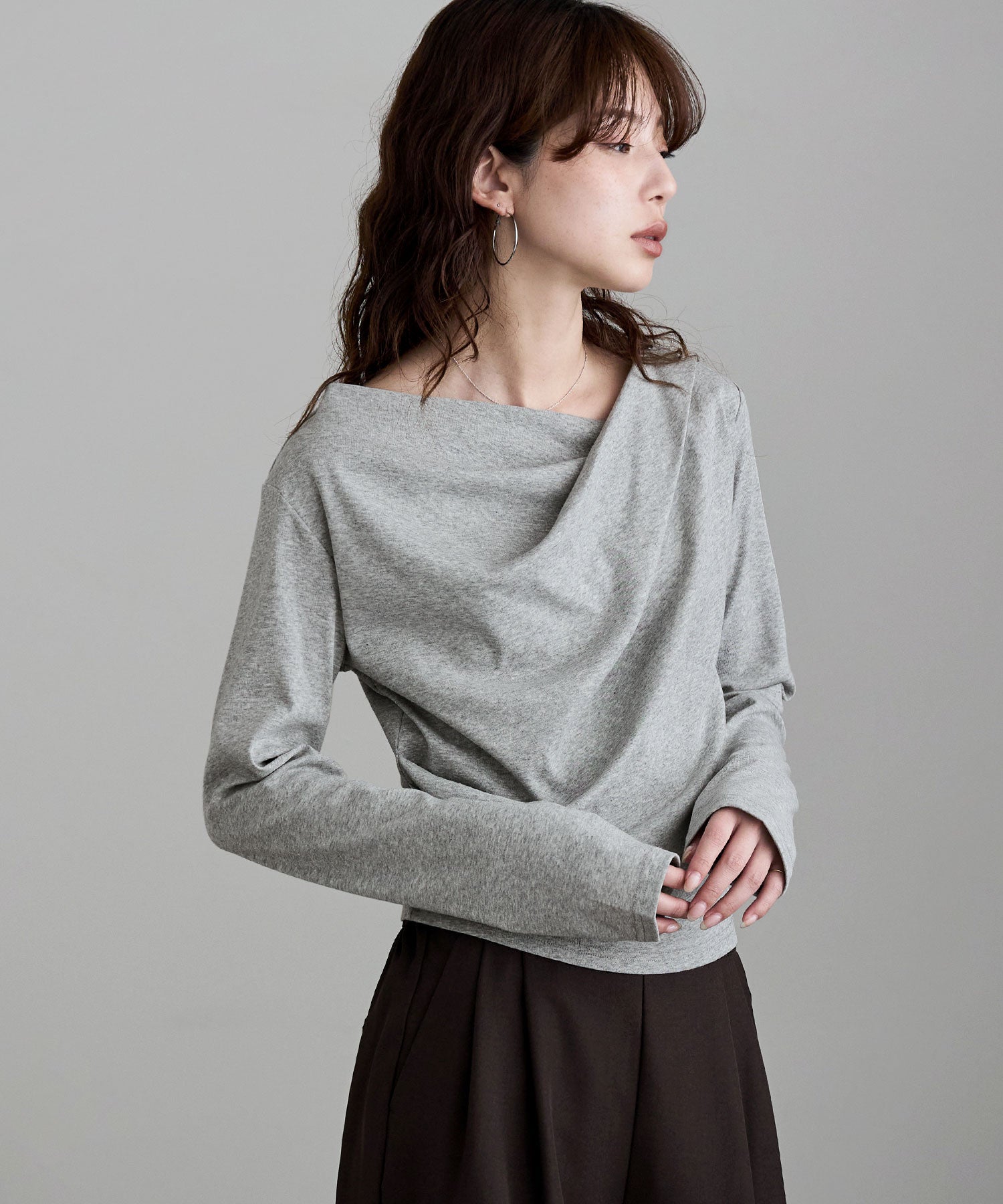 シンプルな着こなしにひねりを加え、アシンメトリーなネックラインを少しずらして肩見せしたり、