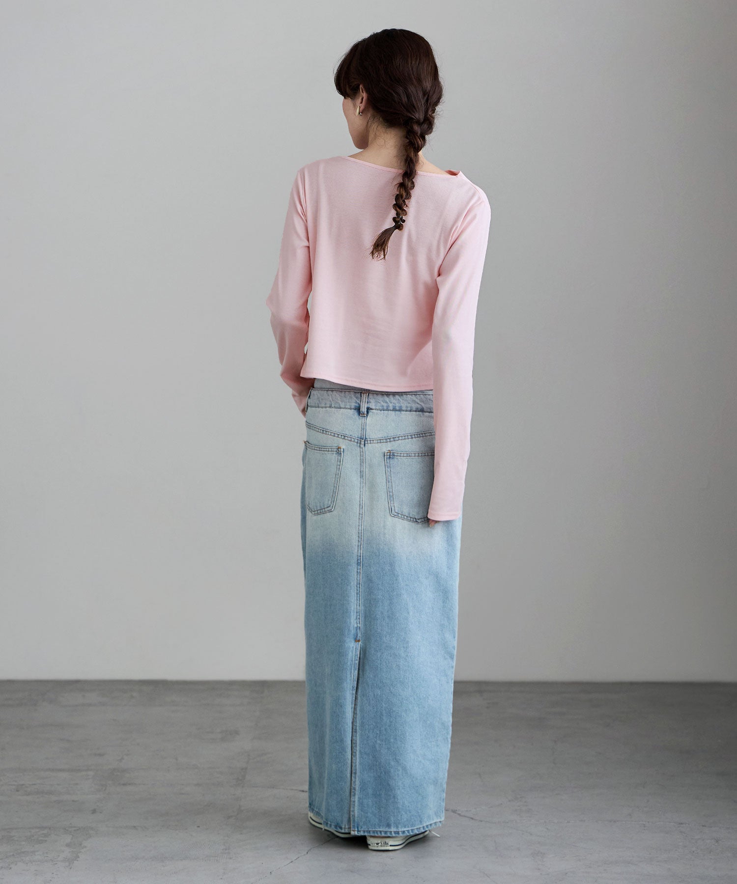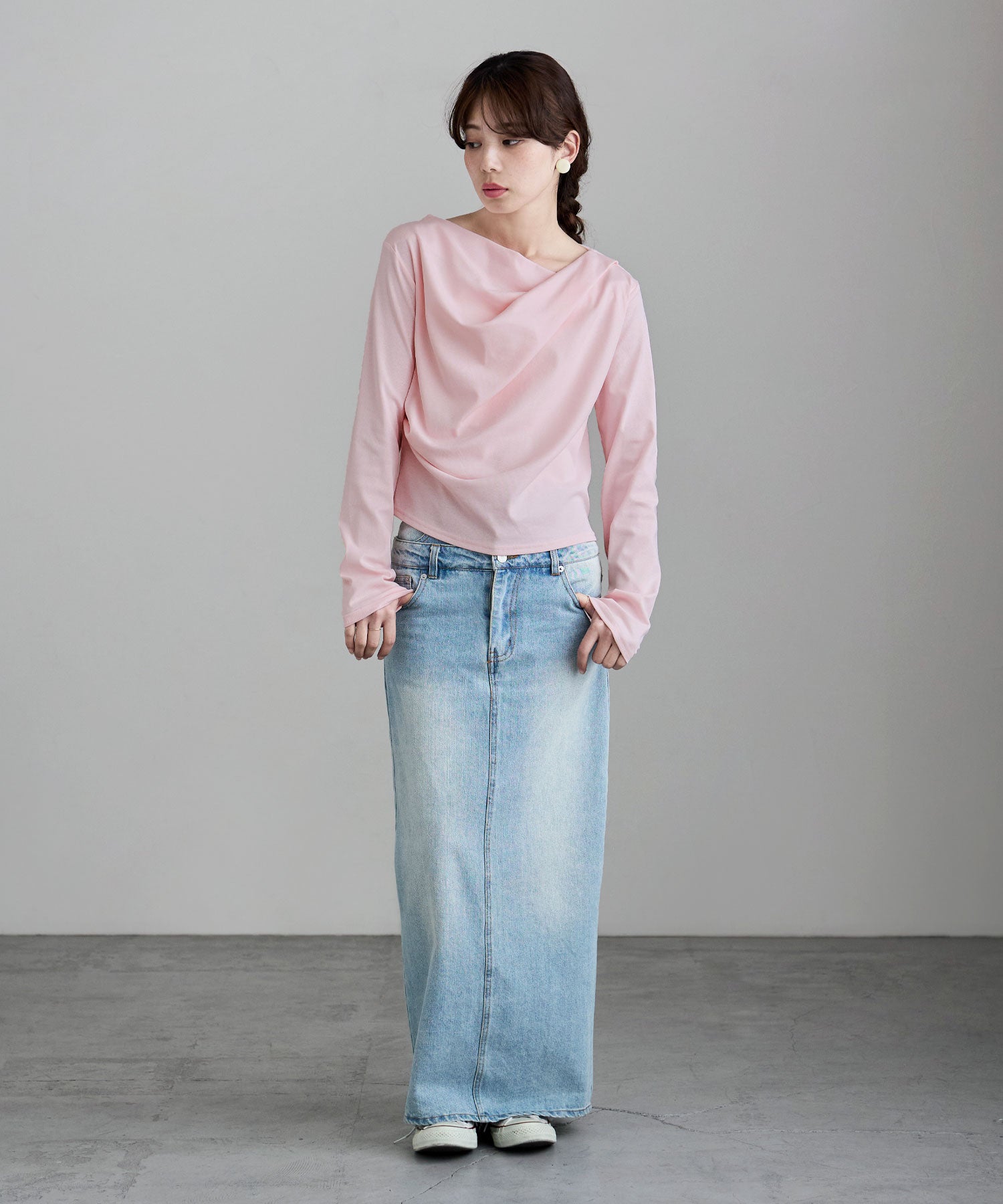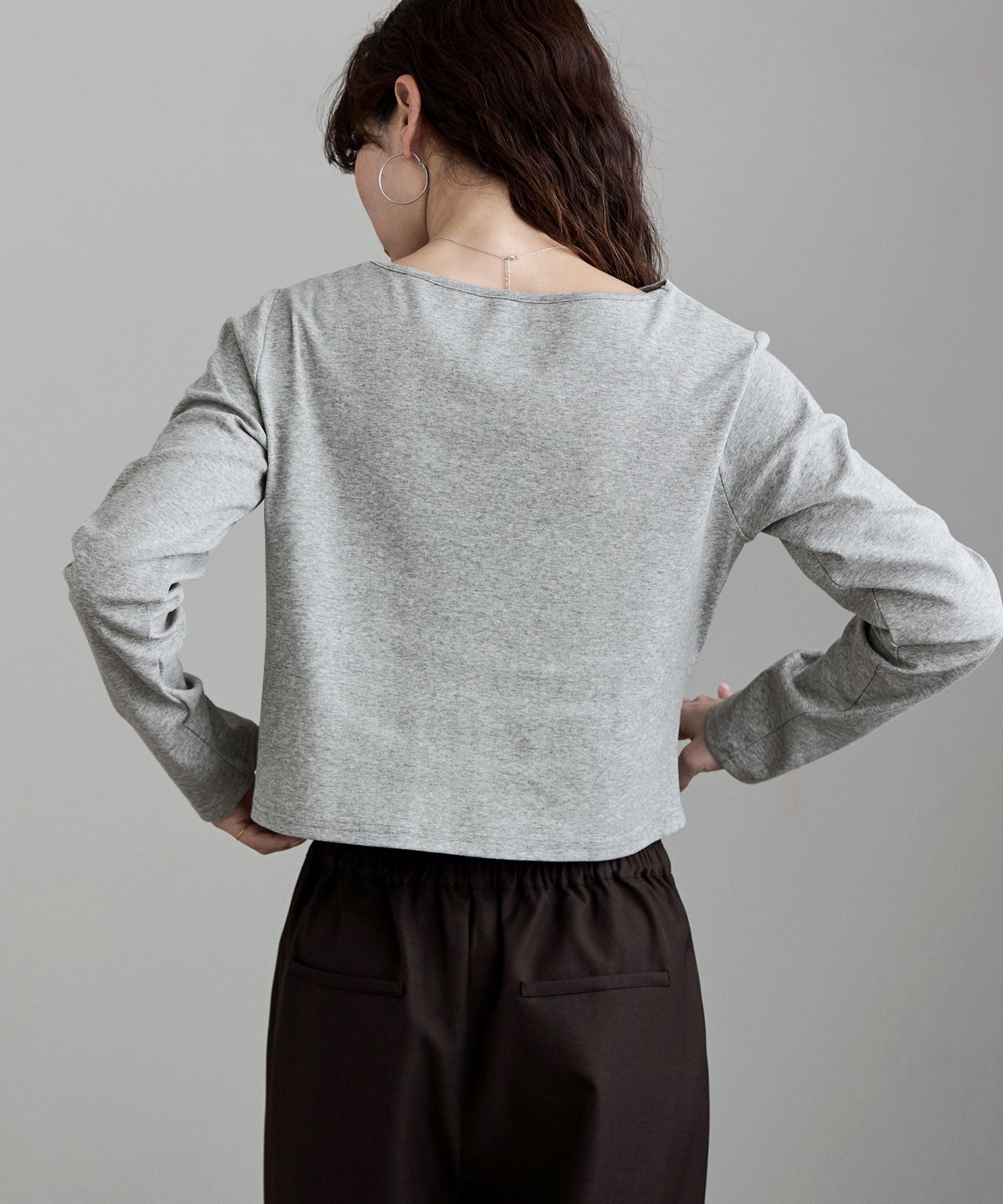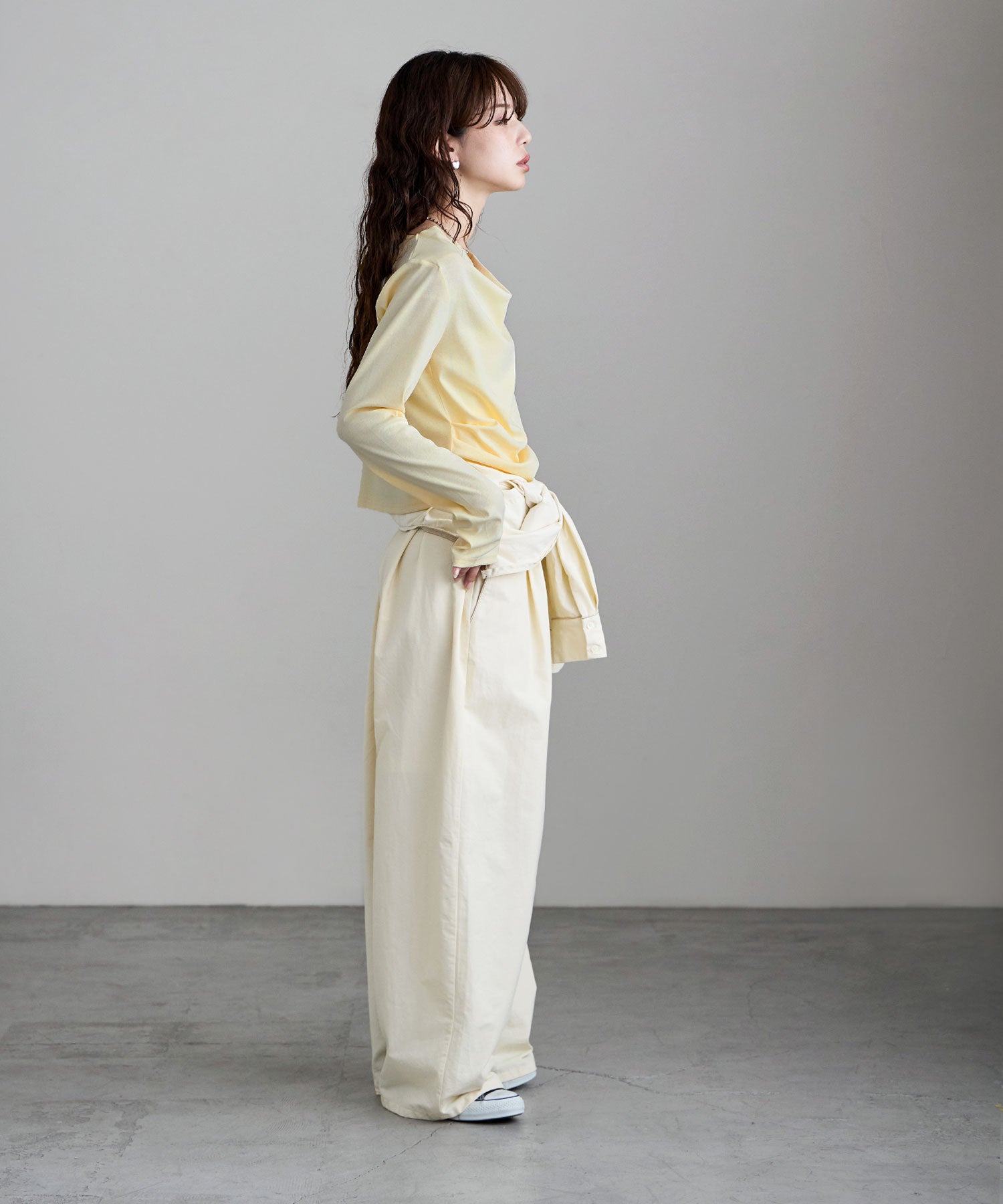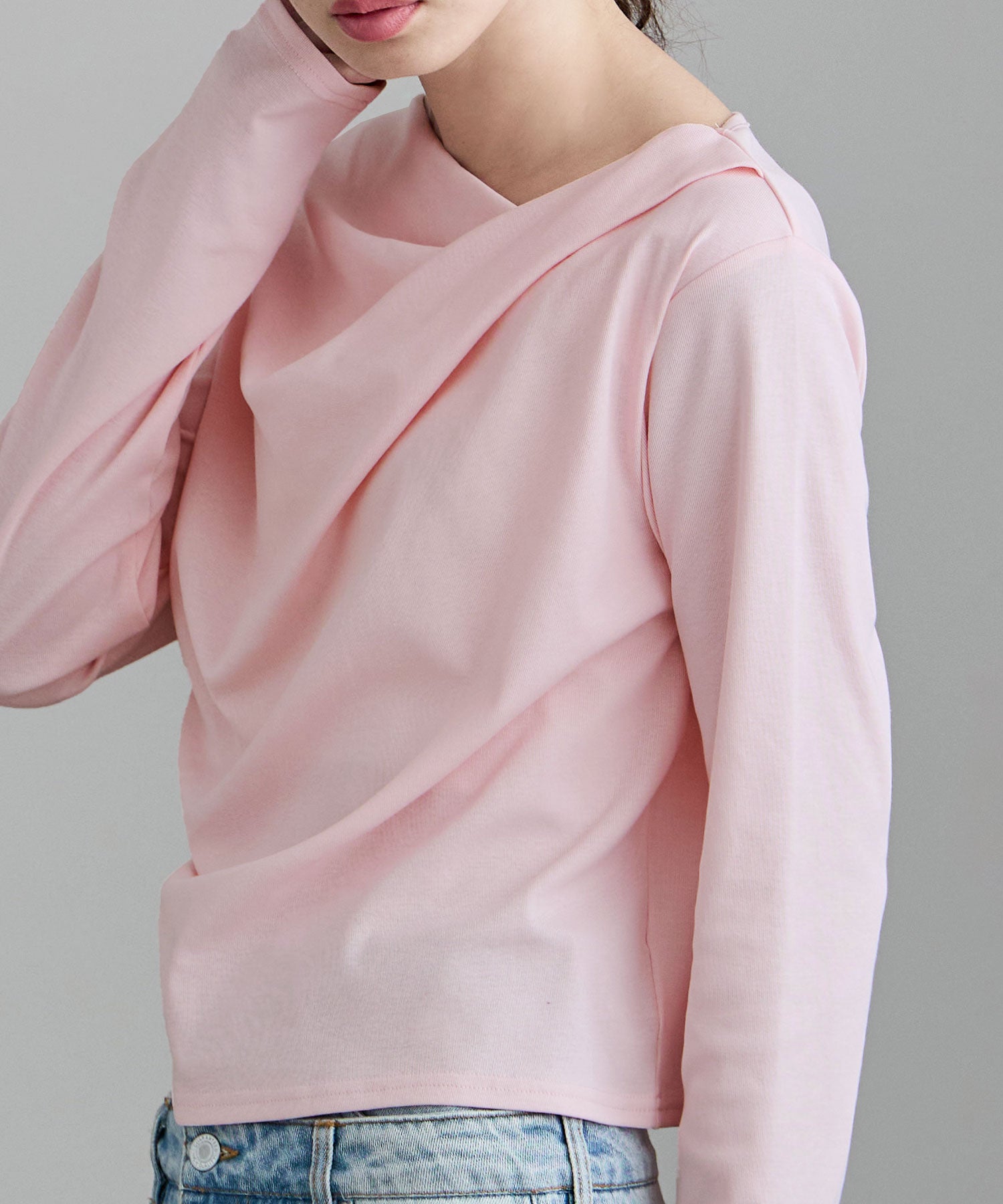 シンプルな着こなしにひねりを加え、アシンメトリーなネックラインを少しずらして肩見せしたり、