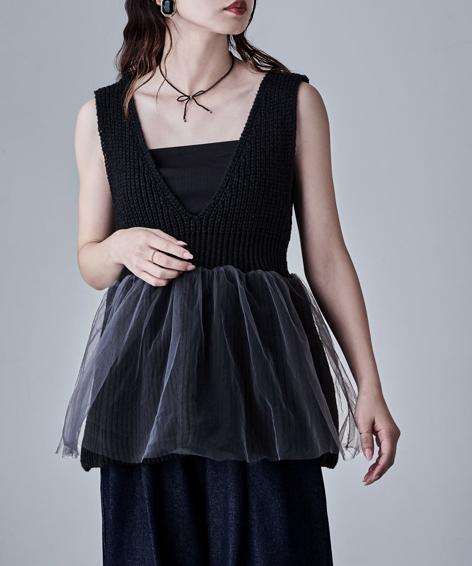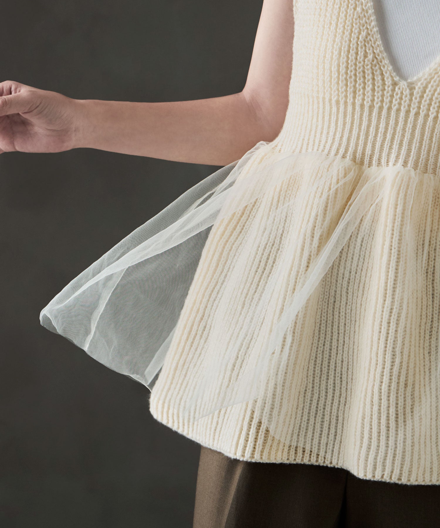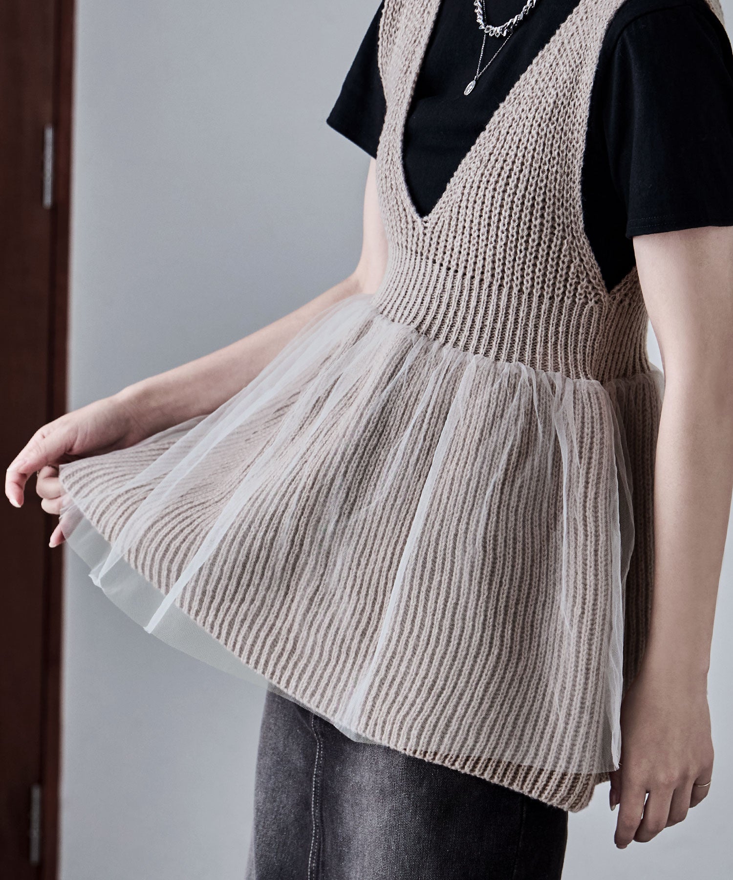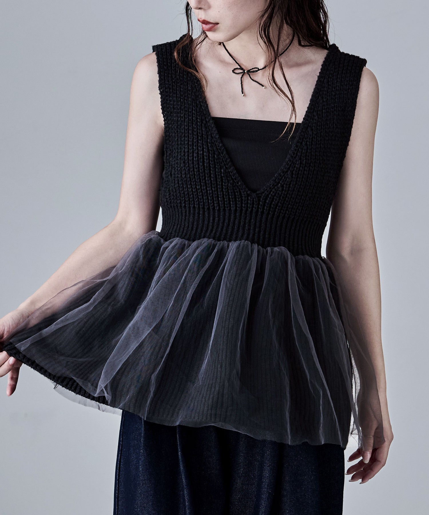 Rname チュールレイヤードペプラムニットベスト トップス ニット ベスト ノースリーブ Vネック ビスチェ チュール ペプラム チュニック ゆったり 重ね着 レイヤード 畦編み