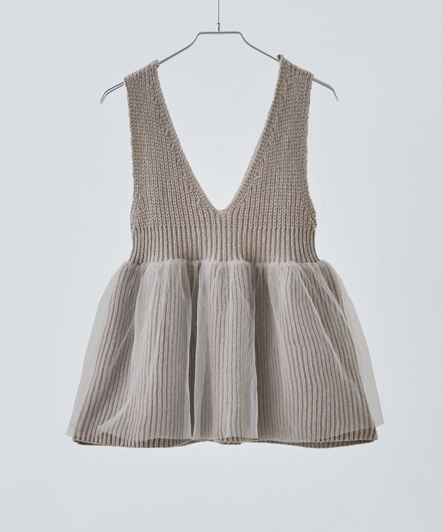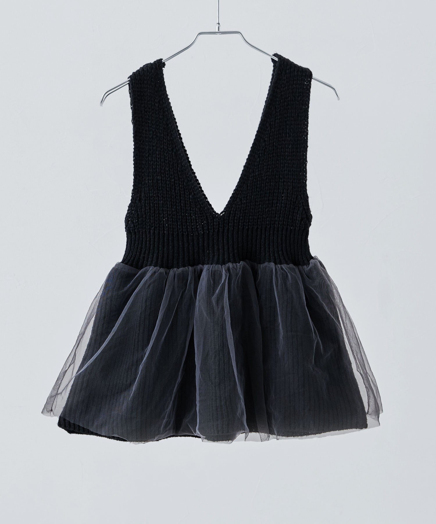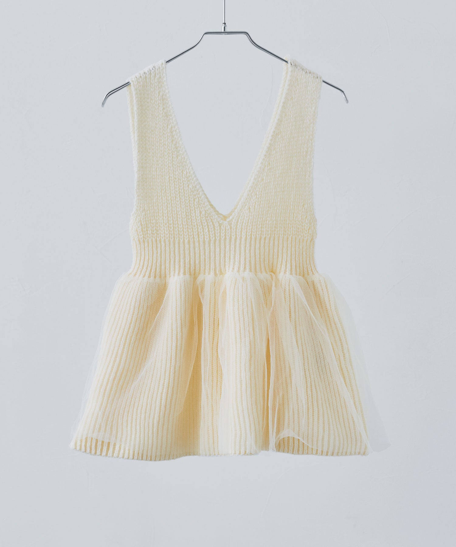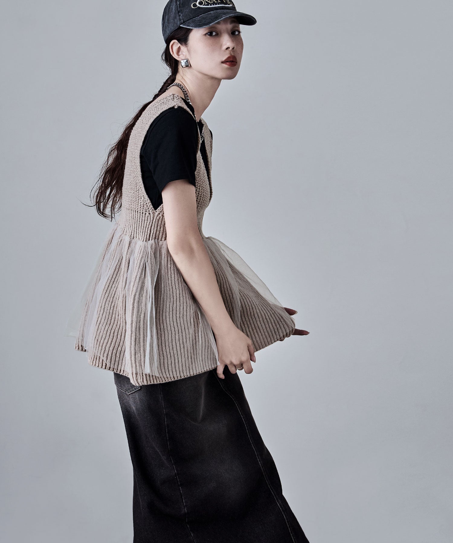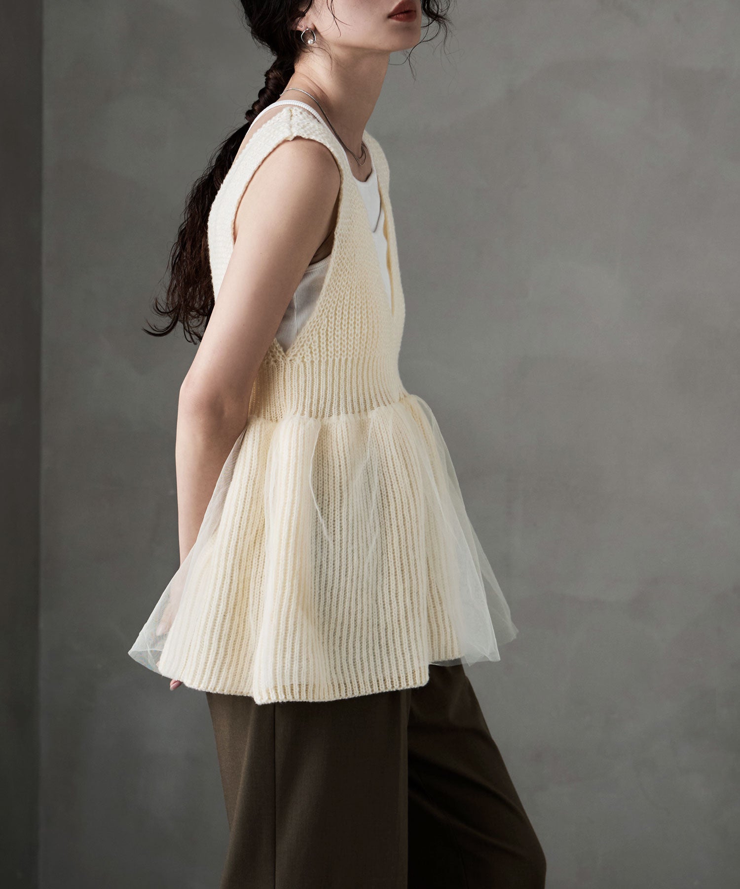 Rname チュールレイヤードペプラムニットベスト トップス ニット ベスト ノースリーブ Vネック ビスチェ チュール ペプラム チュニック ゆったり 重ね着 レイヤード 畦編み