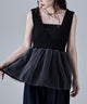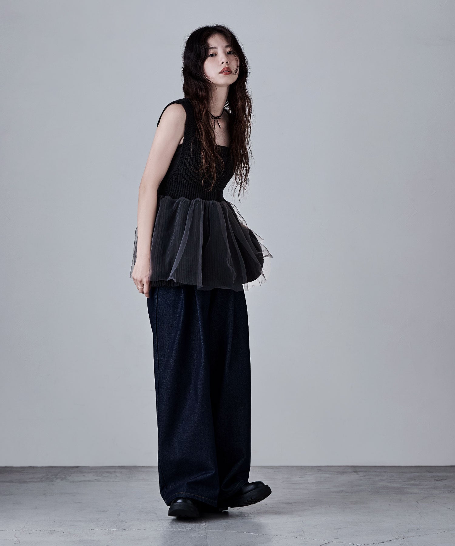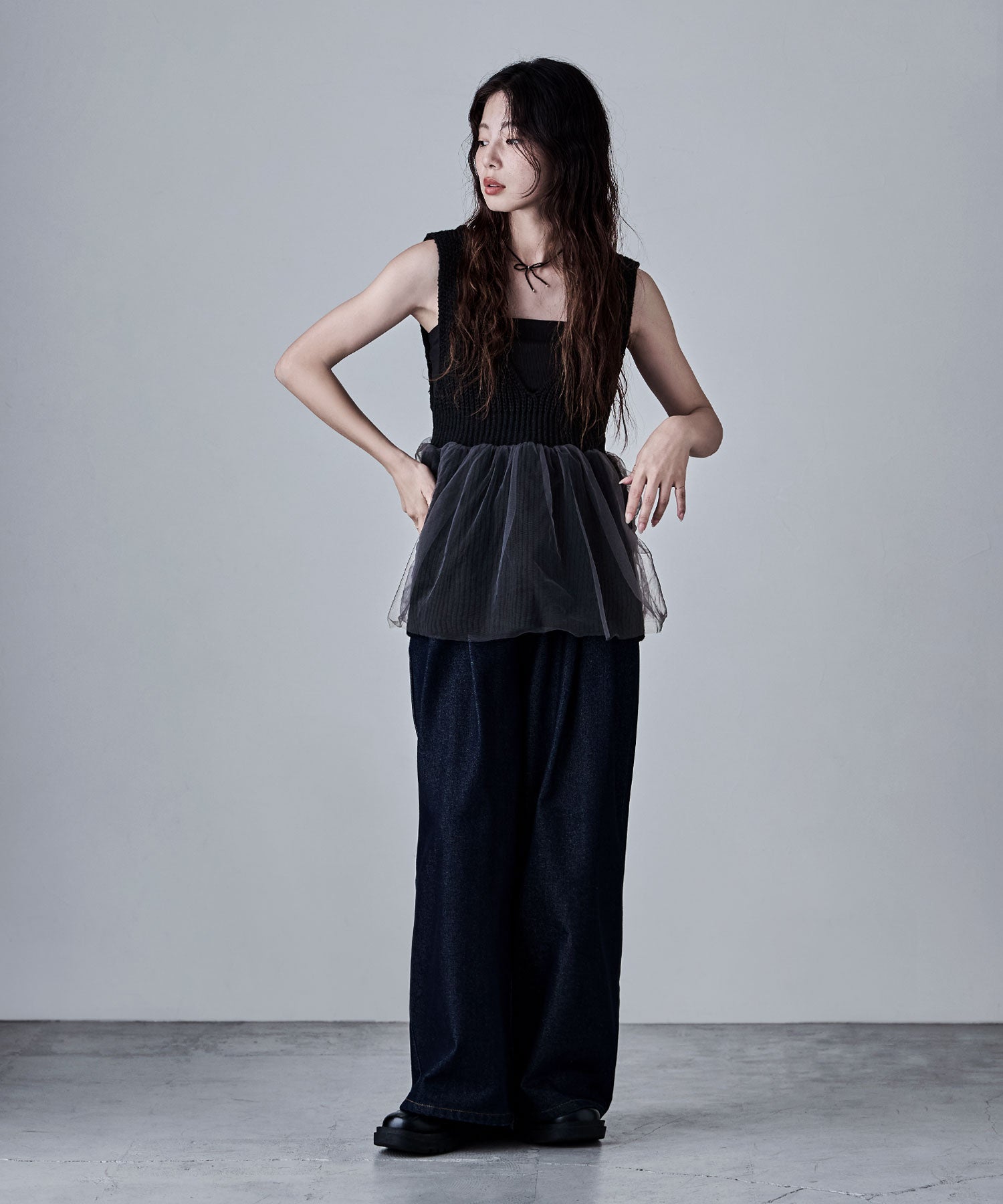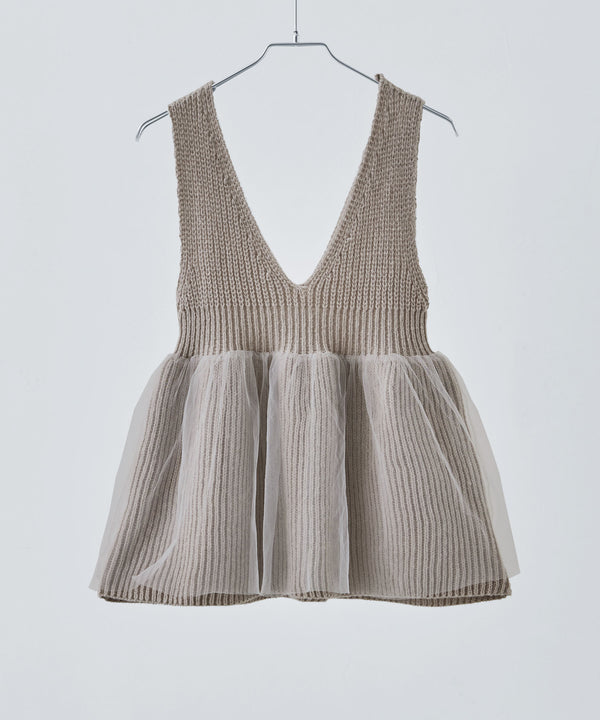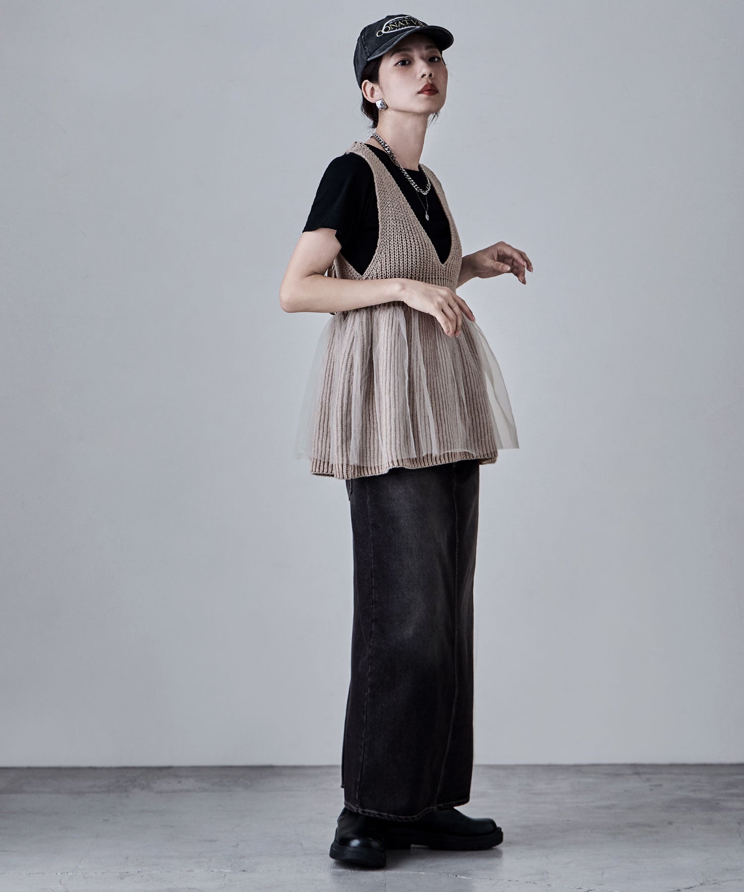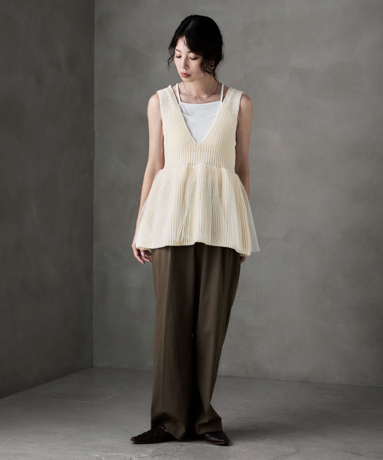 Rname チュールレイヤードペプラムニットベスト トップス ニット ベスト ノースリーブ Vネック ビスチェ チュール ペプラム チュニック ゆったり 重ね着 レイヤード 畦編み