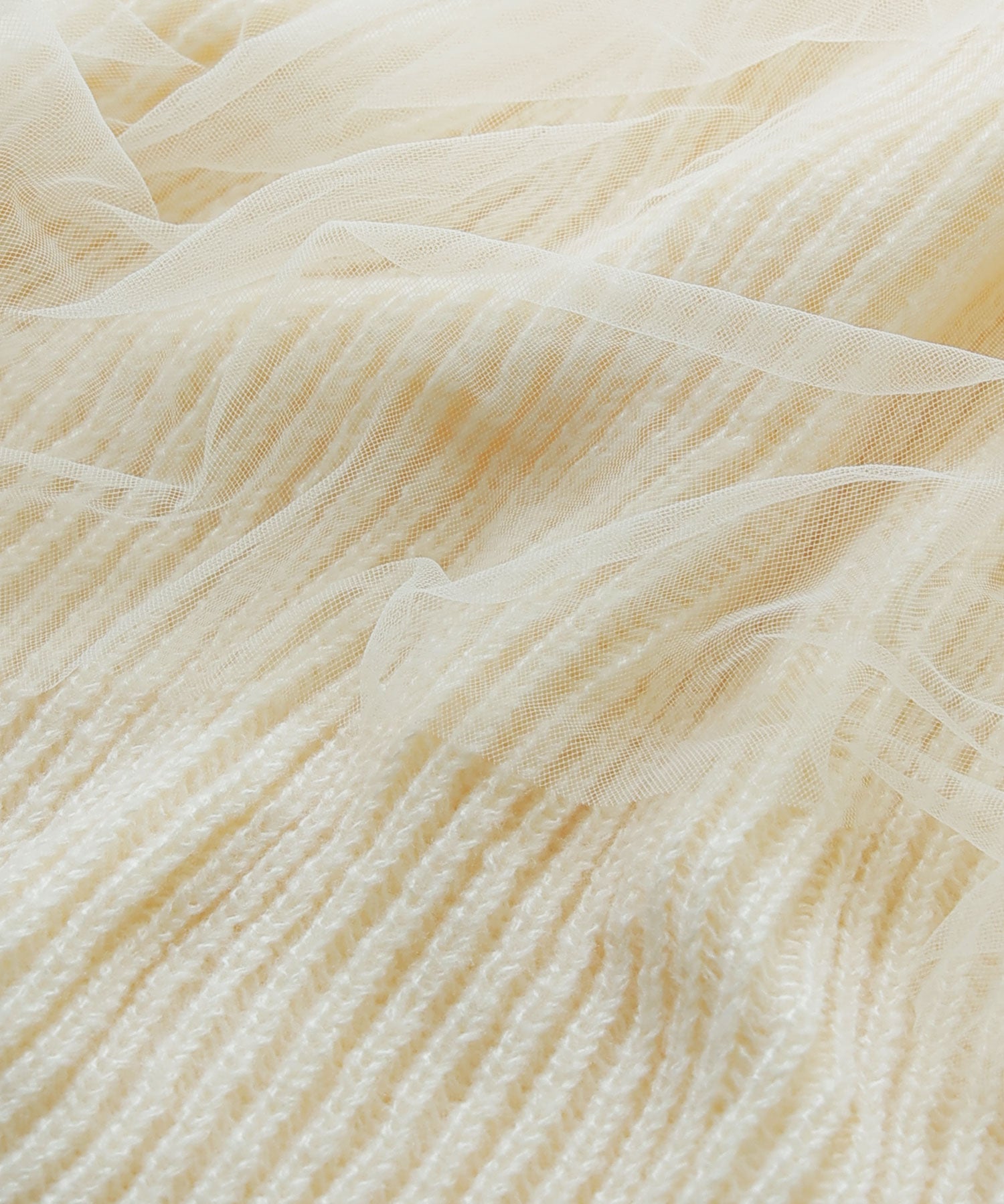 着心地の良い柔らかなニットに、抜け感スタイルをつくる目を惹くチュールをレイヤード。