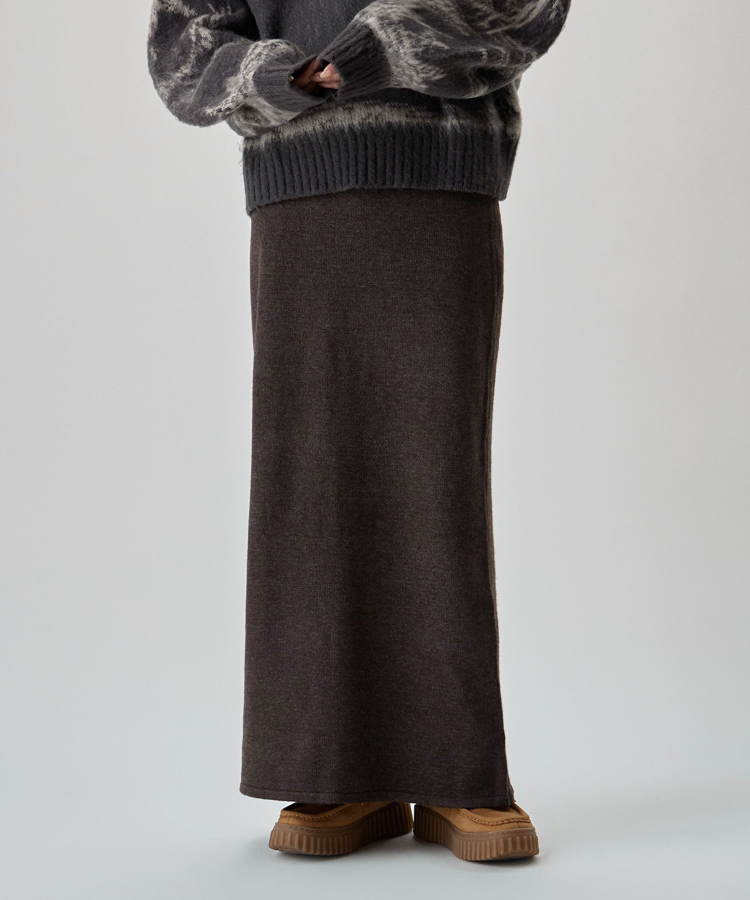 ほっこりしがちなニット素材のスカートを、