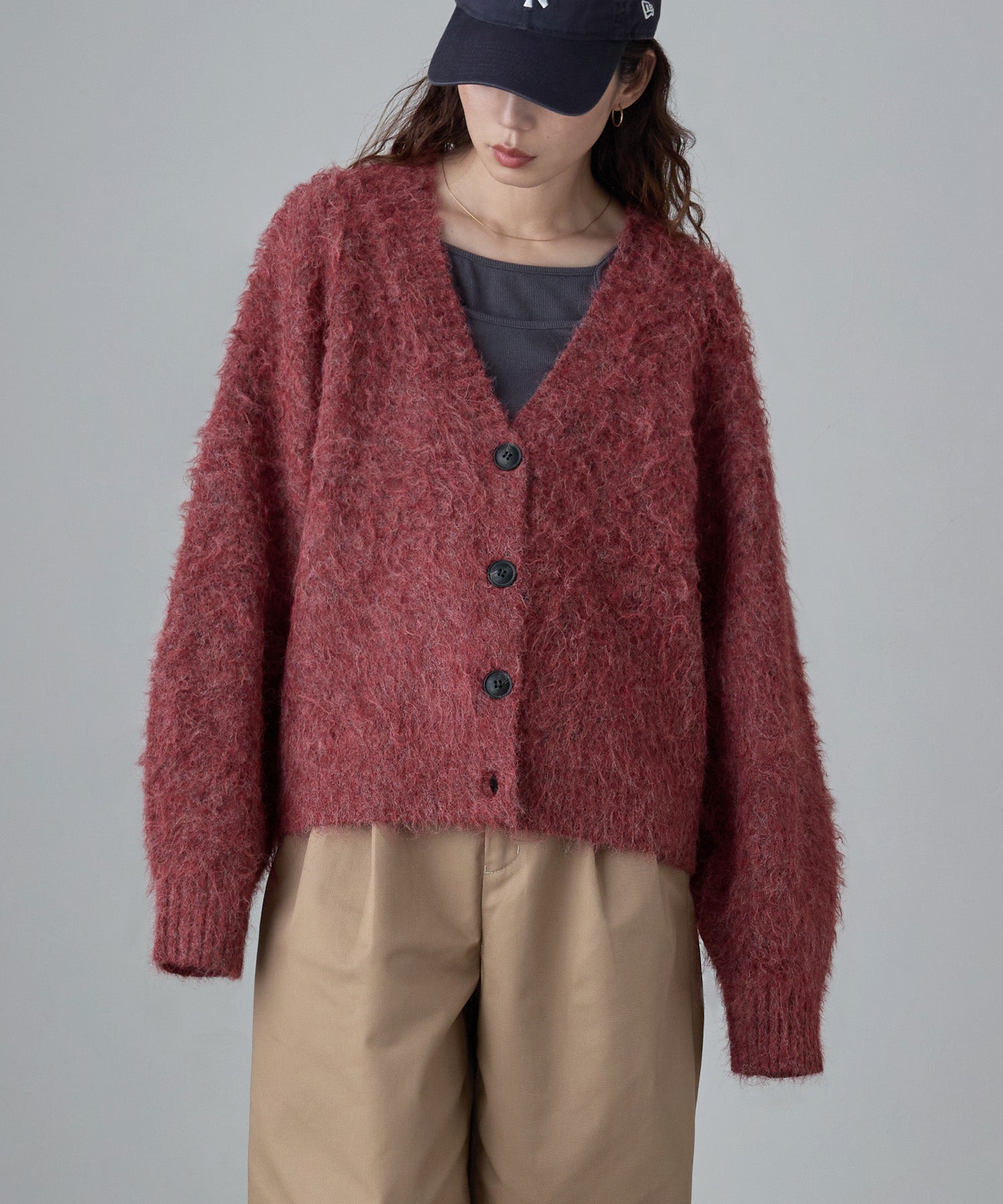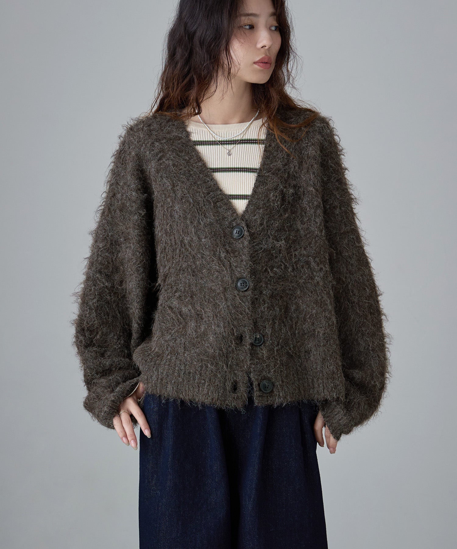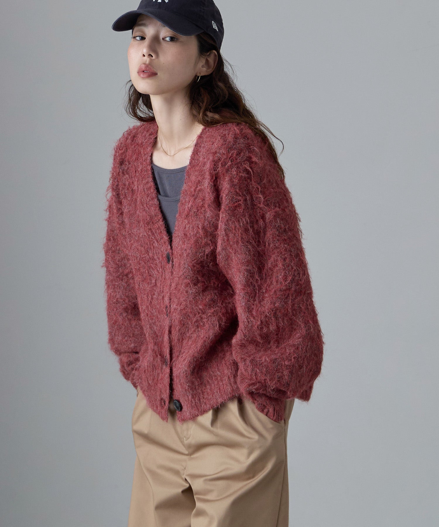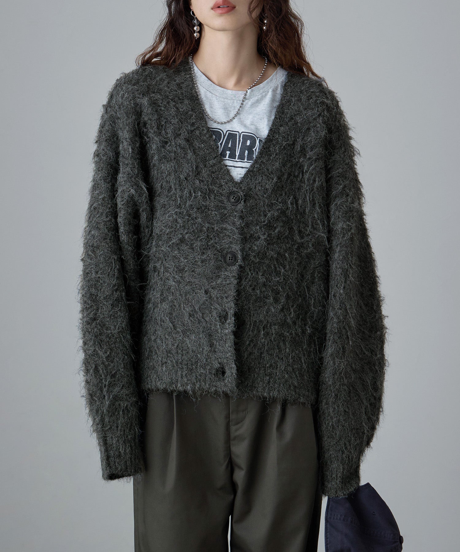 ウォーム感のある起毛糸で仕上げたシャギーVネックカーディガン。