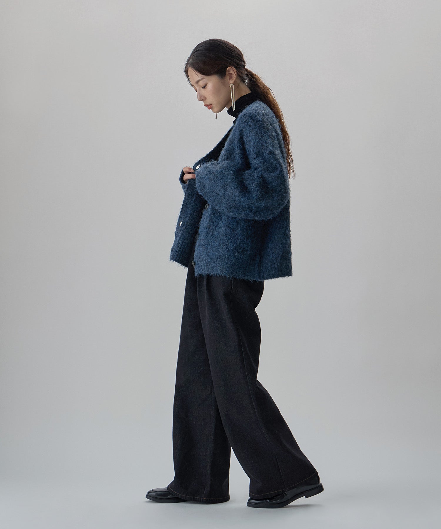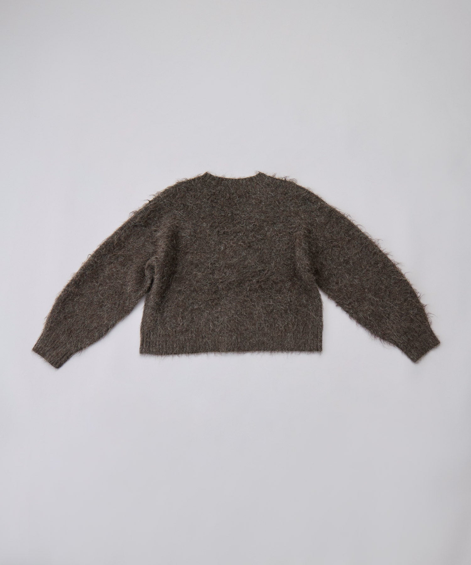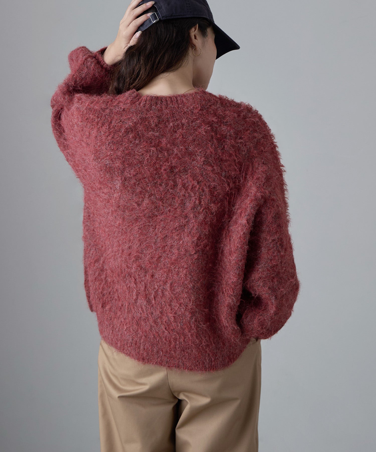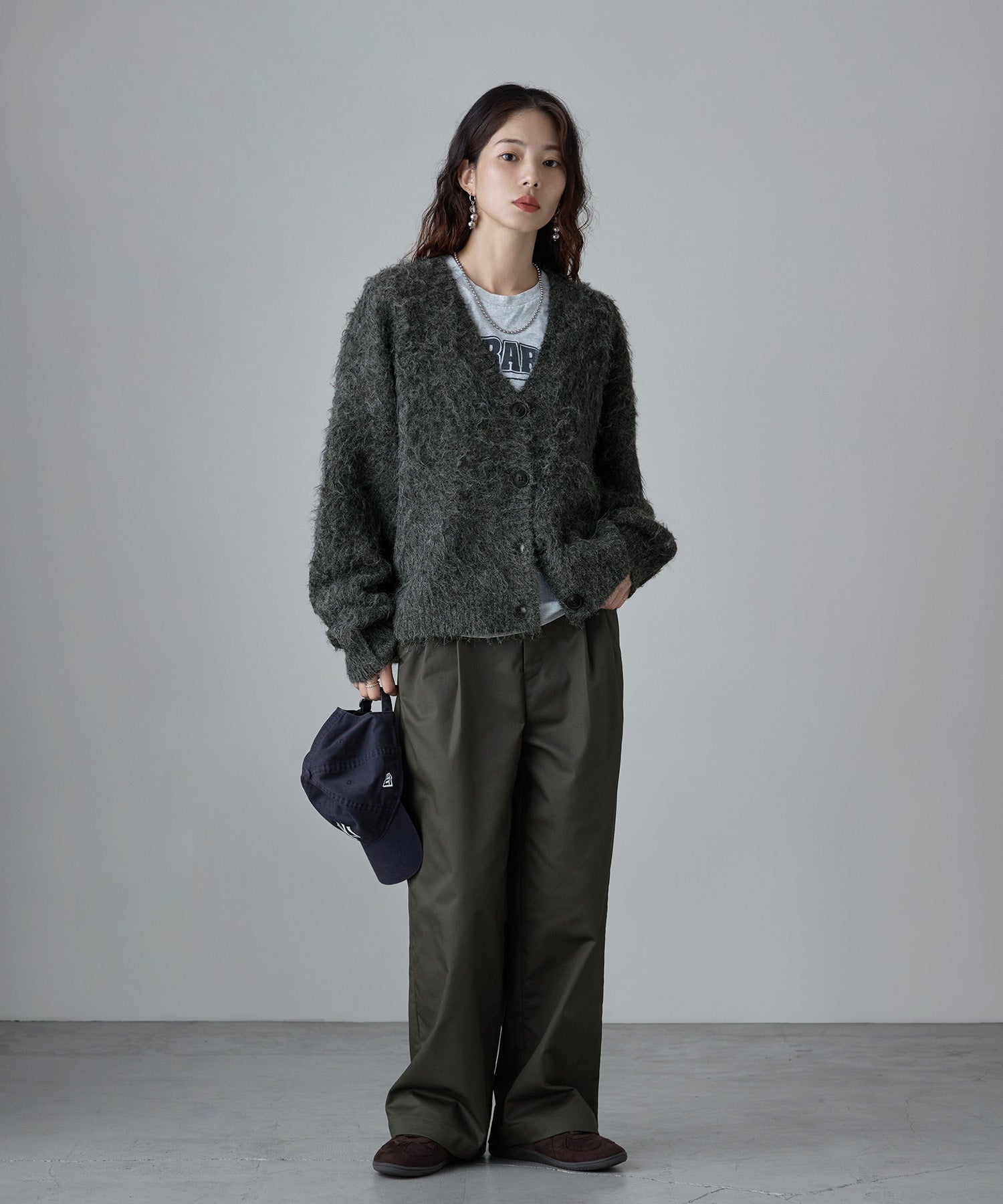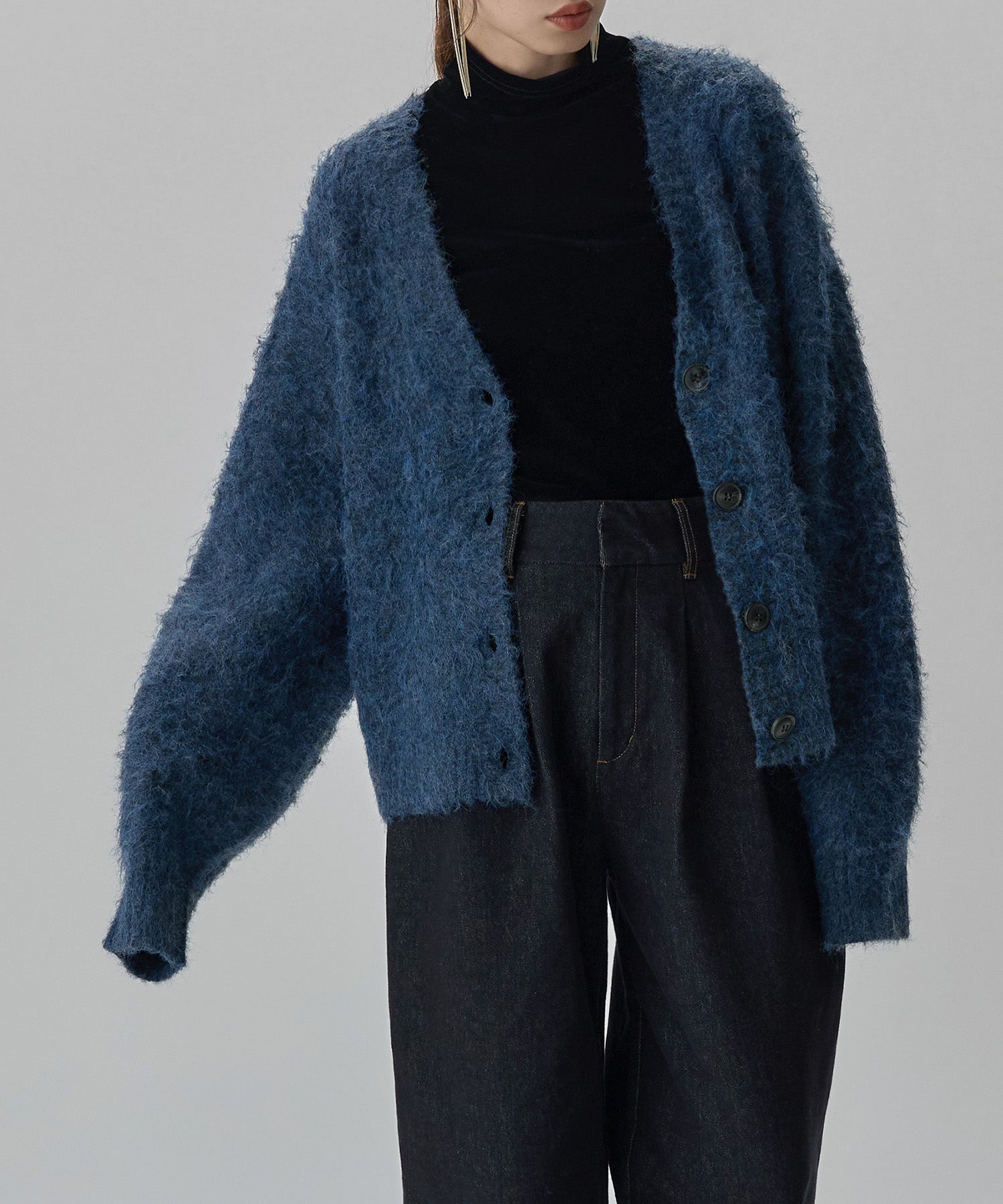 ウォーム感のある起毛糸で仕上げたシャギーVネックカーディガン。