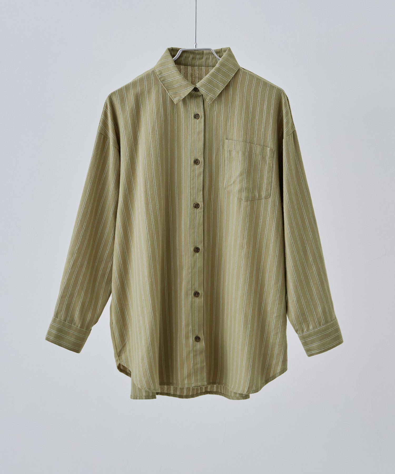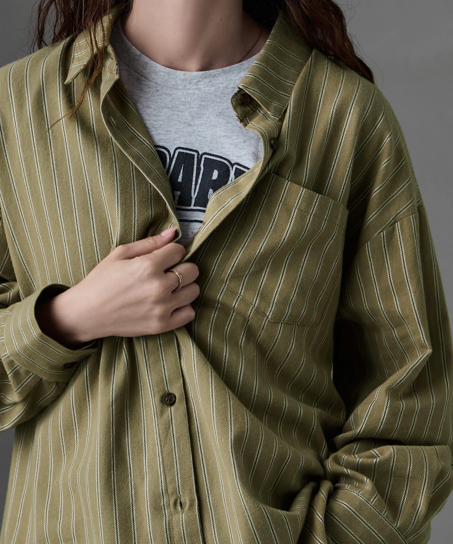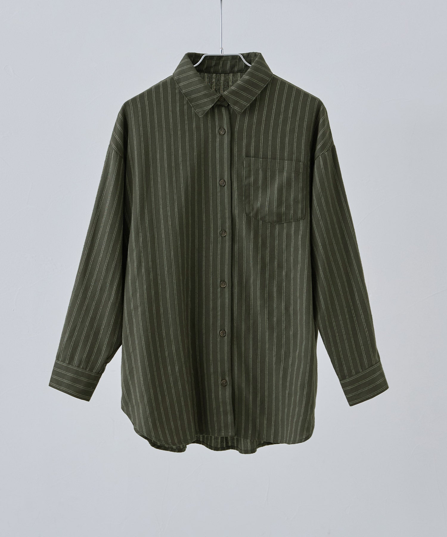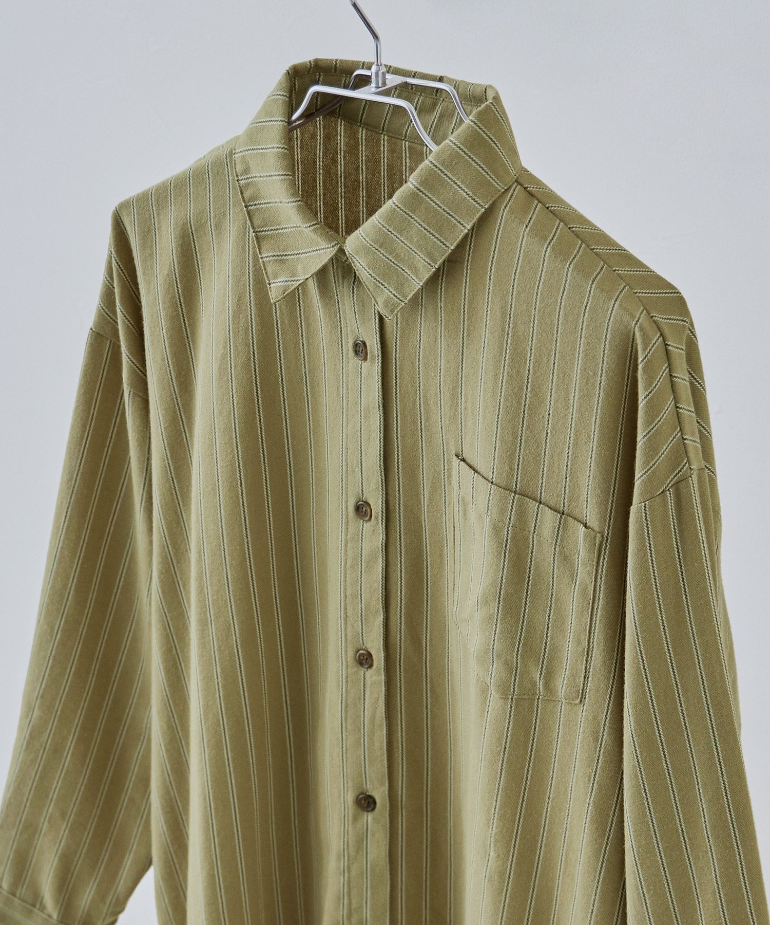 Rname ストライプコットンオーバーシャツ トップス シャツ 長袖 ストライプ 綿 綿100 ビッグシルエット オーバーサイズ レギュラーカラー 起毛 ネルシャツ レトロ 羽織り ストライプシャツ