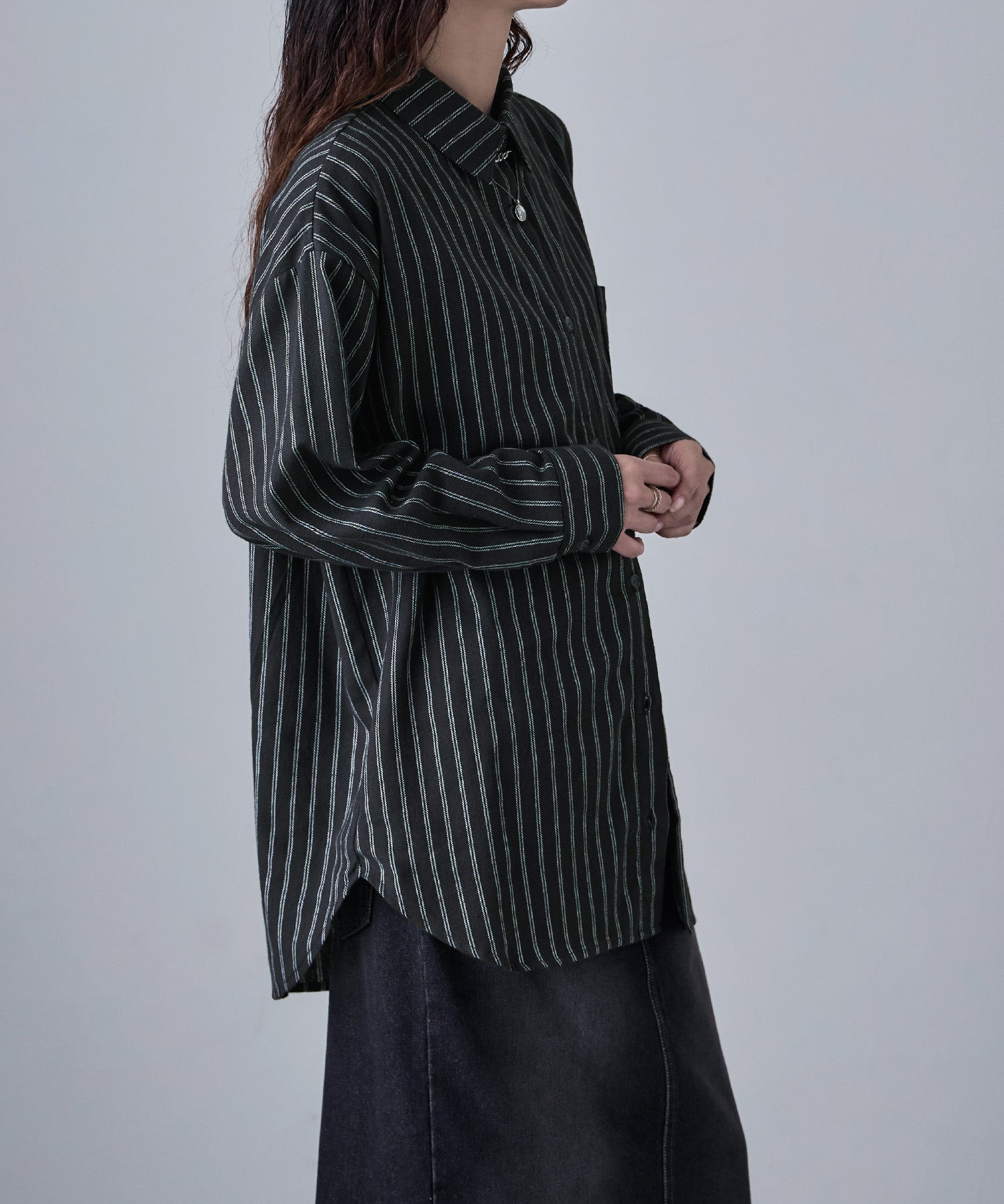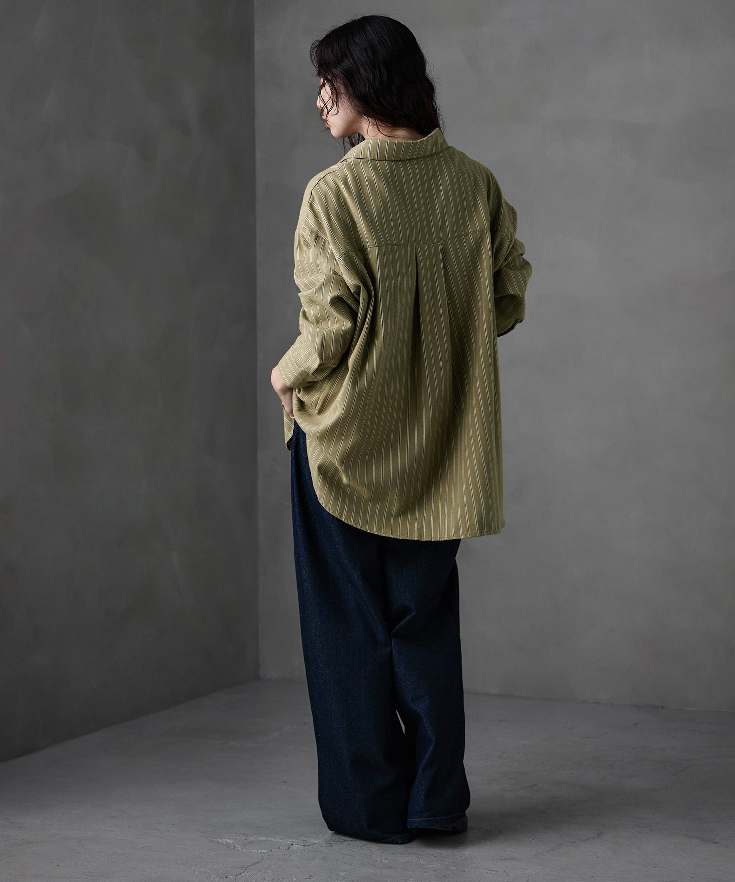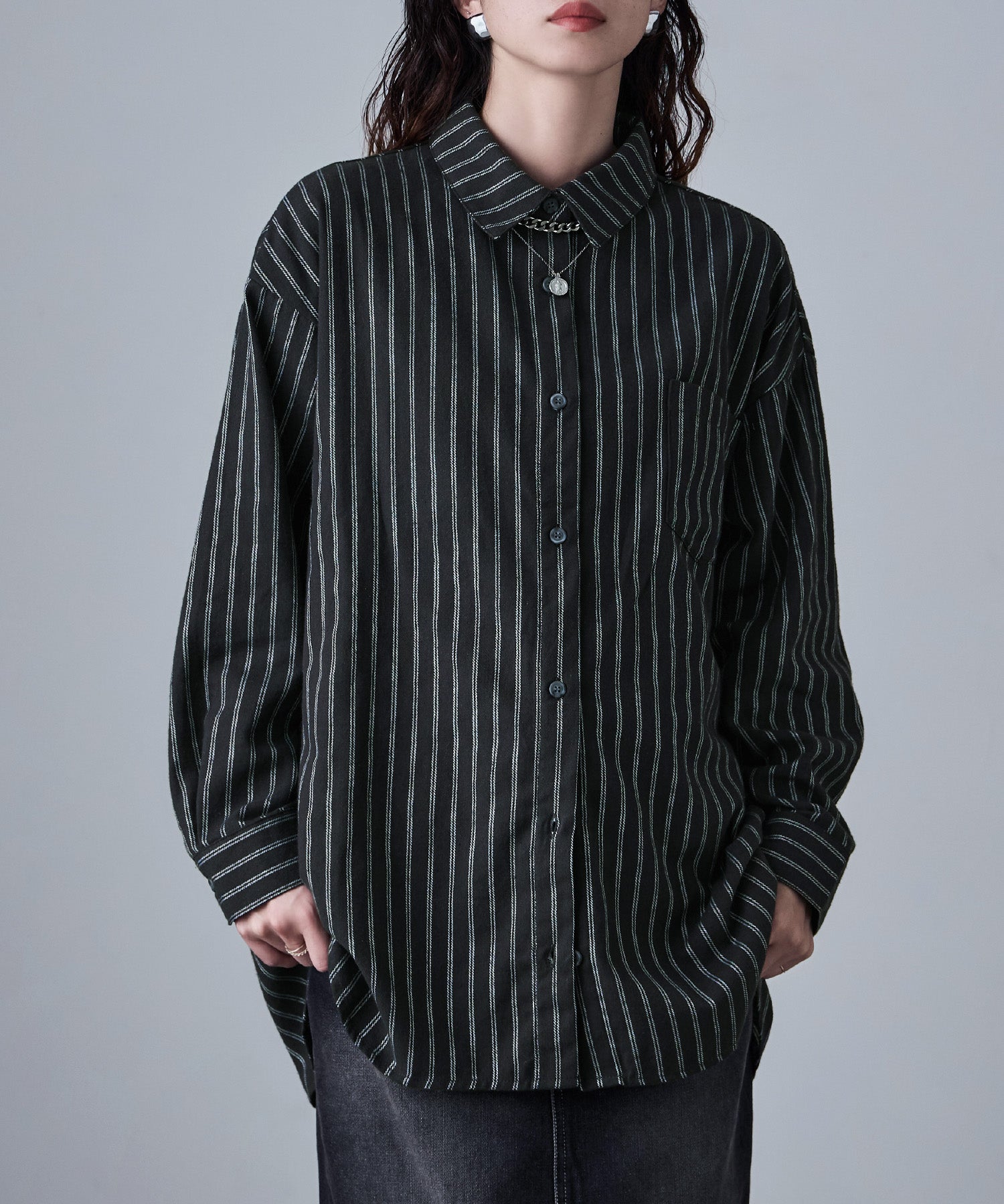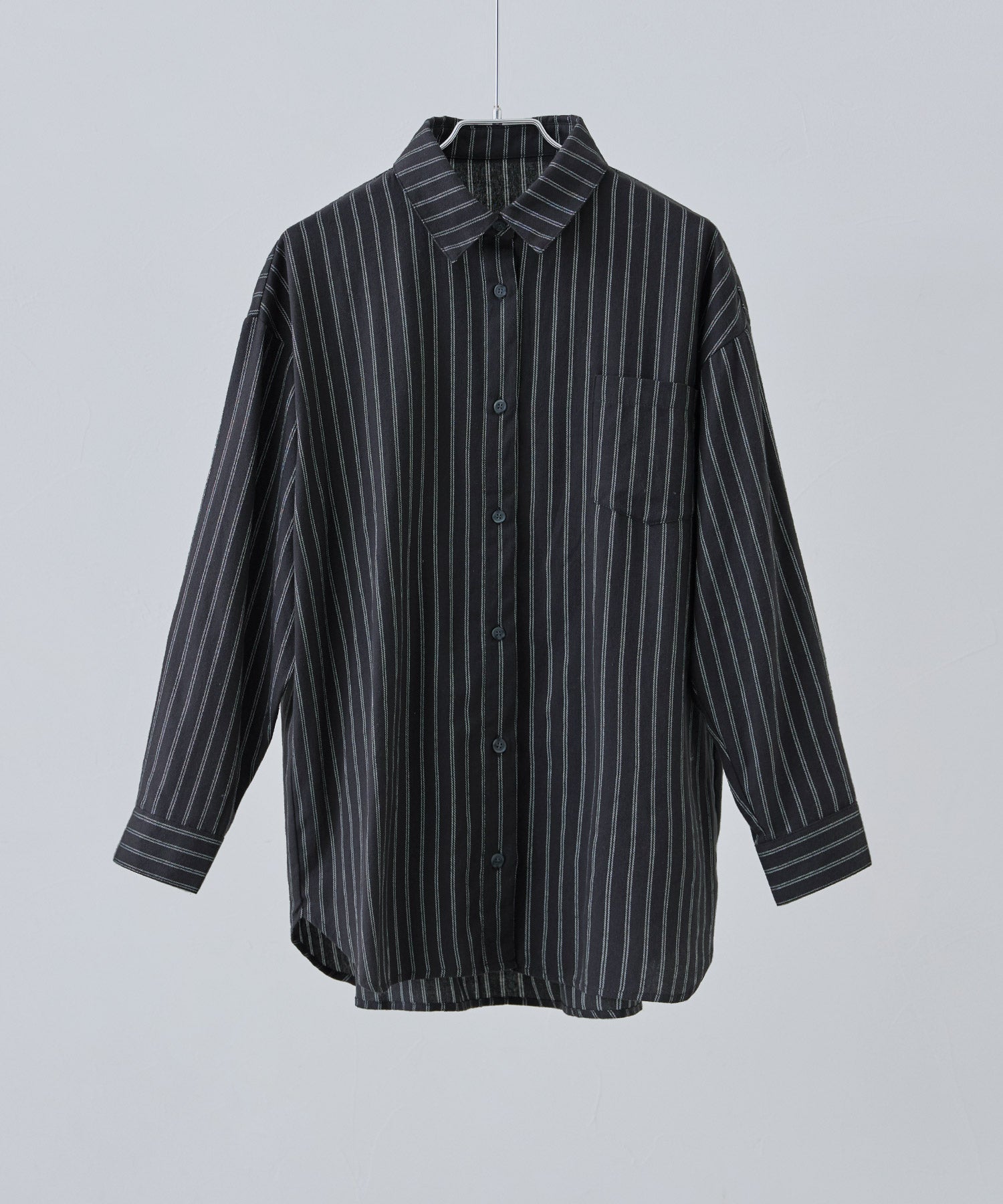 Rname ストライプコットンオーバーシャツ トップス シャツ 長袖 ストライプ 綿 綿100 ビッグシルエット オーバーサイズ レギュラーカラー 起毛 ネルシャツ レトロ 羽織り ストライプシャツ