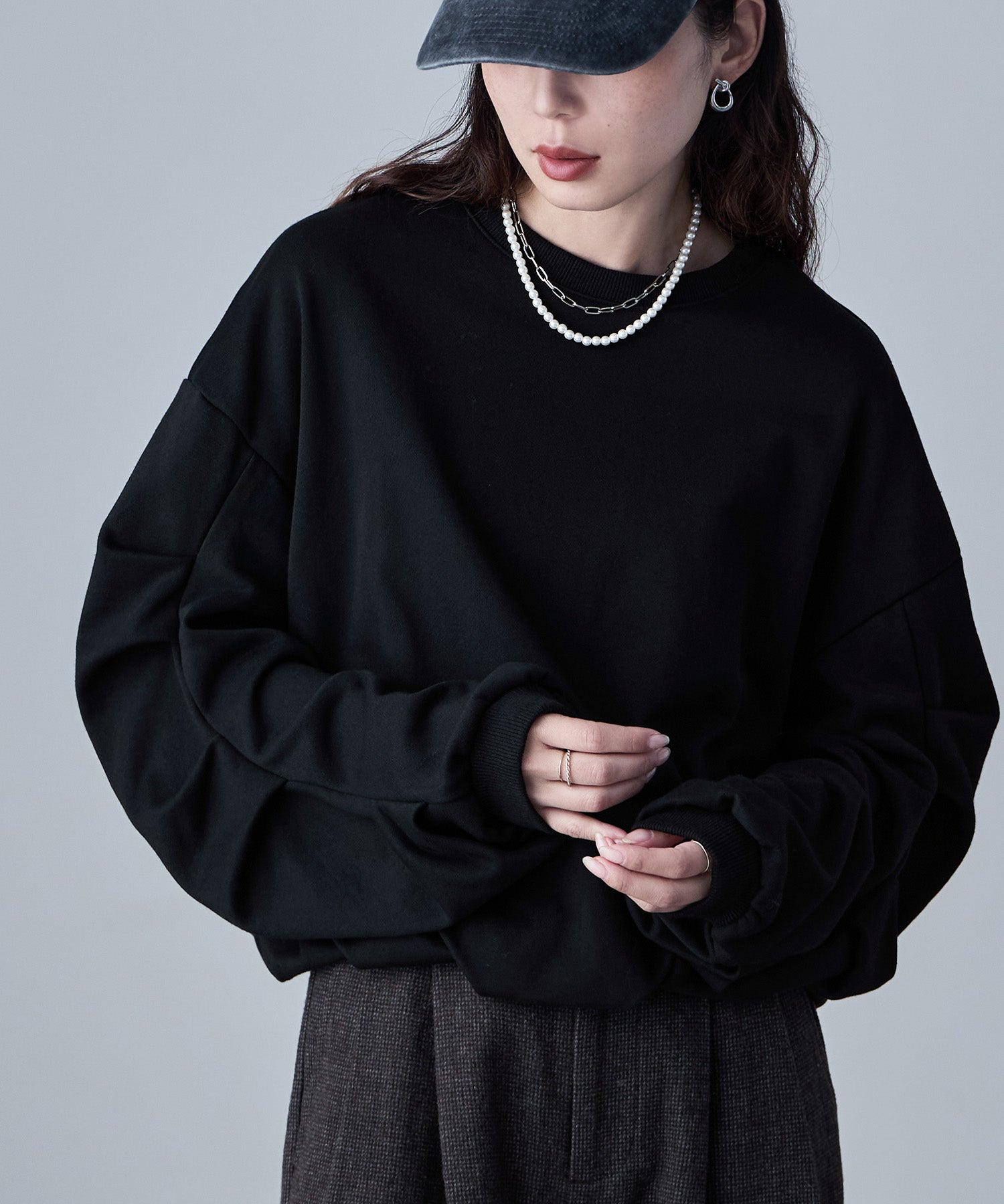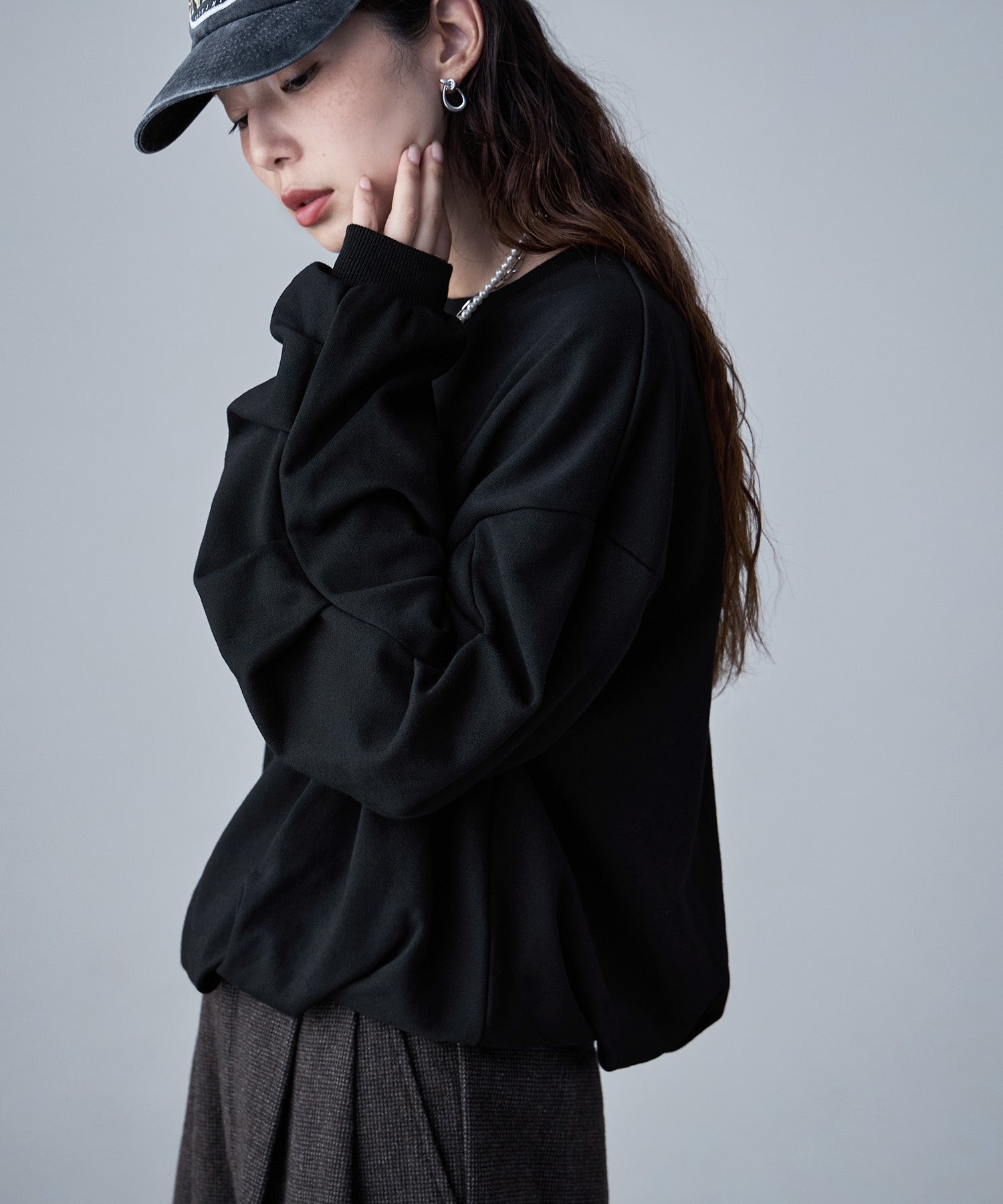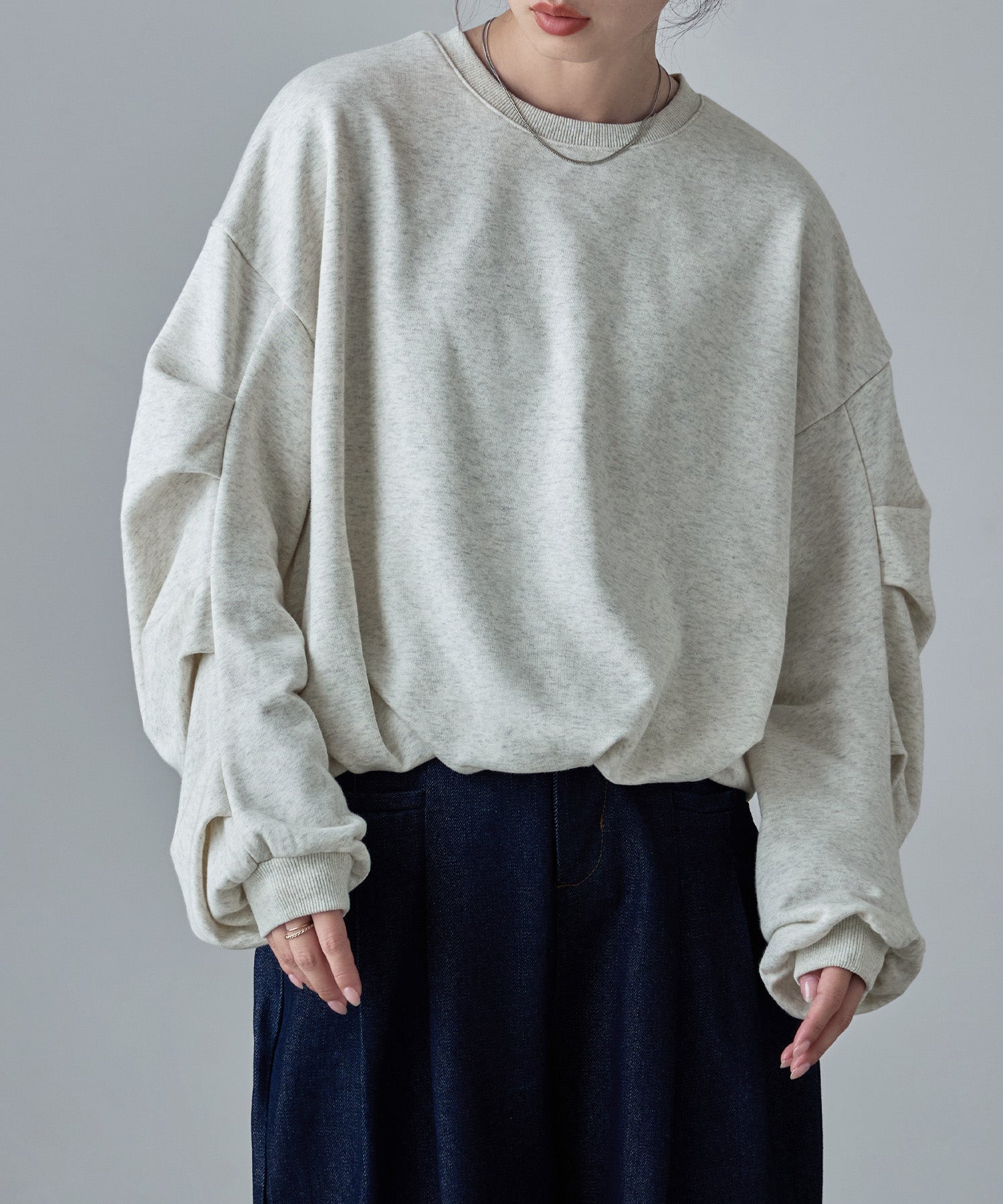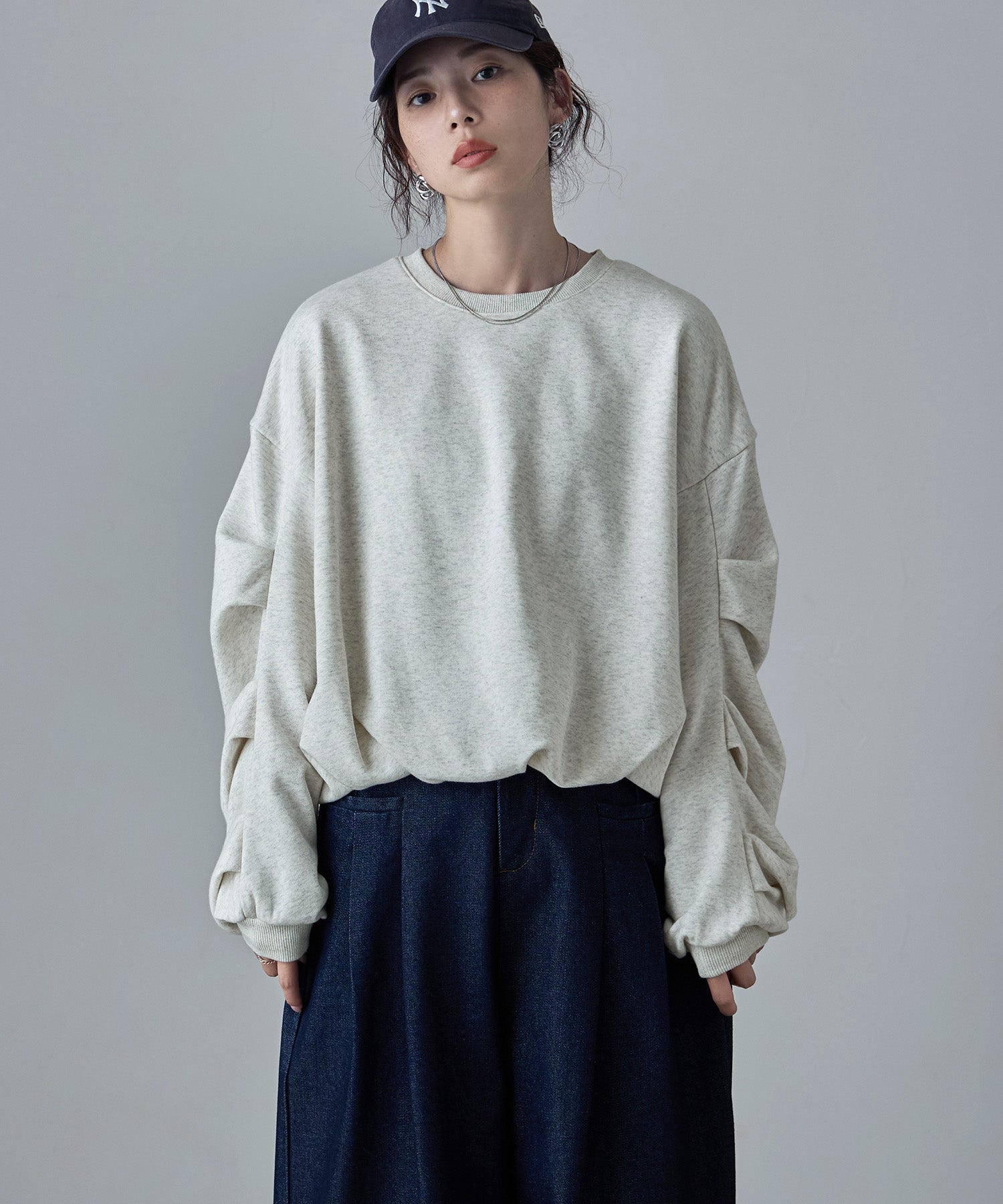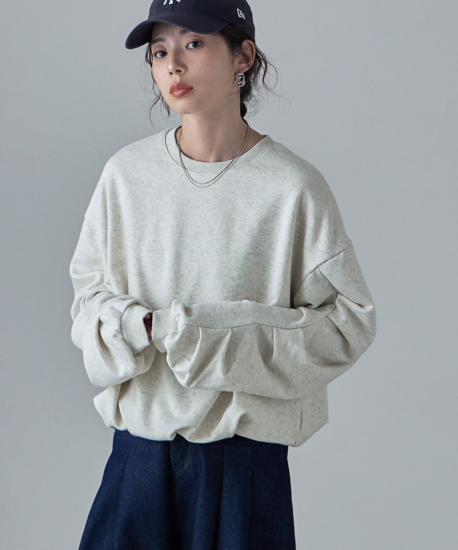 バルーンの裾と袖のタックが目にとまる立体感で、見慣れたスウェットコーデの鮮度を上げてくれます。