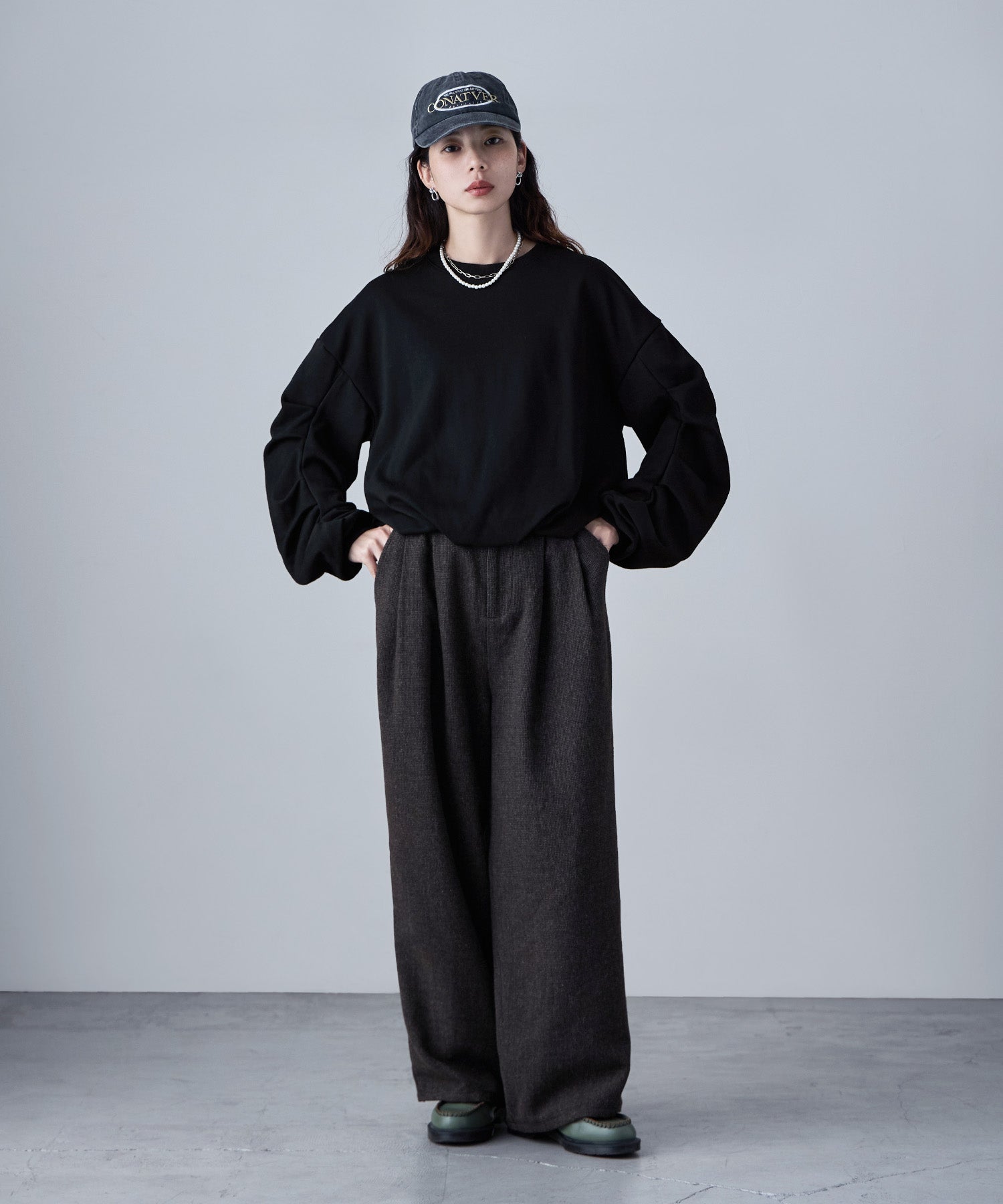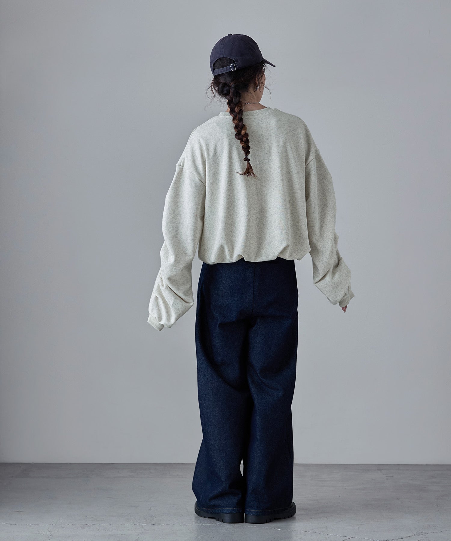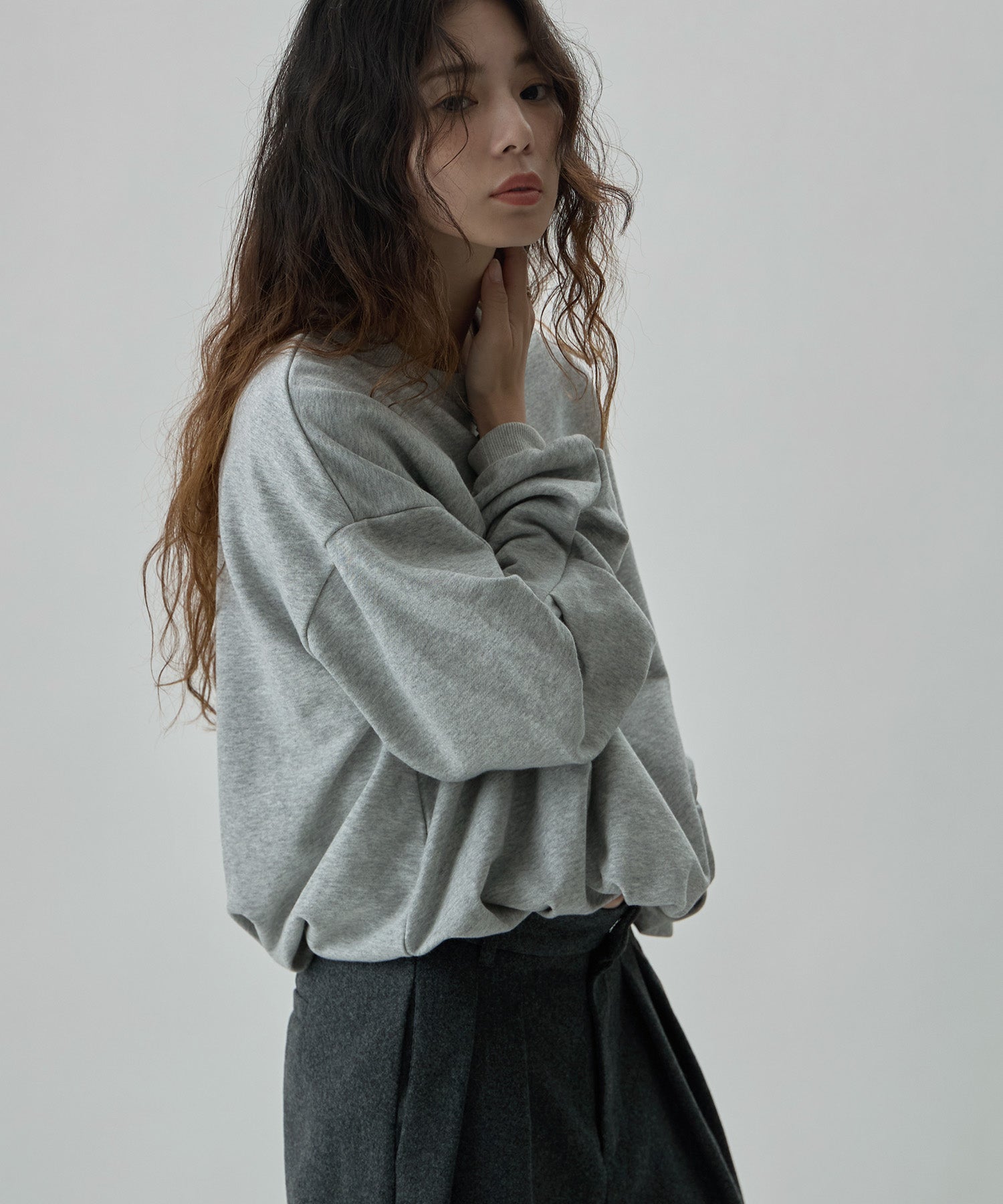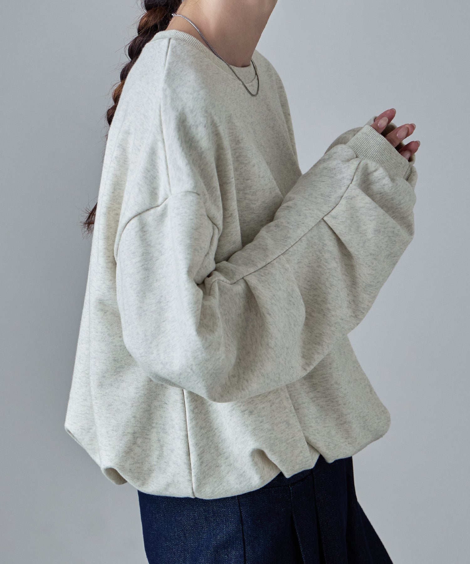 バルーンの裾と袖のタックが目にとまる立体感で、見慣れたスウェットコーデの鮮度を上げてくれます。