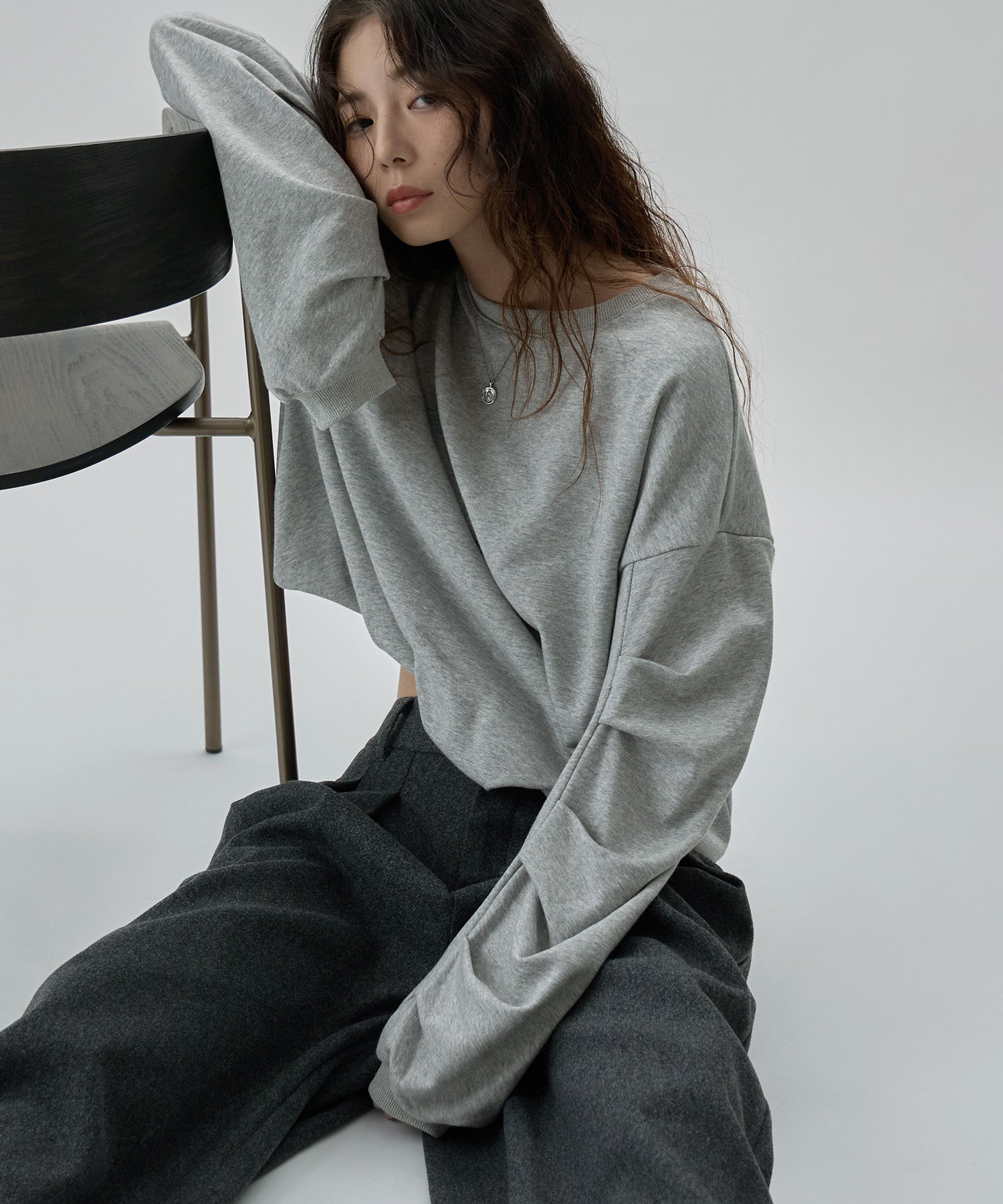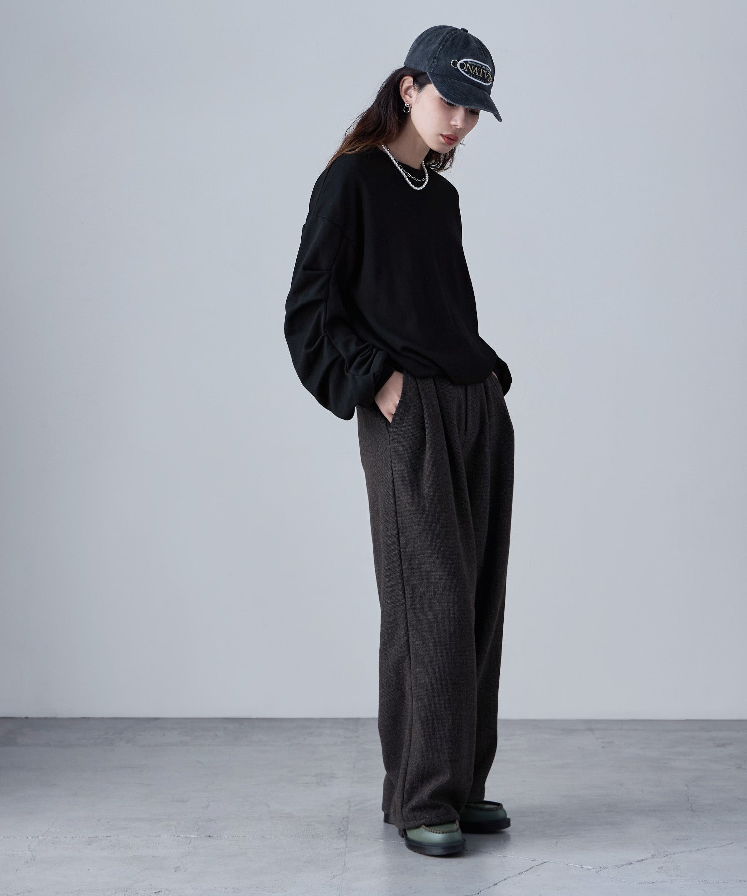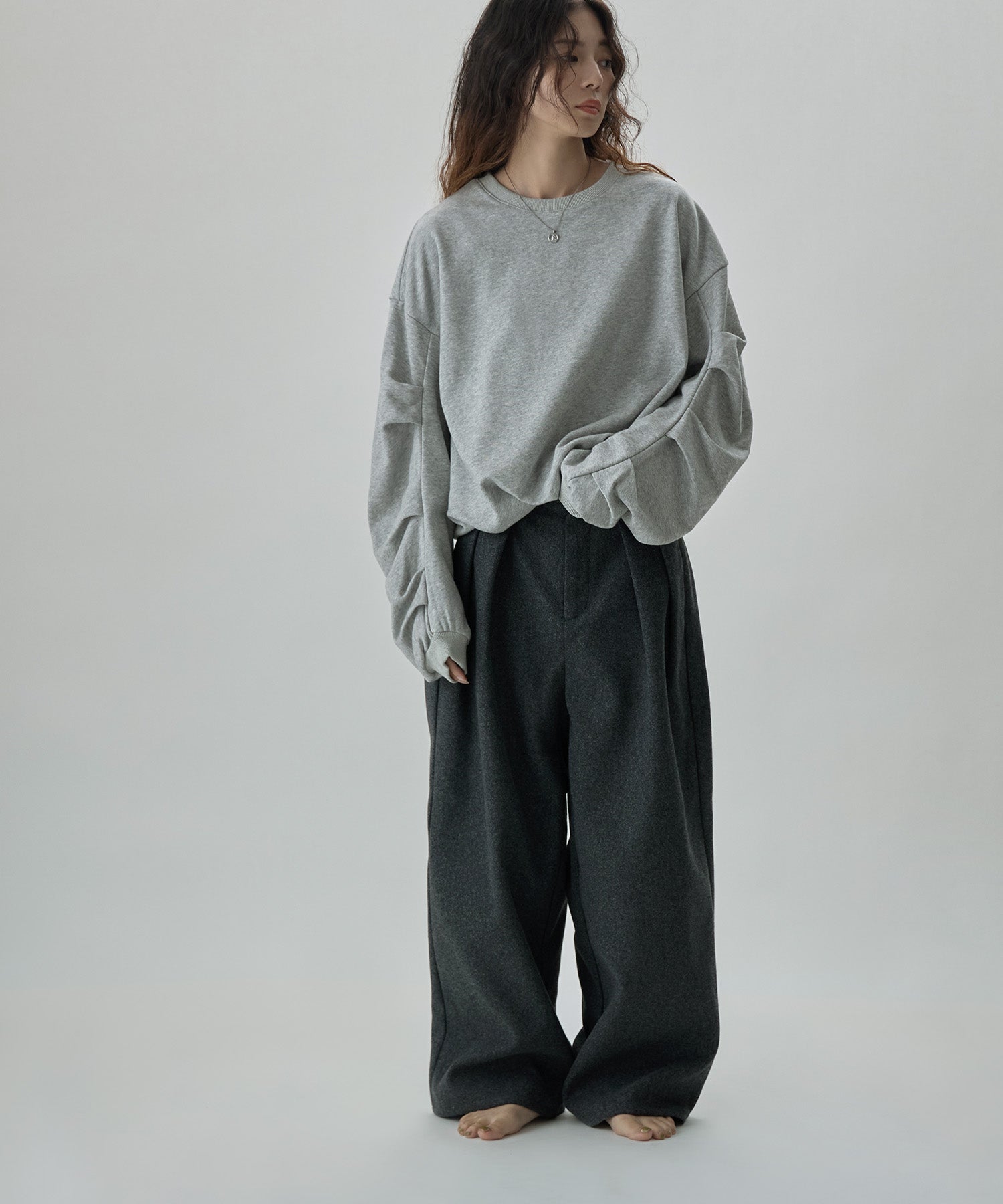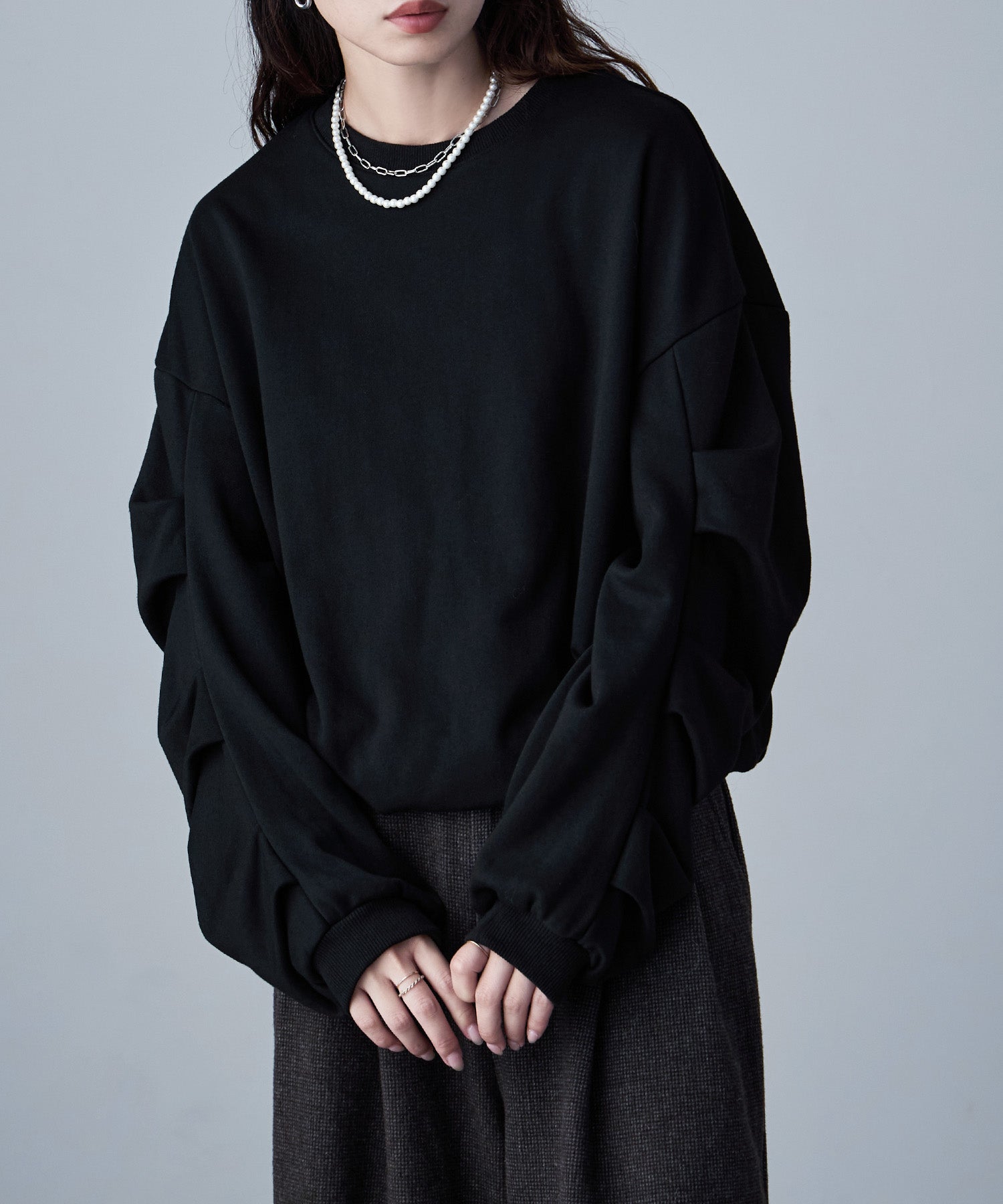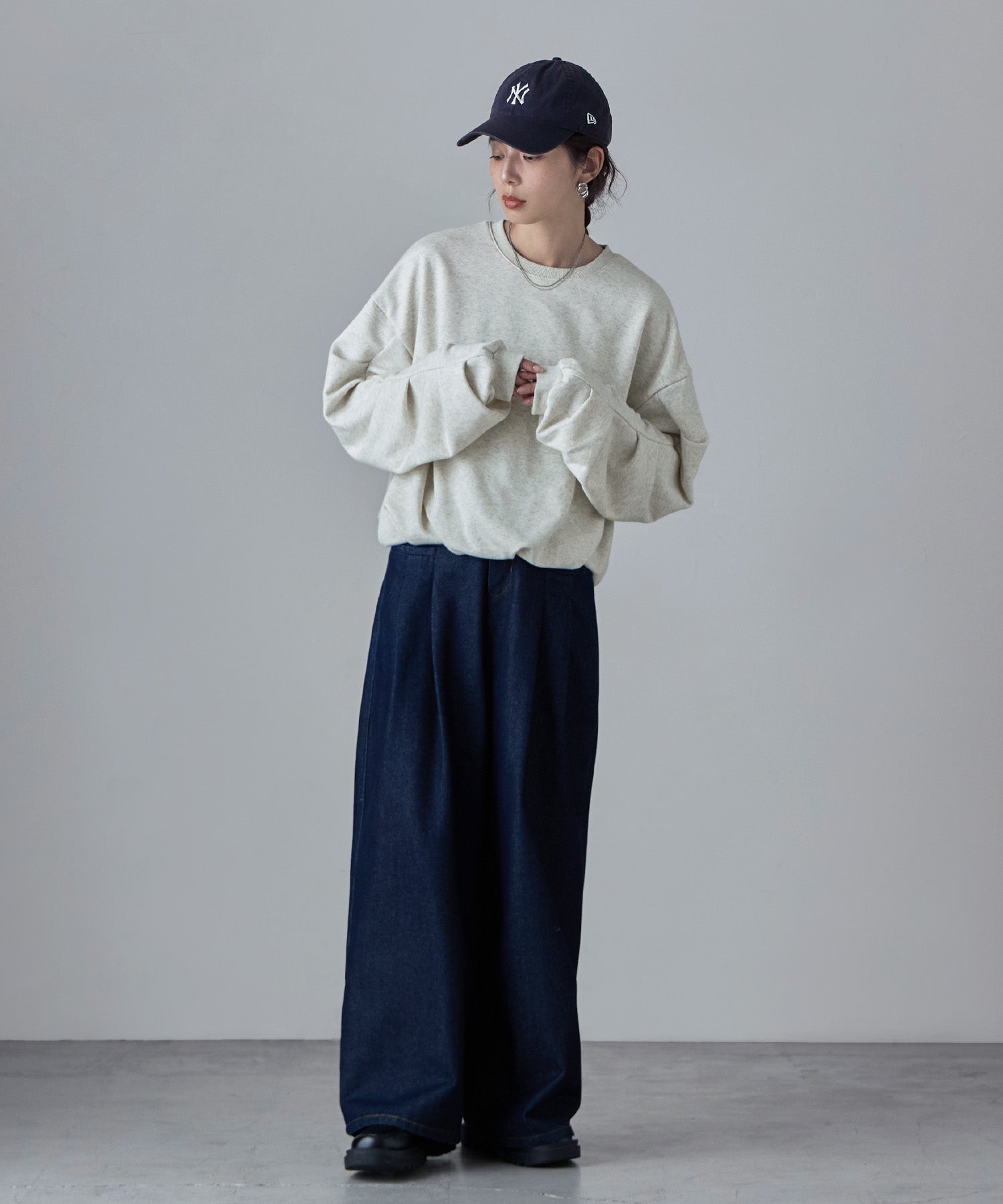 バルーンの裾と袖のタックが目にとまる立体感で、見慣れたスウェットコーデの鮮度を上げてくれます。