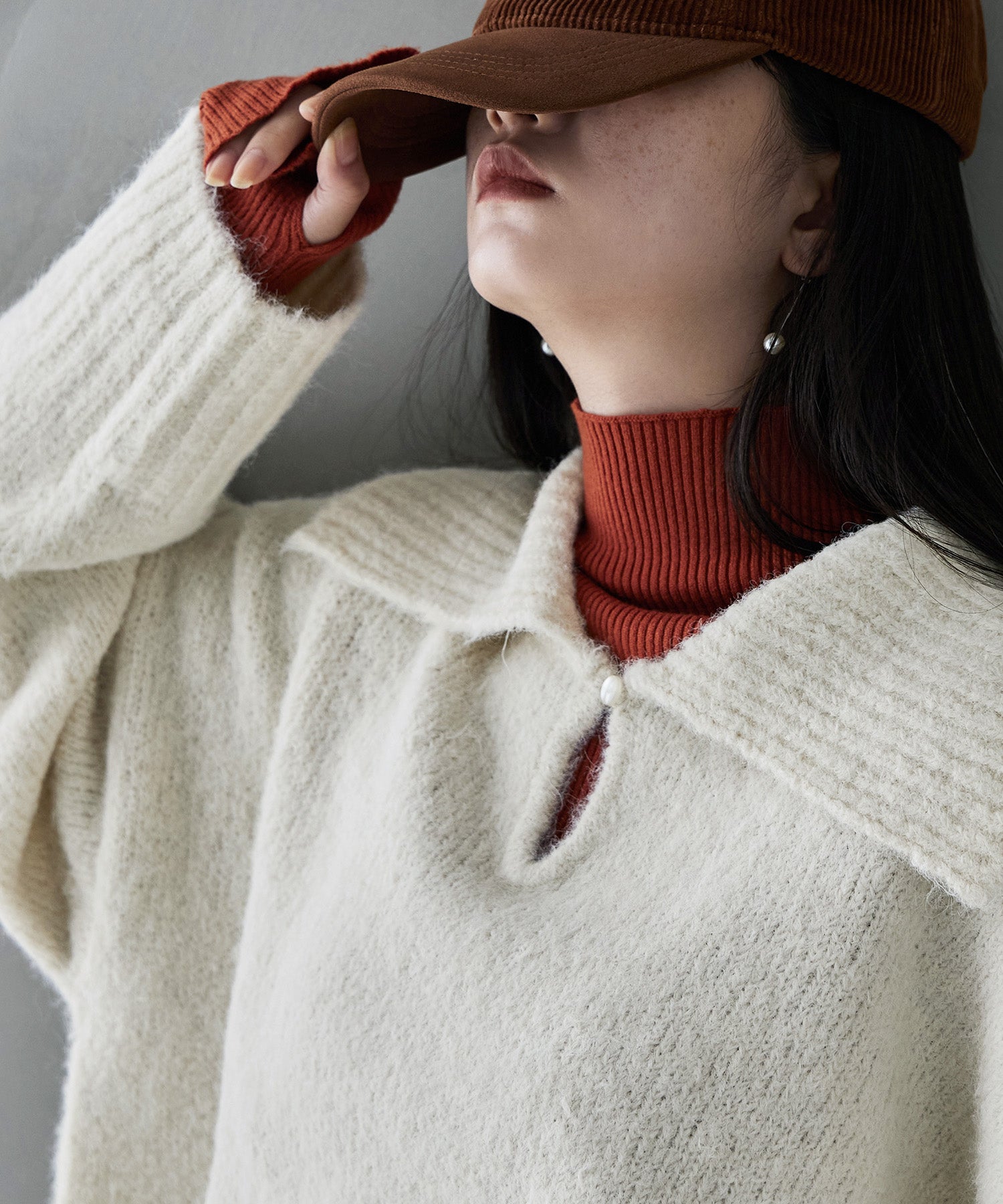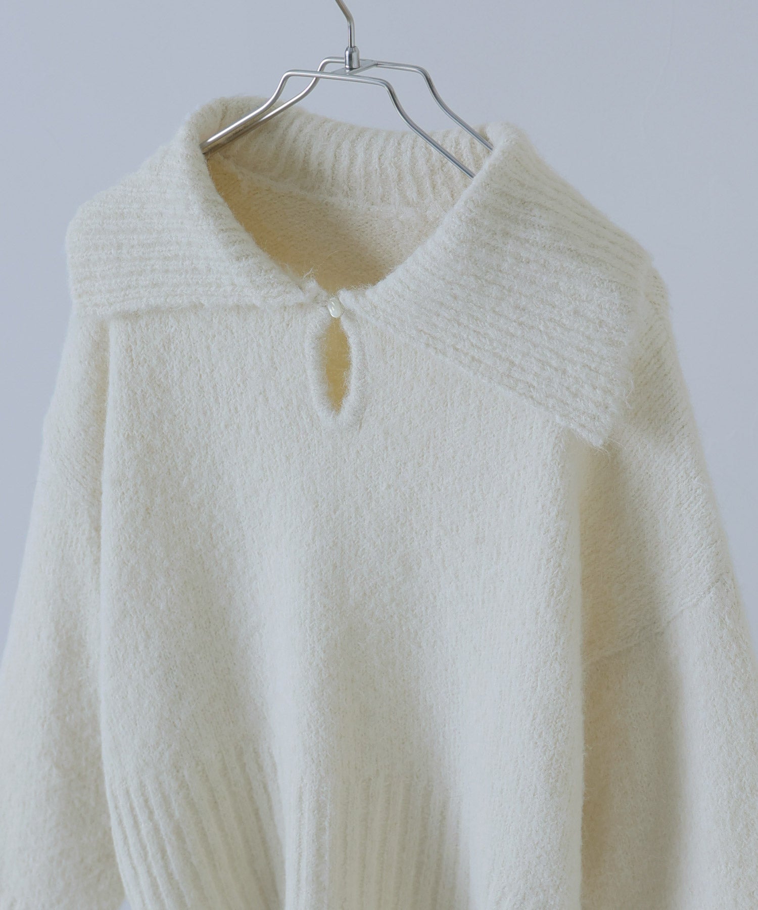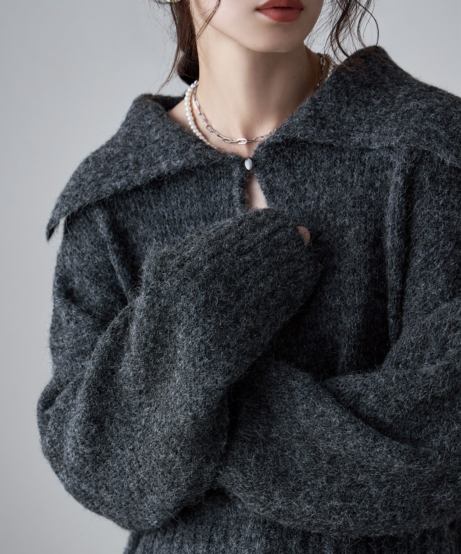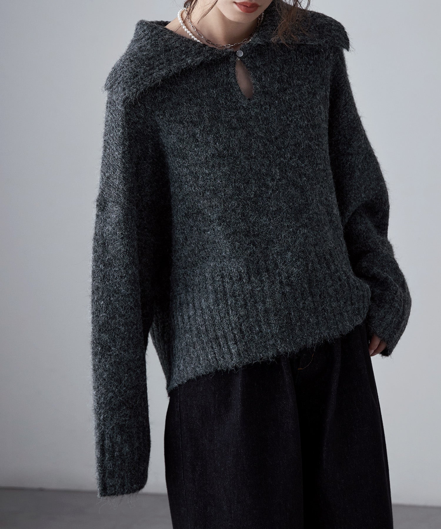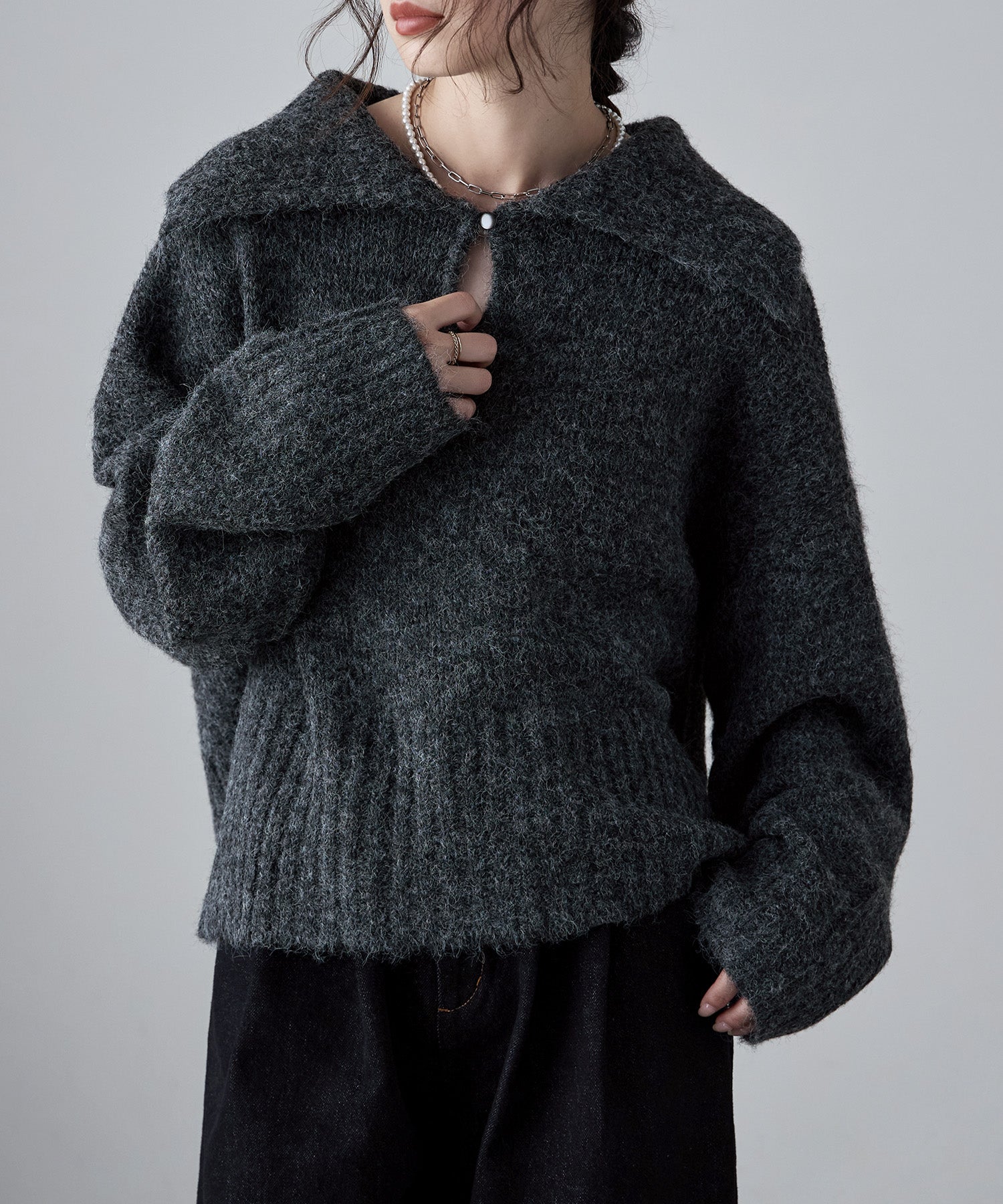 Rname アルパカタッチビッグカラーニット トップス ニット セーター 長袖 ウール混 プルオーバー リブニット セーラーカラー ウールミックス 起毛 ミドル丈 ワイドスリーブ ビッグシルエット ゆったり レイヤード 重ね着 オーバーサイズ 無地